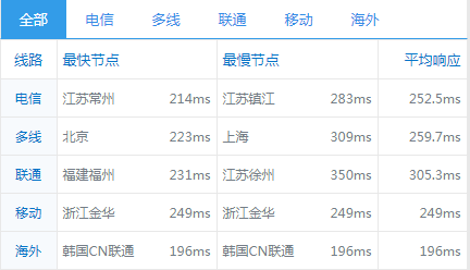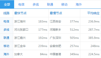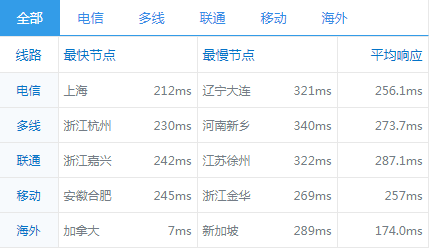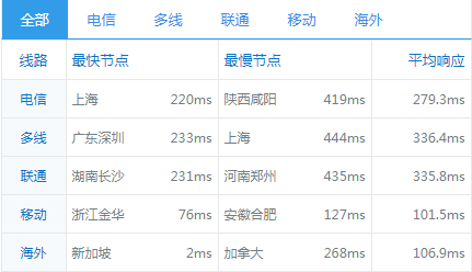 全国平均ping值在260ms左右,电信和联通访问速度要快一些,移动线路延迟相对来说比较高一些: