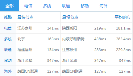 全国平均ping值在190ms左右,延迟比纽约机房低不少,其中电信线路访问较快,移动访问速度慢,具体情况如下: