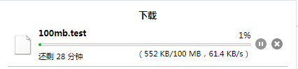 安徽移动100M文件下载速度测试,大概也在60kb/s左右,下载速度不太理想: