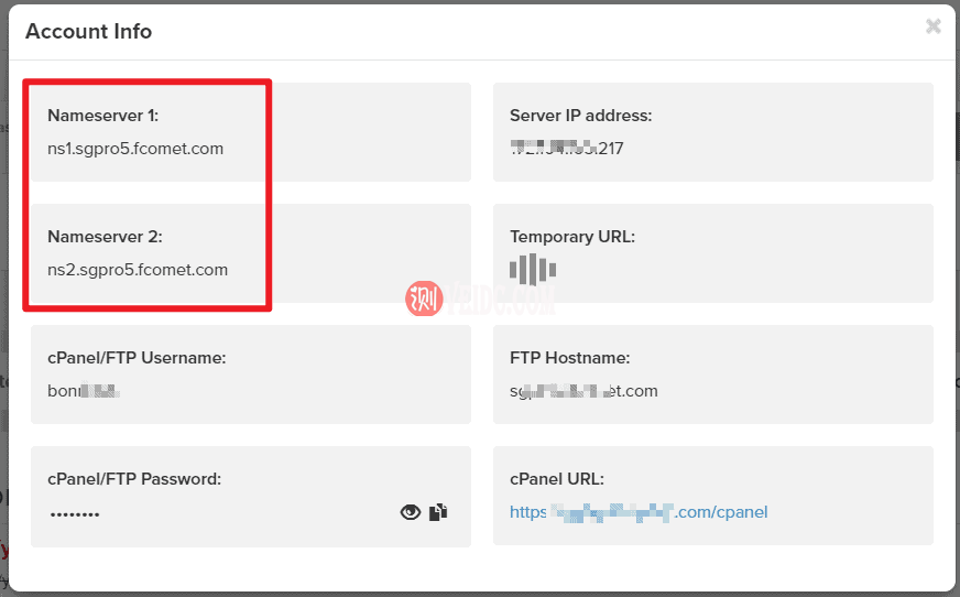 在弹出的accoutn info中,nameserver1和nameserver2就是域名服务器,复制它们替换到你现有的域名服务器中。