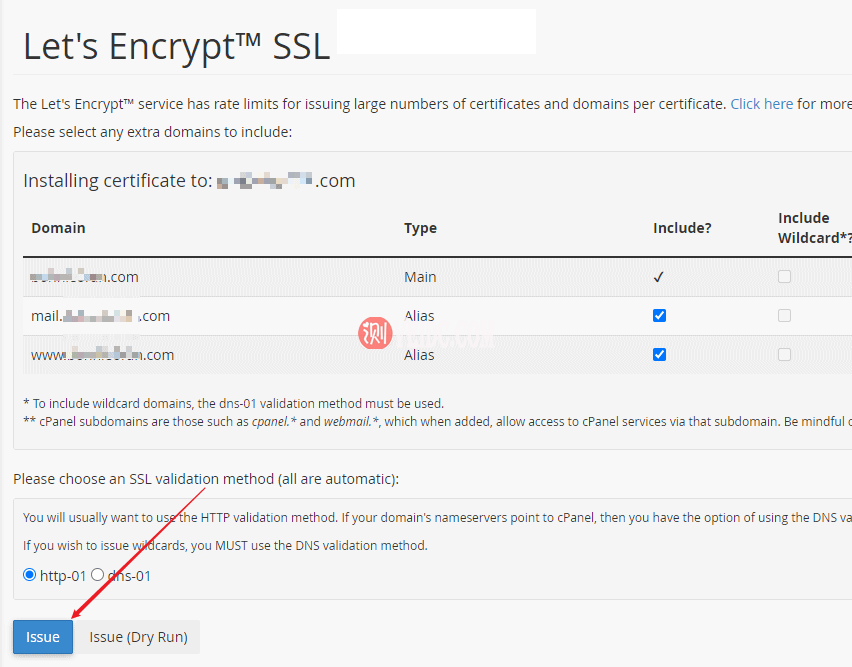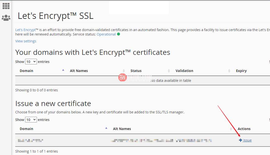 在下图的Let’s Encrypt™ SSL页面中,找到你的域名,点击右侧的+issue按钮进入