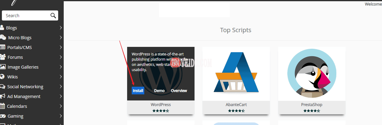 进入Softaculous后,你将看到第一个便是wordpress,点击install按钮即可进入安装wordpress引导界面。