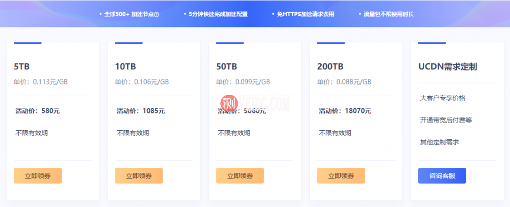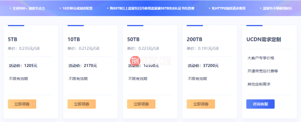 UCloud优刻得是目前唯一一家cdn流量包不限有效期的云服务商,买上一个随便用多久,UCloud云分发CDN产品名UCDN,目前有两处产品代金券优惠活动可以领。