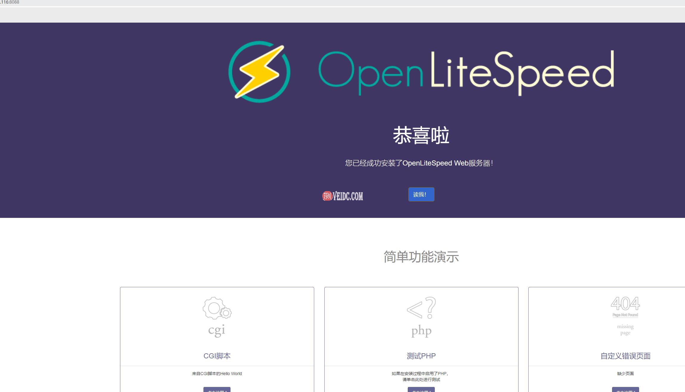 在Web浏览器中,您可以查看OpenLiteSpeed的默认网页。导航到服务器的域名或IP地址,然后指定:8088端口: