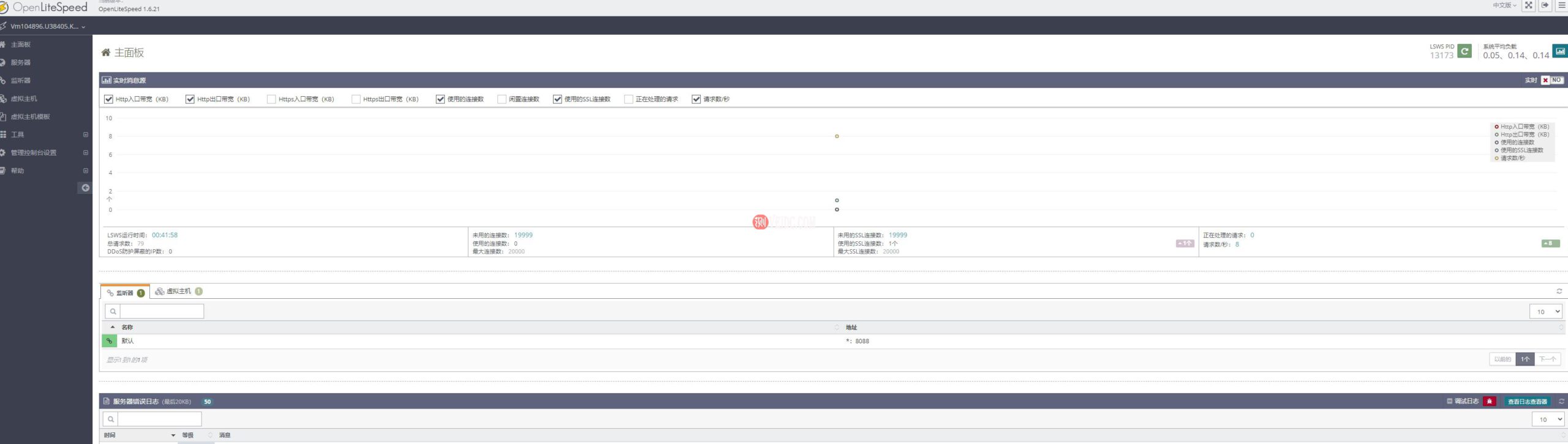 正确验证后,您将看到OpenLiteSpeed管理界面(这个就是OpenLiteSpeed的后台管理面板,主要有主面板、服务器、监听器、虚拟主机、虚拟主机模板、工具、管理控制台设置等。):