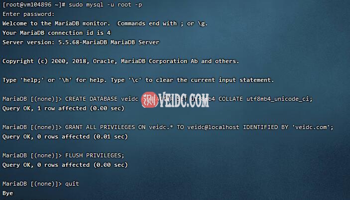 sudo mysql -u root -p CREATE DATABASE veidc CHARACTER SET utf8mb4 COLLATE utf8mb4_unicode_ci; GRANT ALL PRIVILEGES ON veidc.* TO veidc@localhost IDENTIFIED BY 'veidc.com'; FLUSH PRIVILEGES; quit