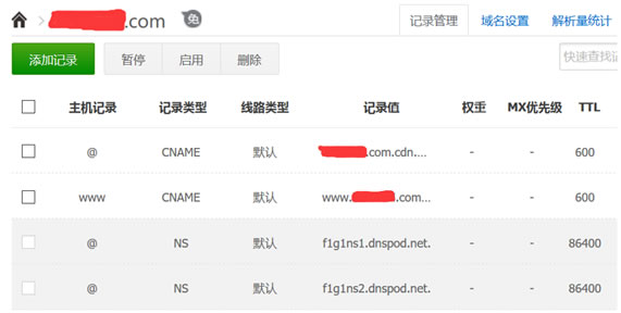比如这里老左用的测试域名使用的是DNSPOD,直接添加2个CNAME别名解析。