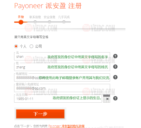 选择Payoneer账户类型(个人),填写姓名、邮箱和生日;