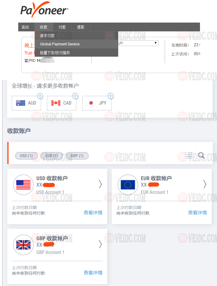全部填写完后,就等账户通过审核的邮件了。一般系统审核5分钟-2小时自动通过,会收到自动审核通 过的邮件。登陆后如果Payoneer后台,如果能在“收款”中看到“global payment service”和国外银行 账户,就是申请通过了。此时你已同时拥有美元、欧元、英镑收款帐户,如有需要还可以另外申请加元、 日元和澳元帐户,登录P卡后台把这些银行信息添加到亚马逊、CDiscount等电商平台即可开始收款。