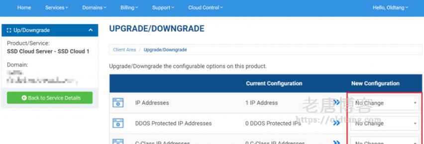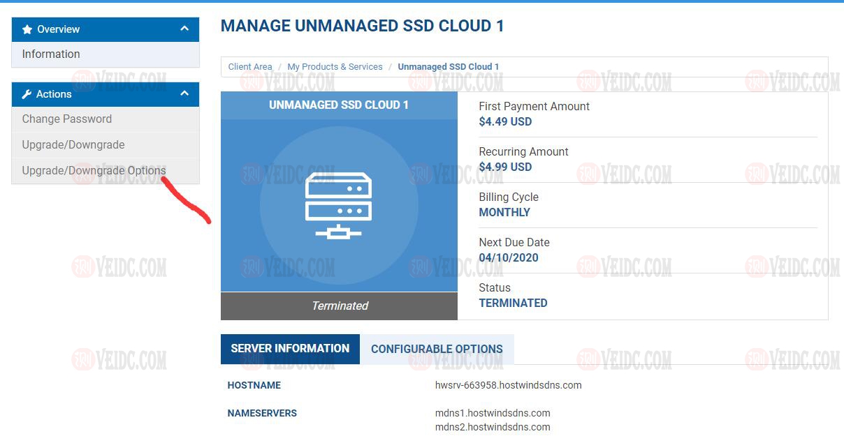 此外,如果我们已经完成了购买,那么登录 Hostwinds 官网后台,在 VPS 管理页面,可以看到 Upgrade/Downgrade Options,如图所示。