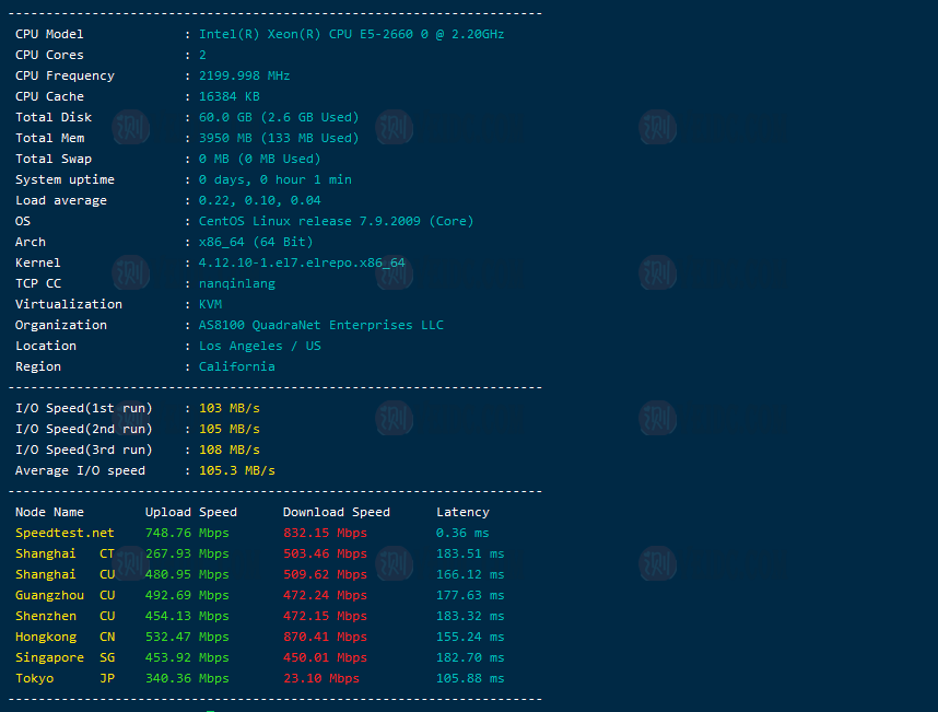 性能和带宽测试:据PacificRack说,I/O限制到100,我感觉这不可思议,这完全不必要使用RAID10) SSD,使用传统的HDD还可以降低成本。