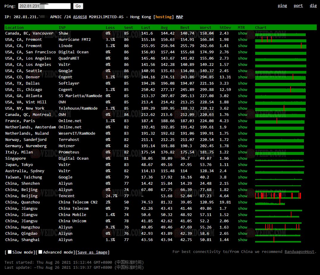 全球PING及丢包率测试: