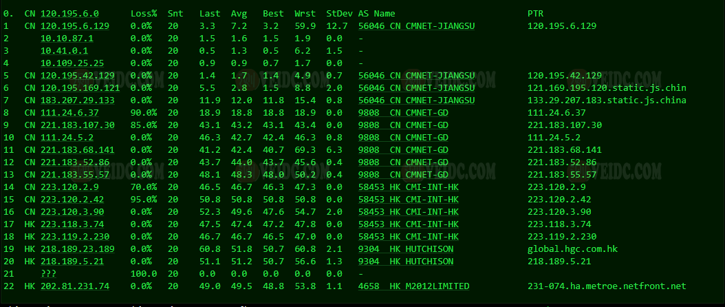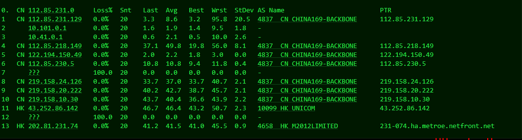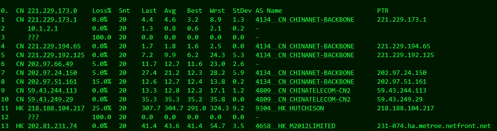 [Info] 测试路由 到 上海电信(天翼云) 中 ... traceroute to 101.227.255.45 (101.227.255.45), 30 hops max, 32 byte packets 1 * 2 * 3 218.30.56.149 30.60 ms AS4134 China, Hong Kong, ChinaTelecom 4 202.97.6.49 35.08 ms AS4134 China, Shanghai, ChinaTelecom 5 202.97.51.242 34.68 ms AS4134 China, Shanghai, ChinaTelecom 6 202.97.50.165 44.27 ms AS4134 China, Shanghai, ChinaTelecom 7 61.152.24.237 38.15 ms AS4812 China, Shanghai, ChinaTelecom 8 * 9 * 10 * 11 * 12 * 13 * 14 * 15 * 16 * 17 * 18 * 19 * 20 * 21 * 22 * 23 * 24 * 25 * 26 * 27 * 28 * 29 * 30 * [Info] 测试路由 到 上海电信(天翼云) 完成 ! [Info] 测试路由 到 厦门电信CN2 中 ... traceroute to 117.28.254.129 (117.28.254.129), 30 hops max, 32 byte packets 1 * 2 hutchcity11-100g.hkix.net (123.255.91.41) 3.45 ms * China, Hong Kong, hkix.net 3 218.188.104.218 51.88 ms AS9304 China, Hong Kong, hgc.com.hk 4 59.43.188.125 47.63 ms * China, Guangdong, Guangzhou, ChinaTelecom 5 * 6 * 7 59.43.46.214 80.07 ms * China, Fujian, ChinaTelecom 8 * 9 27.159.81.194 108.06 ms AS133775 China, Fujian, Xiamen, ChinaTelecom 10 117.25.141.110 98.94 ms AS133775 China, Fujian, Xiamen, ChinaTelecom 11 117.28.254.129 87.46 ms AS4809 China, Fujian, Xiamen, ChinaTelecom [Info] 测试路由 到 厦门电信CN2 完成 ! [Info] 测试路由 到 浙江杭州联通 中 ... traceroute to 101.71.241.238 (101.71.241.238), 30 hops max, 32 byte packets 1 * 2 * 3 * 4 * 5 * 6 219.158.40.237 205.16 ms AS4837 China, Hong Kong, ChinaUnicom 7 219.158.10.53 202.28 ms AS4837 China, Guangdong, Guangzhou, ChinaUnicom 8 219.158.97.26 200.53 ms AS4837 China, Guangdong, Guangzhou, ChinaUnicom 9 219.158.24.125 201.75 ms AS4837 China, Guangdong, Guangzhou, ChinaUnicom 10 219.158.106.70 210.86 ms AS4837 China, Zhejiang, Hangzhou, ChinaUnicom 11 101.71.244.94 207.05 ms AS4837 China, Zhejiang, Hangzhou, ChinaUnicom 12 * 13 * 14 * 15 * 16 * 17 * 18 * 19 * 20 * 21 * 22 * 23 * 24 * 25 * 26 * 27 * 28 * 29 * 30 * [Info] 测试路由 到 浙江杭州联通 完成 ! [Info] 测试路由 到 浙江杭州移动 中 ... traceroute to 112.17.0.106 (112.17.0.106), 30 hops max, 32 byte packets 1 * 2 * 3 * 4 * 5 * 6 221.183.55.34 36.38 ms AS9808 China, Shanghai, ChinaMobile 7 221.183.25.193 36.30 ms AS9808 China, Shanghai, ChinaMobile 8 221.183.23.25 39.20 ms AS9808 China, Shanghai, ChinaMobile 9 111.24.3.93 45.11 ms AS9808 China, Shanghai, ChinaMobile 10 111.24.3.30 41.31 ms AS9808 China, Zhejiang, Hangzhou, ChinaMobile 11 * 12 112.17.253.110 40.38 ms AS56041 China, Zhejiang, Hangzhou, ChinaMobile 13 * 14 * 15 * 16 * 17 * 18 * 19 * 20 * 21 * 22 * 23 * 24 * 25 * 26 * 27 * 28 * 29 * 30 * [Info] 测试路由 到 浙江杭州移动 完成 ! [Info] 测试路由 到 北京教育网 中 ... traceroute to 202.205.6.30 (202.205.6.30), 30 hops max, 32 byte packets 1 * 2 cernetedu1-lacp-10g.hkix.net (123.255.91.118) 4.05 ms * China, Hong Kong, hkix.net 3 101.4.114.181 38.13 ms AS4538 China, Beijing, CHINAEDU 4 * 5 * 6 101.4.118.213 41.65 ms AS4538 China, Beijing, CHINAEDU 7 101.4.113.110 40.36 ms AS4538 China, Beijing, CHINAEDU 8 219.224.102.230 41.99 ms AS4538 China, Beijing, CHINAEDU 9 * 10 * 11 101.4.130.54 45.02 ms AS133111 China, Beijing, CHINAEDU 12 * 13 101.4.130.54 42.75 ms AS133111 China, Beijing, CHINAEDU 14 * 15 101.4.130.54 43.03 ms AS133111 China, Beijing, CHINAEDU 16 * 17 101.4.130.54 42.56 ms AS133111 China, Beijing, CHINAEDU 18 101.4.130.53 41.35 ms AS133111 China, Beijing, CHINAEDU 19 101.4.130.54 43.26 ms AS133111 China, Beijing, CHINAEDU 20 * 21 * 22 101.4.130.53 41.67 ms AS133111 China, Beijing, CHINAEDU 23 101.4.130.54 43.18 ms AS133111 China, Beijing, CHINAEDU 24 * 25 * 26 101.4.130.53 41.82 ms AS133111 China, Beijing, CHINAEDU 27 * 28 * 29 * 30 * [Info] 测试路由 到 北京教育网 完成 ! [Info] 四网路由快速测试 已完成 !