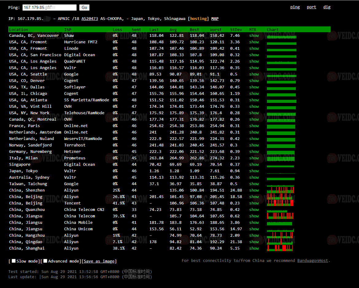 全球PING及丢包率测试: