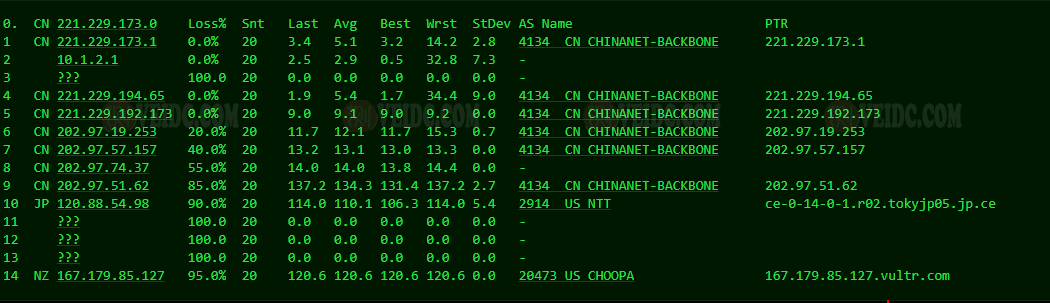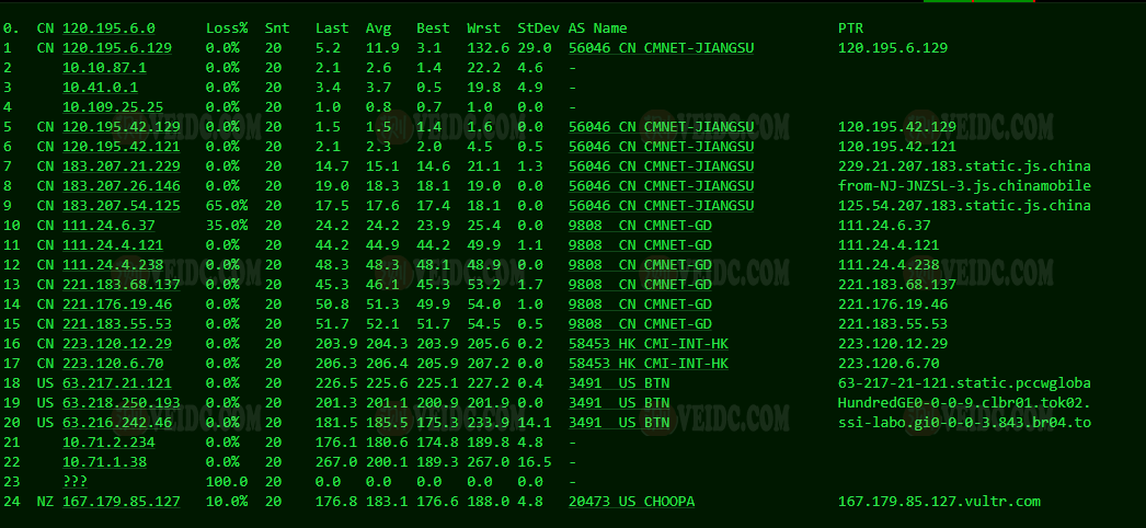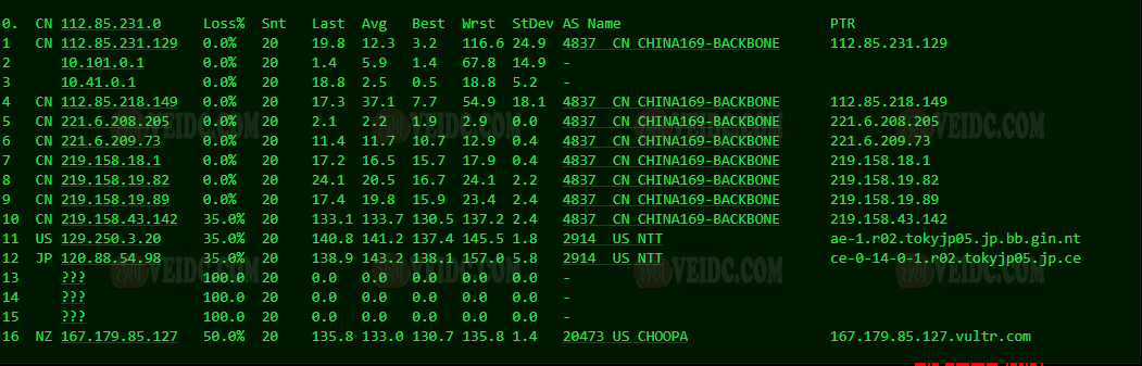 [Info] 测试路由 到 上海电信(天翼云) 中 ... traceroute to 101.227.255.45 (101.227.255.45), 30 hops max, 32 byte packets 1 * 2 vl199-ds1-j2-r136.tyo2.constant.com (173.199.81.1) 14.84 ms AS20473 日本, 东京都, 东京, choopa.com 3 * 4 * 5 tky-b1-link.ip.twelve99.net (62.115.41.150) 0.63 ms AS1299 日本, 东京都, 东京, telia.com 6 sjo-b23-link.ip.twelve99.net (62.115.123.140) 106.83 ms AS1299 美国, 加利福尼亚州, 圣何塞, telia.com 7 218.30.54.181 107.69 ms AS4134 美国, 加利福尼亚州, 圣何塞, chinatelecom.com.cn, 电信 8 202.97.6.1 139.77 ms AS4134 中国, 上海, chinatelecom.com.cn, 电信 9 202.97.12.202 139.47 ms AS4134 中国, 上海, chinatelecom.com.cn, 电信 10 * 11 * 12 * 13 * 14 * 15 * 16 * 17 * 18 * 19 * 20 * 21 * 22 * 23 * 24 * 25 * 26 * 27 * 28 * 29 * 30 * [Info] 测试路由 到 上海电信(天翼云) 完成 ! [Info] 测试路由 到 厦门电信CN2 中 ... traceroute to 117.28.254.129 (117.28.254.129), 30 hops max, 32 byte packets 1 * 2 vl199-ds1-j2-r136.tyo2.constant.com (173.199.81.1) 14.42 ms AS20473 日本, 东京都, 东京, choopa.com 3 * 4 * 5 gi0-0-0-3.843.br04.tok01.pccwbtn.net (63.216.242.45) 0.63 ms AS3491,AS31713 日本, 东京都, 东京, pccw.com 6 TenGE0-1-0-5.br03.hkg15.pccwbtn.net (63.218.210.138) 53.24 ms AS3491,AS31713 中国, 香港, pccw.com 7 TenGE0-1-0-5.br03.hkg15.pccwbtn.net (63.218.210.138) 51.44 ms AS3491,AS31713 中国, 香港, pccw.com 8 63-218-211-10.static.pccwglobal.net (63.218.211.10) 50.94 ms AS3491,AS31713 中国, 香港, pccw.com 9 59.43.248.201 55.21 ms * 中国, 广东, 广州, chinatelecom.com.cn, 电信 10 * 11 * 12 59.43.46.214 71.95 ms * 中国, 福建, chinatelecom.com.cn, 电信 13 * 14 27.159.81.190 67.47 ms AS133775 中国, 福建, 厦门, chinatelecom.com.cn, 电信 15 117.25.141.106 79.67 ms AS133775 中国, 福建, 厦门, chinatelecom.com.cn, 电信 16 117.28.254.129 76.25 ms AS4809 中国, 福建, 厦门, chinatelecom.com.cn, 电信 [Info] 测试路由 到 厦门电信CN2 完成 ! [Info] 测试路由 到 浙江杭州联通 中 ... traceroute to 101.71.241.238 (101.71.241.238), 30 hops max, 32 byte packets 1 * 2 vl199-ds1-j2-r136.tyo2.constant.com (173.199.81.1) 22.16 ms AS20473 日本, 东京都, 东京, choopa.com 3 * 4 * 5 * 6 ce-0-14-0-1.r02.tokyjp05.jp.bb.gin.ntt.net (120.88.54.97) 1.06 ms AS2914 日本, 东京都, 东京, ntt.com 7 ae-1.r03.tokyjp05.jp.bb.gin.ntt.net (129.250.3.21) 1.25 ms AS2914 日本, 东京都, 东京, ntt.com 8 219.158.38.97 40.95 ms AS4837 中国, 上海, chinaunicom.com, 联通 9 219.158.8.181 42.26 ms AS4837 中国, 广东, 广州, chinaunicom.com, 联通 10 219.158.7.129 38.81 ms AS4837 中国, 上海, chinaunicom.com, 联通 11 219.158.115.150 38.52 ms AS4837 中国, 浙江, 杭州, chinaunicom.com, 联通 12 * 13 * 14 * 15 * 16 * 17 * 18 * 19 * 20 * 21 * 22 * 23 * 24 * 25 * 26 * 27 * 28 * 29 * 30 * [Info] 测试路由 到 浙江杭州联通 完成 ! [Info] 测试路由 到 浙江杭州移动 中 ... traceroute to 112.17.0.106 (112.17.0.106), 30 hops max, 32 byte packets 1 * 2 vl199-ds1-j2-r136.tyo2.constant.com (173.199.81.1) 15.09 ms AS20473 日本, 东京都, 东京, choopa.com 3 * 4 * 5 ce-0-14-0-1.r02.tokyjp05.jp.bb.gin.ntt.net (120.88.54.97) 1.08 ms AS2914 日本, 东京都, 东京, ntt.com 6 ae-3.r30.tokyjp05.jp.bb.gin.ntt.net (129.250.3.23) 3.20 ms AS2914 日本, 东京都, 东京, ntt.com 7 ae-2.r26.tkokhk01.hk.bb.gin.ntt.net (129.250.2.51) 47.58 ms AS2914 中国, 香港, ntt.com 8 ae-0.a02.tkokhk01.hk.bb.gin.ntt.net (129.250.5.33) 43.64 ms AS2914 中国, 香港, ntt.com 9 * 10 * 11 * 12 * 13 * 14 * 15 * 16 * 17 111.24.3.30 96.62 ms AS9808 中国, 浙江, 杭州, chinamobile.com, 移动 18 * 19 * 20 * 21 * 22 * 23 * 24 * 25 * 26 * 27 * 28 * 29 * 30 * [Info] 测试路由 到 浙江杭州移动 完成 ! [Info] 测试路由 到 北京教育网 中 ... traceroute to 202.205.6.30 (202.205.6.30), 30 hops max, 32 byte packets 1 * 2 vl199-ds1-j2-r136.tyo2.constant.com (173.199.81.1) 14.51 ms AS20473 日本, 东京都, 东京, choopa.com 3 * 4 * 5 * 6 gi0-0-0-3.843.br04.tok01.pccwbtn.net (63.216.242.45) 0.64 ms AS3491,AS31713 日本, 东京都, 东京, pccw.com 7 HundredGE0-4-0-2.br02.tok02.pccwbtn.net (63.218.250.190) 0.96 ms AS3491,AS31713 日本, 东京都, 东京, pccw.com 8 ix-ae-16-0.tcore1.tv2-tokyo.as6453.net (120.29.217.109) 0.42 ms AS6453 日本, 东京都, 东京, tatacommunications.com 9 if-et-23-2.hcore1.kv8-chiba.as6453.net (180.87.180.13) 2.73 ms AS6453 日本, 千叶县, 千叶市, tatacommunications.com 10 if-ae-6-2.tcore1.sv1-santaclara.as6453.net (63.243.250.56) 109.15 ms AS6453 美国, 加利福尼亚州, 圣克拉拉, tatacommunications.com 11 if-ae-8-3.tcore1.lvw-losangeles.as6453.net (63.243.250.59) 108.84 ms AS6453 美国, 加利福尼亚州, 洛杉矶, tatacommunications.com 12 66.110.59.182 170.22 ms AS6453 美国, 加利福尼亚州, 洛杉矶, tatacommunications.com 13 101.4.117.213 172.73 ms AS4538 中国, 北京, edu.cn, 教育网 14 * 15 101.4.118.213 170.55 ms AS4538 中国, 北京, edu.cn, 教育网 16 101.4.113.110 169.62 ms AS4538 中国, 北京, edu.cn, 教育网 17 219.224.102.230 237.56 ms AS4538 中国, 北京, edu.cn, 教育网 18 * 19 * 20 101.4.130.54 170.98 ms AS133111 中国, 北京, edu.cn, 教育网 21 * 22 101.4.130.54 173.53 ms AS133111 中国, 北京, edu.cn, 教育网 23 101.4.130.53 170.50 ms AS133111 中国, 北京, edu.cn, 教育网 24 * 25 * 26 * 27 * 28 * 29 101.4.130.53 177.57 ms AS133111 中国, 北京, edu.cn, 教育网 30 * [Info] 测试路由 到 北京教育网 完成 ! [Info] 四网路由快速测试 已完成 !