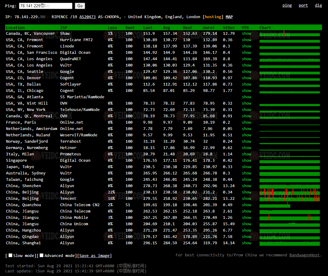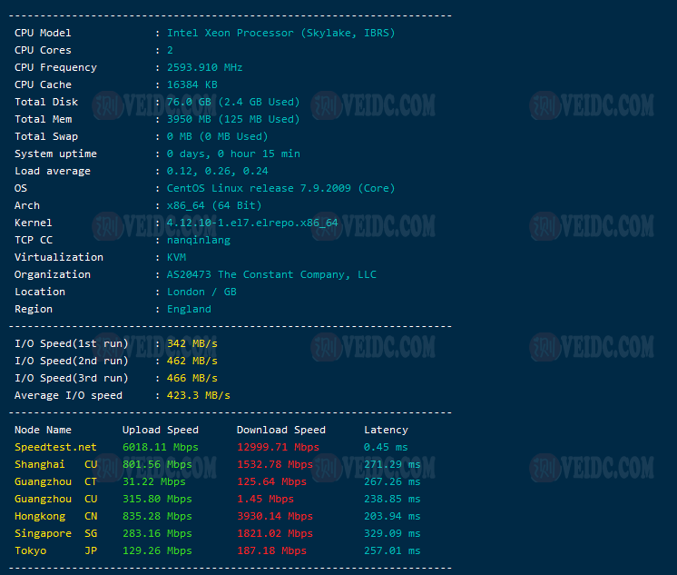 Vultr目前在全球有17个机房,分布在北美、欧洲、亚洲、澳大利亚等地区,覆盖范围广,为了方便广大站长们选择,本文分享 Vultr 英国伦敦机房的速度、延迟、丢包率、路由跟踪测试结果信息。测评说明:本站所有测评数据基本都是在安装了BBR和KCPTUN的前提下进行的,站长经常使用的BBR:南琴浪版暴力魔改BBR一键安装脚本 附加速50倍效果图 和 超级加速工具KCPTUN一键安装脚本 附100倍加速效果图。Vultr测评机器配置均为:2核4G内存80G存储,月流量3000GB。