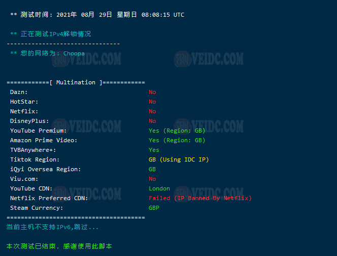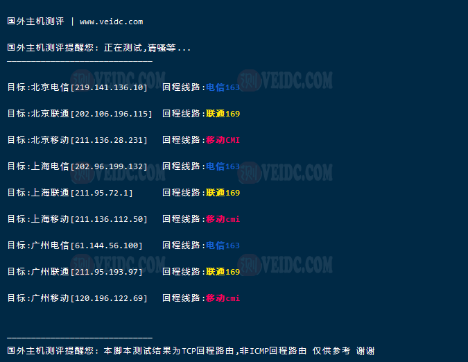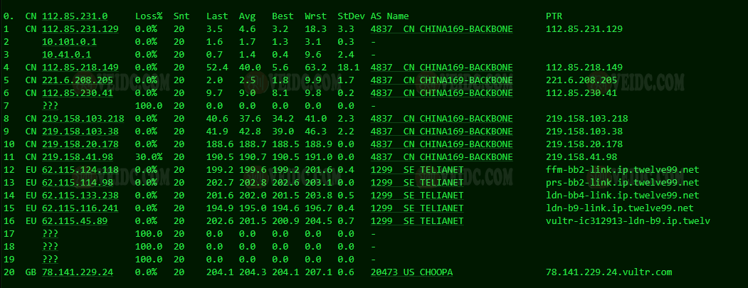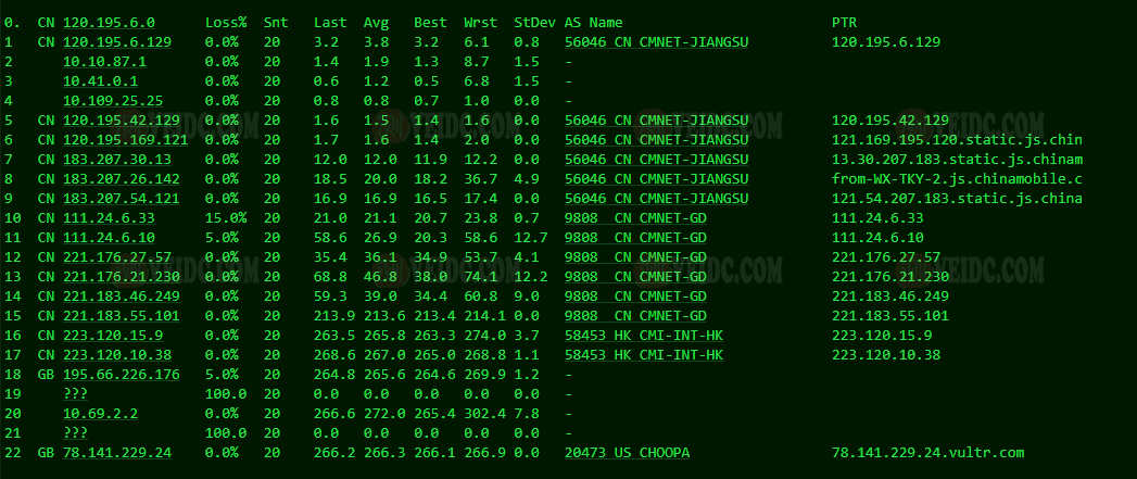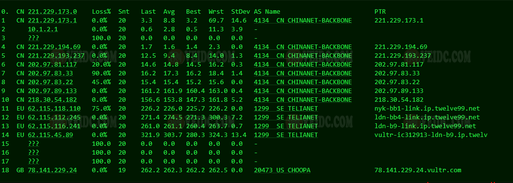 [Info] 测试路由 到 上海电信(天翼云) 中 ... traceroute to 101.227.255.45 (101.227.255.45), 30 hops max, 32 byte packets 1 * 2 vl199-ds1-j3-R51B3.lon3.constant.com (104.238.168.33) 6.75 ms AS20473 英国, 伦敦, choopa.com 3 * 4 * 5 te0-0-1-5.rcr21.b015589-1.lon13.atlas.cogentco.com (149.6.146.65) 0.78 ms AS174 英国, 伦敦, cogentco.com 6 be2538.ccr41.lon13.atlas.cogentco.com (130.117.3.97) 1.19 ms AS174 英国, 伦敦, cogentco.com 7 be2375.rcr21.b015533-1.lon13.atlas.cogentco.com (154.54.61.158) 1.21 ms AS174 英国, 伦敦, cogentco.com 8 chinatelecom.demarc.cogentco.com (149.14.81.226) 35.33 ms AS174 英国, 伦敦, cogentco.com 9 202.97.70.33 282.77 ms * 中国, chinatelecom.com.cn, 电信 10 * 11 * 12 101.95.88.77 294.35 ms AS4812 中国, 上海, chinatelecom.com.cn, 电信 13 101.95.207.18 282.33 ms AS4812 中国, 上海, chinatelecom.com.cn, 电信 14 * 15 * 16 * 17 * 18 * 19 * 20 * 21 * 22 * 23 * 24 * 25 * 26 * 27 * 28 * 29 * 30 * [Info] 测试路由 到 上海电信(天翼云) 完成 ! [Info] 测试路由 到 厦门电信CN2 中 ... traceroute to 117.28.254.129 (117.28.254.129), 30 hops max, 32 byte packets 1 * 2 vl199-ds1-j3-R51B3.lon3.constant.com (104.238.168.33) 4.94 ms AS20473 英国, 伦敦, choopa.com 3 * 4 * 5 5.158.213.45 0.62 ms AS2914 英国, 伦敦, ntt.com 6 ae-0.r21.londen12.uk.bb.gin.ntt.net (129.250.3.214) 1.31 ms AS2914 英国, 伦敦, ntt.com 7 ae-13.r25.asbnva02.us.bb.gin.ntt.net (129.250.2.111) 76.70 ms AS2914 美国, 弗吉尼亚州, 阿什本, ntt.com 8 * 9 ae-12.r31.tokyjp05.jp.bb.gin.ntt.net (129.250.3.192) 227.66 ms AS2914 日本, 东京都, 东京, ntt.com 10 ae-3.r01.tokyjp08.jp.bb.gin.ntt.net (129.250.6.133) 232.33 ms AS2914 日本, 东京都, 东京, ntt.com 11 ae-0.a01.tokyjp03.jp.bb.gin.ntt.net (129.250.2.246) 241.00 ms AS2914 日本, 东京都, 东京, ntt.com 12 xe-0-0-29-0.a01.tokyjp03.jp.ce.gin.ntt.net (117.103.177.106) 229.94 ms AS2914 日本, 东京都, 东京, ntt.com 13 59.43.186.185 229.58 ms * 中国, 上海, chinatelecom.com.cn, 电信 14 59.43.246.189 222.07 ms * 中国, 上海, chinatelecom.com.cn, 电信 15 59.43.138.45 228.72 ms * 中国, 上海, chinatelecom.com.cn, 电信 16 59.43.138.186 231.76 ms * 中国, 福建, chinatelecom.com.cn, 电信 17 * 18 27.159.81.194 299.34 ms AS133775 中国, 福建, 厦门, chinatelecom.com.cn, 电信 19 117.25.141.110 291.23 ms AS133775 中国, 福建, 厦门, chinatelecom.com.cn, 电信 20 117.28.254.129 236.17 ms AS4809 中国, 福建, 厦门, chinatelecom.com.cn, 电信 [Info] 测试路由 到 厦门电信CN2 完成 ! [Info] 测试路由 到 浙江杭州联通 中 ... traceroute to 101.71.241.238 (101.71.241.238), 30 hops max, 32 byte packets 1 * 2 vl199-ds1-j3-R51B3.lon3.constant.com (104.238.168.33) 0.99 ms AS20473 英国, 伦敦, choopa.com 3 * 4 * 5 te0-7-1-5.rcr21.b015589-1.lon13.atlas.cogentco.com (149.6.3.165) 0.82 ms AS174 英国, 伦敦, cogentco.com 6 be2540.ccr42.lon13.atlas.cogentco.com (130.117.3.101) 1.56 ms AS174 英国, 伦敦, cogentco.com 7 be12488.ccr42.ams03.atlas.cogentco.com (130.117.51.42) 8.75 ms AS174 荷兰, 北荷兰省, 阿姆斯特丹, cogentco.com 8 be2814.ccr42.fra03.atlas.cogentco.com (130.117.0.142) 15.03 ms AS174 德国, 黑森州, 法兰克福, cogentco.com 9 be2846.rcr22.fra06.atlas.cogentco.com (154.54.37.30) 15.08 ms AS174 德国, 黑森州, 法兰克福, cogentco.com 10 be3460.nr51.b037206-0.fra06.atlas.cogentco.com (154.25.12.77) 15.18 ms AS174 德国, 黑森州, 法兰克福, cogentco.com 11 149.11.84.186 15.46 ms AS174 德国, 黑森州, 法兰克福, cogentco.com 12 219.158.20.177 169.60 ms AS4837 中国, 广东, 广州, chinaunicom.com, 联通 13 219.158.103.33 163.69 ms AS4837 中国, 广东, 广州, chinaunicom.com, 联通 14 219.158.8.117 219.33 ms AS4837 中国, 广东, 广州, chinaunicom.com, 联通 15 219.158.114.206 240.13 ms AS4837 中国, 浙江, 杭州, chinaunicom.com, 联通 16 101.71.244.94 247.72 ms AS4837 中国, 浙江, 杭州, chinaunicom.com, 联通 17 * 18 * 19 * 20 * 21 * 22 * 23 * 24 * 25 * 26 * 27 * 28 * 29 * 30 * [Info] 测试路由 到 浙江杭州联通 完成 ! [Info] 测试路由 到 浙江杭州移动 中 ... traceroute to 112.17.0.106 (112.17.0.106), 30 hops max, 32 byte packets 1 * 2 vl199-ds1-j3-R51B3.lon3.constant.com (104.238.168.33) 7.49 ms AS20473 英国, 伦敦, choopa.com 3 * 4 * 5 195.66.226.5 5.17 ms * 英国, 伦敦, linx.net 6 223.120.15.26 242.37 ms AS58453 中国, chinamobile.com, 移动 7 221.183.55.30 232.35 ms AS9808 中国, 上海, chinamobile.com, 移动 8 221.183.25.189 232.49 ms AS9808 中国, 上海, chinamobile.com, 移动 9 221.176.22.9 243.18 ms AS9808 中国, 上海, chinamobile.com, 移动 10 111.24.3.81 232.80 ms AS9808 中国, 上海, chinamobile.com, 移动 11 111.24.3.30 237.45 ms AS9808 中国, 浙江, 杭州, chinamobile.com, 移动 12 * 13 218.205.58.194 237.23 ms AS56041 中国, 浙江, 杭州, chinamobile.com, 移动 14 218.205.87.13 249.55 ms AS56041 中国, 浙江, 杭州, chinamobile.com, 移动 15 * 16 * 17 * 18 * 19 * 20 * 21 * 22 * 23 * 24 * 25 * 26 * 27 * 28 * 29 * 30 * [Info] 测试路由 到 浙江杭州移动 完成 ! [Info] 测试路由 到 北京教育网 中 ... traceroute to 202.205.6.30 (202.205.6.30), 30 hops max, 32 byte packets 1 * 2 vl199-ds1-j3-R51B3.lon3.constant.com (104.238.168.33) 119.00 ms AS20473 英国, 伦敦, choopa.com 3 * 4 * 5 te0-0-1-5.rcr21.b015589-1.lon13.atlas.cogentco.com (149.6.146.65) 0.93 ms AS174 英国, 伦敦, cogentco.com 6 be2538.ccr41.lon13.atlas.cogentco.com (130.117.3.97) 1.53 ms AS174 英国, 伦敦, cogentco.com 7 be2317.ccr41.jfk02.atlas.cogentco.com (154.54.30.185) 67.28 ms AS174 美国, 纽约州, 纽约, cogentco.com 8 be2806.ccr41.dca01.atlas.cogentco.com (154.54.40.106) 74.48 ms AS174 美国, 弗吉尼亚州, 阿灵顿, cogentco.com 9 be2112.ccr41.atl01.atlas.cogentco.com (154.54.7.158) 85.33 ms AS174 美国, 乔治亚州, 亚特兰大, cogentco.com 10 be2687.ccr41.iah01.atlas.cogentco.com (154.54.28.70) 98.05 ms AS
