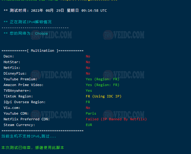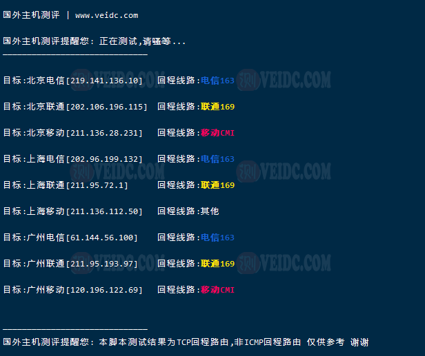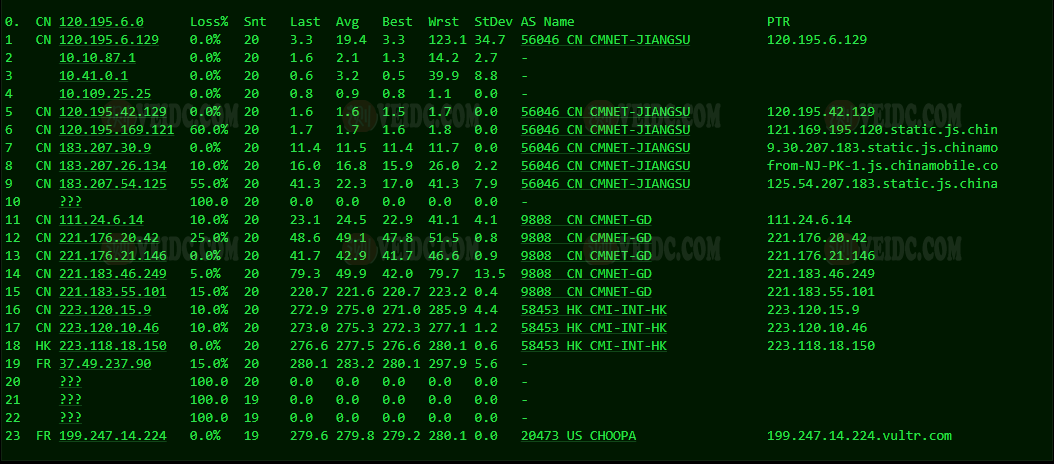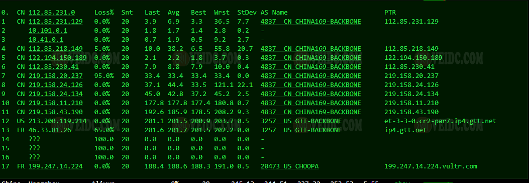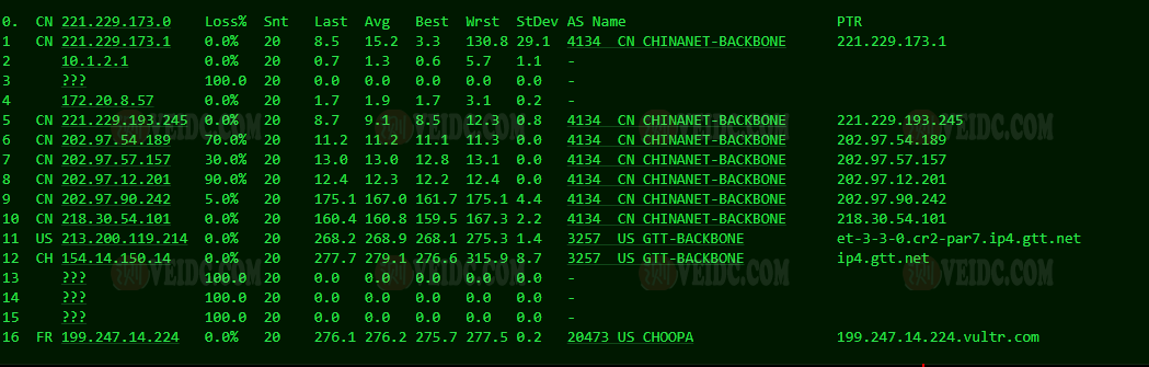 [Info] 测试路由 到 上海电信(天翼云) 中 ... traceroute to 101.227.255.45 (101.227.255.45), 30 hops max, 32 byte packets 1 * 2 * 3 * 4 * 5 * 6 ae-3-3202.edge3.London15.Level3.net (4.69.143.246) 8.32 ms AS3356 英国, 伦敦, level3.com 7 195.50.126.218 7.85 ms AS3356 英国, 伦敦, level3.com 8 202.97.93.153 261.04 ms AS4134 中国, 上海, chinatelecom.com.cn, 电信 9 202.97.12.185 262.05 ms AS4134 中国, 上海, chinatelecom.com.cn, 电信 10 202.97.94.238 251.65 ms AS4134 中国, 上海, chinatelecom.com.cn, 电信 11 * 12 * 13 * 14 * 15 * 16 * 17 * 18 * 19 * 20 * 21 * 22 * 23 * 24 * 25 * 26 * 27 * 28 * 29 * 30 * [Info] 测试路由 到 上海电信(天翼云) 完成 ! [Info] 测试路由 到 厦门电信CN2 中 ... traceroute to 117.28.254.129 (117.28.254.129), 30 hops max, 32 byte packets 1 * 2 * 3 * 4 * 5 82.112.96.237 2.91 ms AS2914 法国, 法兰西岛大区, 巴黎, ntt.com 6 ae-7.r20.parsfr04.fr.bb.gin.ntt.net (129.250.3.253) 2.52 ms AS2914 法国, 法兰西岛大区, 巴黎, ntt.com 7 ae-14.r21.nwrknj03.us.bb.gin.ntt.net (129.250.4.194) 78.46 ms AS2914 美国, 新泽西州, 纽瓦克, ntt.com 8 ae-0.r20.nwrknj03.us.bb.gin.ntt.net (129.250.6.16) 71.69 ms AS2914 美国, 新泽西州, 纽瓦克, ntt.com 9 ae-4.r24.sttlwa01.us.bb.gin.ntt.net (129.250.6.177) 132.15 ms AS2914 美国, 华盛顿州, 西雅图, ntt.com 10 ae-13.r30.tokyjp05.jp.bb.gin.ntt.net (129.250.4.143) 219.80 ms AS2914 日本, 东京都, 东京, ntt.com 11 ae-2.r00.tokyjp08.jp.bb.gin.ntt.net (129.250.6.127) 239.82 ms AS2914 日本, 东京都, 东京, ntt.com 12 ae-1.a00.tokyjp04.jp.bb.gin.ntt.net (129.250.2.59) 232.95 ms AS2914 日本, 东京都, 东京, ntt.com 13 xe-0-0-12-1.a00.tokyjp04.jp.ce.gin.ntt.net (120.88.54.134) 219.31 ms AS2914 日本, 东京都, 东京, ntt.com 14 59.43.184.181 235.41 ms * 中国, 上海, chinatelecom.com.cn, 电信 15 * 16 59.43.130.217 236.34 ms * 中国, 上海, chinatelecom.com.cn, 电信 17 59.43.138.186 237.62 ms * 中国, 福建, chinatelecom.com.cn, 电信 18 * 19 27.159.81.198 293.70 ms AS133775 中国, 福建, 厦门, chinatelecom.com.cn, 电信 20 117.25.141.106 289.47 ms AS133775 中国, 福建, 厦门, chinatelecom.com.cn, 电信 21 117.28.254.129 240.49 ms AS4809 中国, 福建, 厦门, chinatelecom.com.cn, 电信 [Info] 测试路由 到 厦门电信CN2 完成 ! [Info] 测试路由 到 浙江杭州联通 中 ... traceroute to 101.71.241.238 (101.71.241.238), 30 hops max, 32 byte packets 1 * 2 * 3 * 4 * 5 ip4.gtt.net (154.14.150.13) 0.36 ms AS286,AS3257 法国, 法兰西岛大区, 巴黎, interoute.com 6 ae21.cr2-fra6.ip4.gtt.net (213.200.116.225) 10.22 ms AS286,AS3257 德国, 黑森州, 法兰克福, gtt.net 7 219.158.43.189 10.12 ms AS4837 中国, chinaunicom.com, 联通 8 219.158.14.169 161.32 ms AS4837 中国, 上海, chinaunicom.com, 联通 9 219.158.103.29 165.05 ms AS4837 中国, 广东, 广州, chinaunicom.com, 联通 10 219.158.103.217 166.43 ms AS4837 中国, 广东, 广州, chinaunicom.com, 联通 11 219.158.20.234 187.47 ms AS4837 中国, 浙江, 杭州, chinaunicom.com, 联通 12 101.71.244.94 184.67 ms AS4837 中国, 浙江, 杭州, chinaunicom.com, 联通 13 * 14 * 15 * 16 * 17 * 18 * 19 * 20 * 21 * 22 * 23 * 24 * 25 * 26 * 27 * 28 * 29 * 30 * [Info] 测试路由 到 浙江杭州联通 完成 ! [Info] 测试路由 到 浙江杭州移动 中 ... traceroute to 112.17.0.106 (112.17.0.106), 30 hops max, 32 byte packets 1 * 2 * 3 * 4 * 5 prs-b8-link.ip.twelve99.net (62.115.48.200) 1.97 ms AS1299 法国, 法兰西岛大区, 巴黎, telia.com 6 prs-bb2-link.ip.twelve99.net (62.115.138.138) 8.16 ms AS1299 法国, 法兰西岛大区, 巴黎, telia.com 7 ldn-bb4-link.ip.twelve99.net (62.115.114.228) 6.95 ms AS1299 英国, 伦敦, telia.com 8 slou-b1-link.ip.twelve99.net (62.115.117.123) 7.79 ms AS1299 英国, 伯克郡, 斯劳, telia.com 9 chinamobile-ic342125-slou-b1.ip.twelve99-cust.net (62.115.171.223) 8.33 ms AS1299 英国, 伯克郡, 斯劳, telia.com 10 * 11 223.120.15.30 248.10 ms AS58453 欧洲地区, chinamobile.com, 移动 12 221.183.55.26 237.82 ms AS9808 中国, 上海, chinamobile.com, 移动 13 * 14 221.183.23.25 237.60 ms AS9808 中国, 上海, chinamobile.com, 移动 15 111.24.3.85 237.46 ms AS9808 中国, 上海, chinamobile.com, 移动 16 111.24.3.30 256.48 ms AS9808 中国, 浙江, 杭州, chinamobile.com, 移动 17 * 18 218.205.59.234 283.60 ms AS56041 中国, 浙江, 杭州, chinamobile.com, 移动 19 * 20 * 21 * 22 * 23 * 24 * 25 * 26 * 27 * 28 * 29 * 30 * [Info] 测试路由 到 浙江杭州移动 完成 ! [Info] 测试路由 到 北京教育网 中 ... traceroute to 202.205.6.30 (202.205.6.30), 30 hops max, 32 byte packets 1 * 2 * 3 * 4 * 5 82.112.96.237 0.79 ms AS2914 法国, 法兰西岛大区, 巴黎, ntt.com 6 ae-7.r21.parsfr04.fr.bb.gin.ntt.net (129.250.3.255) 1.52 ms AS2914 法国, 法兰西岛大区, 巴黎, ntt.com 7 ae-6.r20.mlanit02.it.bb.gin.ntt.net (129.250.4.189) 17.97 ms AS2914 意大利, 伦巴第大区, 米兰广域市, ntt.com 8 ae-10.r22.sngpsi07.sg.bb.gin.ntt.net (129.250.7.8) 157.82 ms AS2914 新加坡, ntt.com 9 ae-10.r27.tkokhk01.hk.bb.gin.ntt.net (129.250.7.67) 190.01 ms AS2914 中国, 香港, ntt.com 10 ae-1.a01.chwahk02.hk.bb.gin.ntt.net (129.250.5.161) 191.17 ms AS2914 中国, 香港, ntt.com 11 203.131.254.214 188.93 ms AS2914 中国, 香港, ntt.com 12 * 13 * 14 * 15 101.4.118.213 239.60 ms AS4538 中国, 北京, edu.cn, 教育网 16 101.4.113.110 224.13 ms AS4538 中国, 北京, edu.cn, 教育网 17 219.224.102.230 242.31 ms AS4538 中国, 北京, edu.cn, 教育网 18 101.4.130.54 224.57 ms AS133111 中国, 北京, edu.cn, 教育网 19 * 20 * 21 * 22 * 23 * 24 * 25 * 26 101.4.130.54 224.79 ms AS133111 中国, 北京, edu.cn, 教育网 27 * 28 * 29 * 30 101.4.130.54 224.79 ms AS133111 中国, 北京, edu.cn, 教育网 [Info] 测试路由 到 北京教育网 完成 ! [Info] 四网路由快速测试 已完成 !