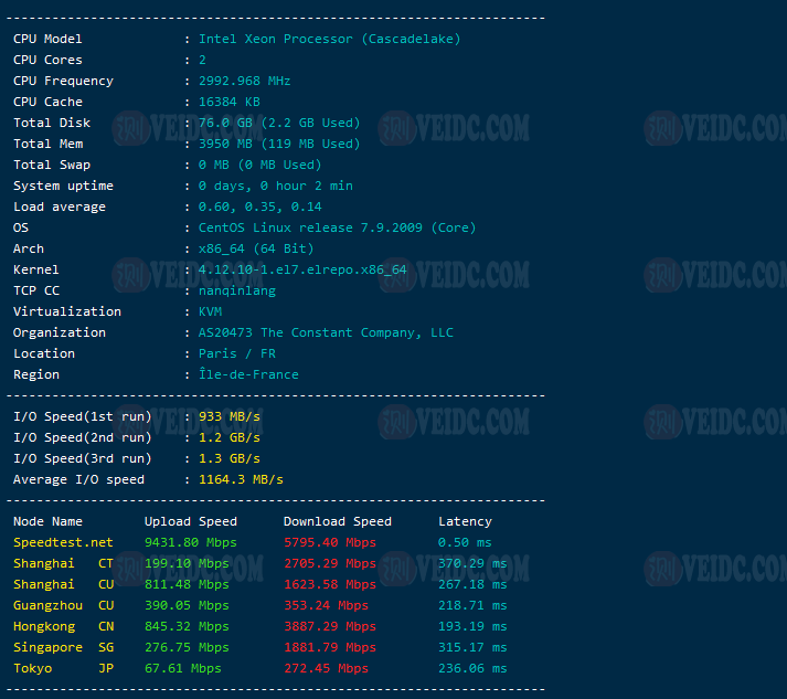 Vultr目前在全球有17个机房,分布在北美、欧洲、亚洲、澳大利亚等地区,覆盖范围广,为了方便广大站长们选择,本文分享 Vultr 法国巴黎机房的速度、延迟、丢包率、路由跟踪测试结果信息。测评说明:本站所有测评数据基本都是在安装了BBR和KCPTUN的前提下进行的,站长经常使用的BBR:南琴浪版暴力魔改BBR一键安装脚本 附加速50倍效果图 和 超级加速工具KCPTUN一键安装脚本 附100倍加速效果图。Vultr测评机器配置均为:2核4G内存80G存储,月流量3000GB。