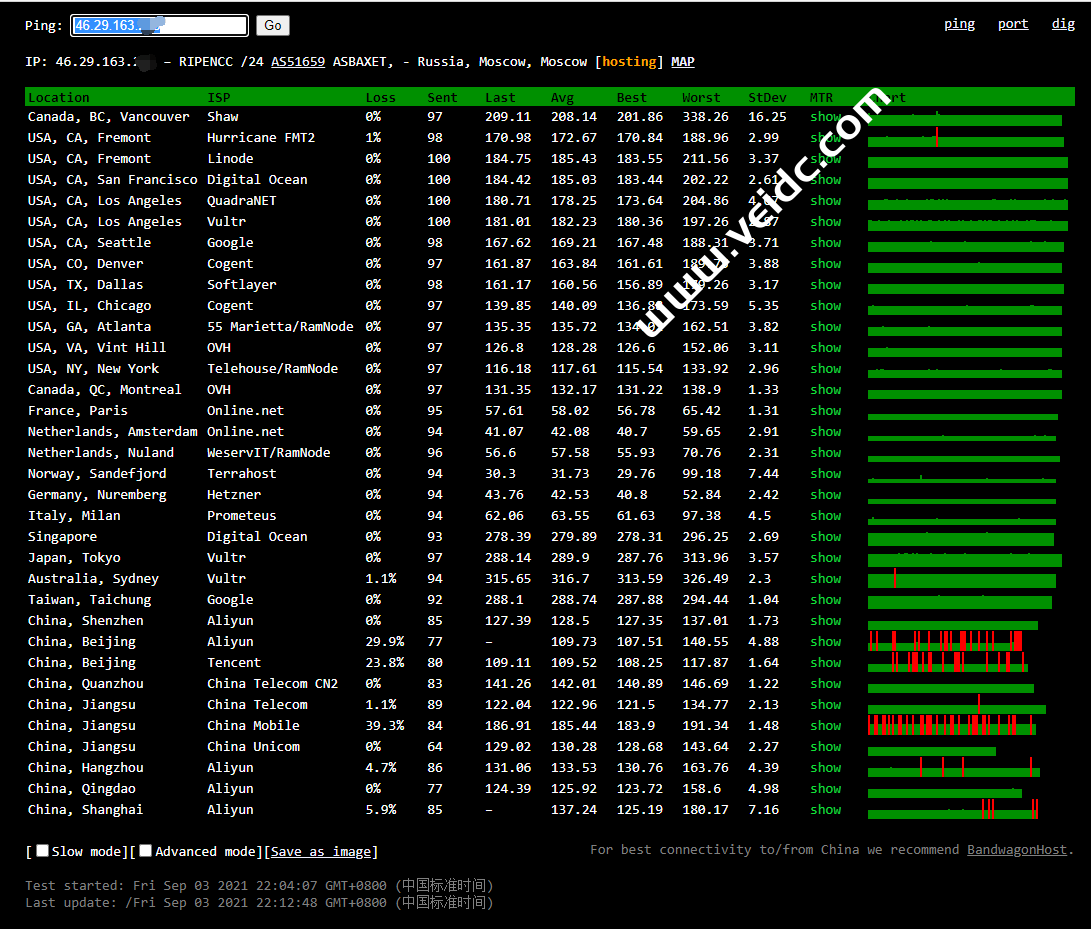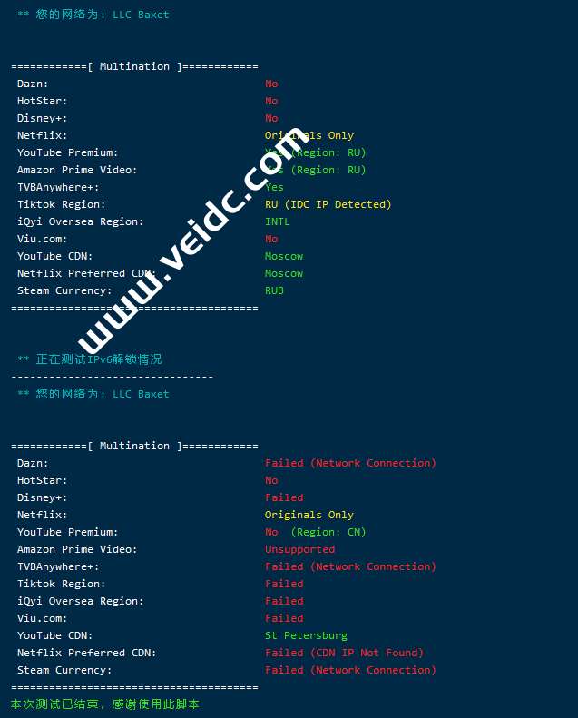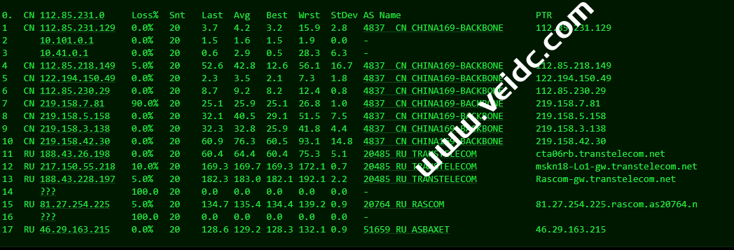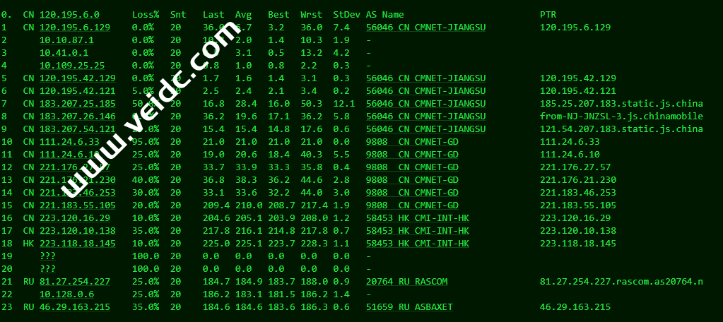 [Info] 测试路由 到 上海电信(天翼云) 中 ... traceroute to 101.227.255.45 (101.227.255.45), 30 hops max, 32 byte packets 1 45.136.244.1 0.72 ms AS51659 俄罗斯, 莫斯科, domainshop.ru 2 * 3 * 4 145.14.89.1 1.81 ms * 俄罗斯, 莫斯科, cteurope.net 5 59.43.246.17 89.32 ms * 中国, 北京, chinatelecom.com.cn, 电信 6 59.43.182.226 116.69 ms * 中国, 上海, chinatelecom.com.cn, 电信 7 * 8 * 9 * 10 61.152.25.225 131.77 ms AS4812 中国, 上海, chinatelecom.com.cn, 电信 11 101.95.206.26 117.33 ms AS4812 中国, 上海, chinatelecom.com.cn, 电信 12 * 13 * 14 * 15 * 16 * 17 * 18 * 19 * 20 * 21 * 22 * 23 * 24 * 25 * 26 * 27 * 28 * 29 * 30 * [Info] 测试路由 到 上海电信(天翼云) 完成 ! [Info] 测试路由 到 厦门电信CN2 中 ... traceroute to 117.28.254.129 (117.28.254.129), 30 hops max, 32 byte packets 1 45.136.244.1 5.53 ms AS51659 俄罗斯, 莫斯科, domainshop.ru 2 * 3 * 4 145.14.89.1 27.64 ms * 俄罗斯, 莫斯科, cteurope.net 5 59.43.246.17 89.36 ms * 中国, 北京, chinatelecom.com.cn, 电信 6 59.43.188.69 90.88 ms * 中国, 北京, chinatelecom.com.cn, 电信 7 59.43.132.17 91.02 ms * 中国, 北京, chinatelecom.com.cn, 电信 8 59.43.46.82 112.53 ms * 中国, 上海, chinatelecom.com.cn, 电信 9 59.43.138.186 131.83 ms * 中国, 福建, chinatelecom.com.cn, 电信 10 * 11 * 12 117.25.141.106 134.34 ms AS133775 中国, 福建, 厦门, chinatelecom.com.cn, 电信 13 117.28.254.129 137.50 ms AS4809 中国, 福建, 厦门, chinatelecom.com.cn, 电信 [Info] 测试路由 到 厦门电信CN2 完成 ! [Info] 测试路由 到 浙江杭州联通 中 ... traceroute to 101.71.241.238 (101.71.241.238), 30 hops max, 32 byte packets 1 45.136.244.1 0.65 ms AS51659 俄罗斯, 莫斯科, domainshop.ru 2 * 3 * 4 145.14.89.1 1.54 ms * 俄罗斯, 莫斯科, cteurope.net 5 59.43.246.17 89.85 ms * 中国, 北京, chinatelecom.com.cn, 电信 6 59.43.182.226 114.07 ms * 中国, 上海, chinatelecom.com.cn, 电信 7 59.43.244.118 114.41 ms * 中国, 上海, chinatelecom.com.cn, 电信 8 * 9 * 10 202.97.68.138 121.53 ms * 中国, 浙江, 杭州, chinatelecom.com.cn, 电信 11 * 12 * 13 219.158.7.197 129.82 ms AS4837 中国, 浙江, 杭州, chinaunicom.com, 联通 14 * 15 * 16 * 17 * 18 * 19 * 20 * 21 * 22 * 23 * 24 * 25 * 26 * 27 * 28 * 29 * 30 * [Info] 测试路由 到 浙江杭州联通 完成 ! [Info] 测试路由 到 浙江杭州移动 中 ... traceroute to 112.17.0.106 (112.17.0.106), 30 hops max, 32 byte packets 1 45.136.244.1 0.97 ms AS51659 俄罗斯, 莫斯科, domainshop.ru 2 * 3 * 4 145.14.89.1 1.64 ms * 俄罗斯, 莫斯科, cteurope.net 5 59.43.246.17 104.97 ms * 中国, 北京, chinatelecom.com.cn, 电信 6 59.43.182.226 113.95 ms * 中国, 上海, chinatelecom.com.cn, 电信 7 59.43.244.118 115.29 ms * 中国, 上海, chinatelecom.com.cn, 电信 8 202.97.51.242 116.94 ms AS4134 中国, 上海, chinatelecom.com.cn, 电信 9 202.97.50.177 143.72 ms AS4134 中国, 上海, chinatelecom.com.cn, 电信 10 202.97.26.6 134.23 ms AS4134 中国, 浙江, 杭州, chinatelecom.com.cn, 电信 11 * 12 * 13 221.183.94.141 219.18 ms AS9808 中国, 浙江, 杭州, chinamobile.com, 移动 14 * 15 218.205.87.13 181.69 ms AS56041 中国, 浙江, 杭州, chinamobile.com, 移动 16 * 17 * 18 * 19 * 20 * 21 * 22 * 23 * 24 * 25 * 26 * 27 * 28 * 29 * 30 * [Info] 测试路由 到 浙江杭州移动 完成 ! [Info] 测试路由 到 北京教育网 中 ... traceroute to 202.205.6.30 (202.205.6.30), 30 hops max, 32 byte packets 1 45.136.244.1 0.71 ms AS51659 俄罗斯, 莫斯科, domainshop.ru 2 * 3 * 4 145.14.89.1 4.33 ms * 俄罗斯, 莫斯科, cteurope.net 5 59.43.246.17 89.77 ms * 中国, 北京, chinatelecom.com.cn, 电信 6 59.43.182.246 123.62 ms * 中国, 广东, 广州, chinatelecom.com.cn, 电信 7 59.43.244.130 135.58 ms * 中国, 广东, 广州, chinatelecom.com.cn, 电信 8 202.97.91.193 130.47 ms AS4134 中国, 广东, 广州, chinatelecom.com.cn, 电信 9 202.97.91.17 123.70 ms AS4134 中国, 广东, 广州, chinatelecom.com.cn, 电信 10 202.97.63.194 137.96 ms AS4134 中国, 广东, 广州, chinatelecom.com.cn, 电信 11 * 12 101.4.117.33 134.66 ms AS4538 中国, 湖南, 长沙, edu.cn, 教育网 13 101.4.112.38 231.03 ms AS4538 中国, 湖北, 武汉, edu.cn, 教育网 14 101.4.117.38 162.21 ms AS4538 中国, 河南, 郑州, edu.cn, 教育网 15 101.4.112.1 157.26 ms AS4538 中国, 北京, edu.cn, 教育网 16 101.4.113.110 161.90 ms AS4538 中国, 北京, edu.cn, 教育网 17 219.224.102.230 172.29 ms AS4538 中国, 北京, edu.cn, 教育网 18 * 19 * 20 * 21 * 22 101.4.130.54 158.91 ms AS133111 中国, 北京, edu.cn, 教育网 23 * 24 * 25 * 26 * 27 * 28 * 29 101.4.130.53 161.44 ms AS133111 中国, 北京, edu.cn, 教育网 30 * [Info] 测试路由 到 北京教育网 完成 ! [Info] 四网路由快速测试 已完成 !