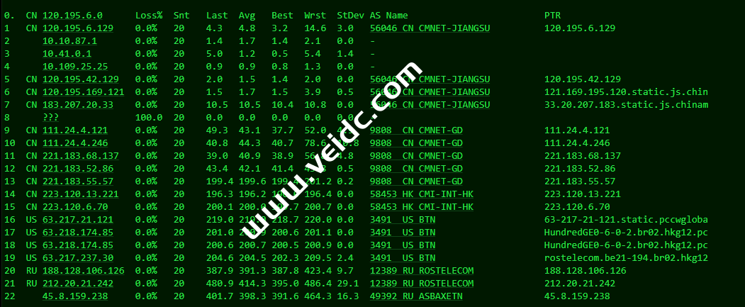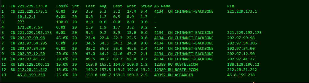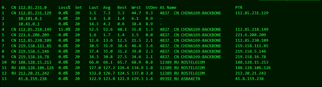 [Info] 测试路由 到 上海电信(天翼云) 中 ... traceroute to 101.227.255.45 (101.227.255.45), 30 hops max, 32 byte packets 1 45.8.158.1 2.67 ms AS49392 俄罗斯, 新西伯利亚州, 新西伯利亚, justhost.ru 2 212.20.21.241 0.66 ms AS12389 俄罗斯, 新西伯利亚州, 新西伯利亚, rt.ru 3 188.128.106.115 61.23 ms AS12389 俄罗斯, rt.ru 4 202.97.41.21 124.13 ms AS4134 中国, 浙江, 杭州, chinatelecom.com.cn, 电信 5 * 6 * 7 202.97.56.34 146.80 ms AS4134 中国, 上海, chinatelecom.com.cn, 电信 8 * 9 124.74.166.122 149.45 ms AS4812 中国, 上海, chinatelecom.com.cn, 电信 10 * 11 * 12 * 13 * 14 * 15 * 16 * 17 * 18 * 19 * 20 * 21 * 22 * 23 * 24 * 25 * 26 * 27 * 28 * 29 * 30 * [Info] 测试路由 到 上海电信(天翼云) 完成 ! [Info] 测试路由 到 厦门电信CN2 中 ... traceroute to 117.28.254.129 (117.28.254.129), 30 hops max, 32 byte packets 1 45.8.158.1 4.07 ms AS49392 俄罗斯, 新西伯利亚州, 新西伯利亚, justhost.ru 2 212.20.21.241 0.65 ms AS12389 俄罗斯, 新西伯利亚州, 新西伯利亚, rt.ru 3 * 4 87.226.221.99 93.65 ms AS12389 俄罗斯, rt.ru 5 * 6 203.208.158.17 138.05 ms AS7473 新加坡, singtel.com 7 203.208.131.50 131.85 ms AS7473 新加坡, singtel.com 8 * 9 * 10 * 11 * 12 110.80.128.94 186.93 ms AS133775 中国, 福建, 厦门, chinatelecom.com.cn, 电信 13 * 14 117.25.141.110 183.73 ms AS133775 中国, 福建, 厦门, chinatelecom.com.cn, 电信 15 117.28.254.129 157.51 ms AS4809 中国, 福建, 厦门, chinatelecom.com.cn, 电信 [Info] 测试路由 到 厦门电信CN2 完成 ! [Info] 测试路由 到 浙江杭州联通 中 ... traceroute to 101.71.241.238 (101.71.241.238), 30 hops max, 32 byte packets 1 45.8.158.1 1.70 ms AS49392 俄罗斯, 新西伯利亚州, 新西伯利亚, justhost.ru 2 212.20.21.241 0.60 ms AS12389 俄罗斯, 新西伯利亚州, 新西伯利亚, rt.ru 3 188.128.106.115 80.06 ms AS12389 俄罗斯, rt.ru 4 188.128.15.214 93.80 ms AS12389 俄罗斯, rt.ru 5 219.158.5.198 124.61 ms AS4837 中国, 上海, chinaunicom.com, 联通 6 219.158.113.138 126.67 ms AS4837 中国, 上海, chinaunicom.com, 联通 7 219.158.113.101 119.79 ms AS4837 中国, 上海, chinaunicom.com, 联通 8 219.158.115.150 131.25 ms AS4837 中国, 浙江, 杭州, chinaunicom.com, 联通 9 101.71.244.94 131.15 ms AS4837 中国, 浙江, 杭州, chinaunicom.com, 联通 10 * 11 * 12 * 13 * 14 * 15 * 16 * 17 * 18 * 19 * 20 * 21 * 22 * 23 * 24 * 25 * 26 * 27 * 28 * 29 * 30 * [Info] 测试路由 到 浙江杭州联通 完成 ! [Info] 测试路由 到 浙江杭州移动 中 ... traceroute to 112.17.0.106 (112.17.0.106), 30 hops max, 32 byte packets 1 45.8.158.1 0.95 ms AS49392 俄罗斯, 新西伯利亚州, 新西伯利亚, justhost.ru 2 212.20.21.241 30.02 ms AS12389 俄罗斯, 新西伯利亚州, 新西伯利亚, rt.ru 3 ae45.stkm-cr4.intl.ip.rostelecom.ru (87.226.133.133) 58.43 ms AS12389 瑞典, 斯德哥尔摩省, 斯德哥尔摩, rt.ru 4 ae53.edge4.Stockholm2.Level3.net (213.249.107.129) 57.35 ms AS3356 瑞典, 斯德哥尔摩省, 斯德哥尔摩, level3.com 5 ae2.3222.edge9.Frankfurt1.level3.net (4.69.167.118) 86.14 ms AS3356 德国, 黑森州, 法兰克福, level3.com 6 4.68.110.26 88.35 ms AS3356 美国, level3.com 7 223.120.10.85 87.22 ms AS58453 德国, 黑森州, 法兰克福, chinamobile.com, 移动 8 223.120.15.214 235.31 ms AS58453 德国, 黑森州, 法兰克福, chinamobile.com, 移动 9 221.183.55.42 366.90 ms AS9808 中国, 上海, chinamobile.com, 移动 10 221.176.22.205 239.10 ms AS9808 中国, 上海, chinamobile.com, 移动 11 221.183.23.25 237.85 ms AS9808 中国, 上海, chinamobile.com, 移动 12 111.24.3.85 215.97 ms AS9808 中国, 上海, chinamobile.com, 移动 13 221.183.108.122 266.51 ms AS9808 中国, chinamobile.com, 移动 14 * 15 218.205.58.194 219.48 ms AS56041 中国, 浙江, 杭州, chinamobile.com, 移动 16 218.205.87.13 387.18 ms AS56041 中国, 浙江, 杭州, chinamobile.com, 移动 17 * 18 * 19 * 20 * 21 * 22 * 23 * 24 * 25 * 26 * 27 * 28 * 29 * 30 * [Info] 测试路由 到 浙江杭州移动 完成 ! [Info] 测试路由 到 北京教育网 中 ... traceroute to 202.205.6.30 (202.205.6.30), 30 hops max, 32 byte packets 1 45.8.158.1 0.83 ms AS49392 俄罗斯, 新西伯利亚州, 新西伯利亚, justhost.ru 2 212.20.21.241 1.36 ms AS12389 俄罗斯, 新西伯利亚州, 新西伯利亚, rt.ru 3 ae48.frkt-cr2.intl.ip.rostelecom.ru (217.107.68.3) 81.72 ms AS12389 德国, 黑森州, 法兰克福, rt.ru 4 195.66.224.177 94.03 ms * 英国, 伦敦, linx.net 5 i-1001.ulhc-core02.telstraglobal.net (202.84.178.70) 92.85 ms AS4637 英国, 伦敦, telstra.com 6 i-1022.ulhc-core02.telstraglobal.net (202.84.141.230) 159.14 ms AS4637 英国, 伦敦, telstra.com 7 i-1022.ny8a-core01.telstraglobal.net (202.84.141.229) 163.37 ms AS4637 美国, 纽约州, 纽约, telstra.com 8 i-10848.eqnx-core02.telstraglobal.net (202.40.148.97) 230.03 ms AS4637 美国, 加利福尼亚州, 圣何塞, reach.com 9 i-10848.eqnx-core02.telstraglobal.net (202.40.148.97) 374.06 ms AS4637 美国, 加利福尼亚州, 圣何塞, reach.com 10 i-15208.hkth-core02.telstraglobal.net (202.84.140.1) 374.94 ms AS4637 中国, 香港, telstra.com 11 i-15208.hkth-core02.telstraglobal.net (202.84.140.1) 374.48 ms AS4637 中国, 香港, telstra.com 12 202.84.153.26 373.99 ms AS4637 中国, 香港, telstra.com 13 CER-0003.10026.telstraglobal.net (61.8.59.38) 379.06 ms AS4637 中国, 香港, pacnet.com 14 * 15 * 16 * 17 101.4.118.213 391.89 ms AS4538 中国, 北京, edu.cn, 教育网 18 101.4.113.110 384.80 ms AS4538 中国, 北京, edu.cn, 教育网 19 219.224.102.230 403.37 ms AS4538 中国, 北京, edu.cn, 教育网 20 101.4.130.54 390.14 ms AS133111 中国, 北京, edu.cn, 教育网 21 * 22 101.4.130.54 390.49 ms AS133111 中国, 北京, edu.cn, 教育网 23 101.4.130.53 391.23 ms AS133111 中国, 北京, edu.cn, 教育网 24 * 25 * 26 * 27 101.4.130.53 384.62 ms AS133111 中国, 北京, edu.cn, 教育网 28 * 29 * 30 * [Info] 测试路由 到