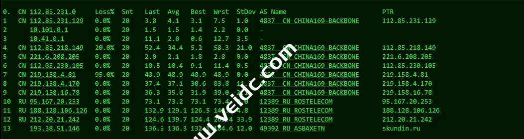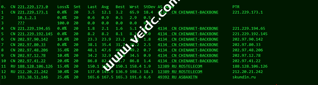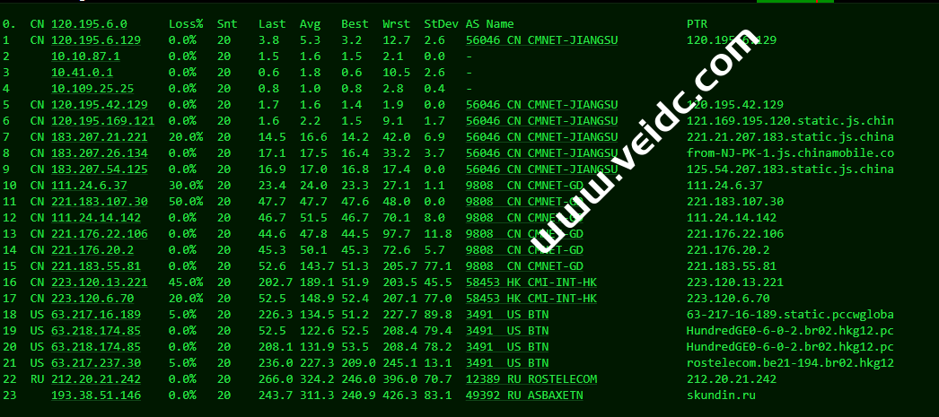 [Info] 测试路由 到 上海电信(天翼云) 中 ... traceroute to 101.227.255.45 (101.227.255.45), 30 hops max, 32 byte packets 1 193.38.50.1 8.45 ms AS49392 俄罗斯, 新西伯利亚州, 新西伯利亚, justhost.ru 2 212.20.21.241 1.36 ms AS12389 俄罗斯, 新西伯利亚州, 新西伯利亚, rt.ru 3 188.128.106.113 63.10 ms AS12389 俄罗斯, rt.ru 4 202.97.41.21 132.86 ms AS4134 中国, 浙江, 杭州, chinatelecom.com.cn, 电信 5 202.97.12.49 122.95 ms AS4134 中国, 北京, chinatelecom.com.cn, 电信 6 * 7 * 8 * 9 * 10 * 11 * 12 * 13 * 14 * 15 * 16 * 17 * 18 * 19 * 20 * 21 * 22 * 23 * 24 * 25 * 26 * 27 * 28 * 29 * 30 * [Info] 测试路由 到 上海电信(天翼云) 完成 ! [Info] 测试路由 到 厦门电信CN2 中 ... traceroute to 117.28.254.129 (117.28.254.129), 30 hops max, 32 byte packets 1 193.38.50.1 1.17 ms AS49392 俄罗斯, 新西伯利亚州, 新西伯利亚, justhost.ru 2 212.20.21.241 0.73 ms AS12389 俄罗斯, 新西伯利亚州, 新西伯利亚, rt.ru 3 * 4 87.226.221.99 91.98 ms AS12389 俄罗斯, rt.ru 5 203.208.183.250 130.44 ms AS7473 新加坡, singtel.com 6 203.208.158.17 125.62 ms AS7473 新加坡, singtel.com 7 203.208.131.50 143.67 ms AS7473 新加坡, singtel.com 8 * 9 * 10 * 11 * 12 * 13 27.159.81.190 178.19 ms AS133775 中国, 福建, 厦门, chinatelecom.com.cn, 电信 14 117.25.141.106 179.15 ms AS133775 中国, 福建, 厦门, chinatelecom.com.cn, 电信 15 117.28.254.129 149.77 ms AS4809 中国, 福建, 厦门, chinatelecom.com.cn, 电信 [Info] 测试路由 到 厦门电信CN2 完成 ! [Info] 测试路由 到 浙江杭州联通 中 ... traceroute to 101.71.241.238 (101.71.241.238), 30 hops max, 32 byte packets 1 193.38.50.1 17.84 ms AS49392 俄罗斯, 新西伯利亚州, 新西伯利亚, justhost.ru 2 212.20.21.241 4.38 ms AS12389 俄罗斯, 新西伯利亚州, 新西伯利亚, rt.ru 3 188.128.106.115 66.90 ms AS12389 俄罗斯, rt.ru 4 95.167.20.254 100.18 ms AS12389 俄罗斯, rt.ru 5 219.158.5.198 125.82 ms AS4837 中国, 上海, chinaunicom.com, 联通 6 219.158.8.177 121.94 ms AS4837 中国, 广东, 广州, chinaunicom.com, 联通 7 219.158.7.125 128.94 ms AS4837 中国, 上海, chinaunicom.com, 联通 8 219.158.106.94 126.82 ms AS4837 中国, 浙江, 杭州, chinaunicom.com, 联通 9 101.71.244.94 124.75 ms AS4837 中国, 浙江, 杭州, chinaunicom.com, 联通 10 * 11 * 12 * 13 * 14 * 15 * 16 * 17 * 18 * 19 * 20 * 21 * 22 * 23 * 24 * 25 * 26 * 27 * 28 * 29 * 30 * [Info] 测试路由 到 浙江杭州联通 完成 ! [Info] 测试路由 到 浙江杭州移动 中 ... traceroute to 112.17.0.106 (112.17.0.106), 30 hops max, 32 byte packets 1 193.38.50.1 4.44 ms AS49392 俄罗斯, 新西伯利亚州, 新西伯利亚, justhost.ru 2 212.20.21.241 0.71 ms AS12389 俄罗斯, 新西伯利亚州, 新西伯利亚, rt.ru 3 ae45.stkm-cr4.intl.ip.rostelecom.ru (87.226.133.133) 66.34 ms AS12389 瑞典, 斯德哥尔摩省, 斯德哥尔摩, rt.ru 4 ae53.edge4.Stockholm2.Level3.net (213.249.107.129) 64.96 ms AS3356 瑞典, 斯德哥尔摩省, 斯德哥尔摩, level3.com 5 ae2.3222.edge9.Frankfurt1.level3.net (4.69.167.118) 85.33 ms AS3356 德国, 黑森州, 法兰克福, level3.com 6 4.68.110.26 89.35 ms AS3356 美国, level3.com 7 223.120.10.85 87.26 ms AS58453 德国, 黑森州, 法兰克福, chinamobile.com, 移动 8 223.120.15.214 240.08 ms AS58453 德国, 黑森州, 法兰克福, chinamobile.com, 移动 9 221.183.55.46 236.97 ms AS9808 中国, 上海, chinamobile.com, 移动 10 221.183.25.189 364.48 ms AS9808 中国, 上海, chinamobile.com, 移动 11 221.176.22.9 237.67 ms AS9808 中国, 上海, chinamobile.com, 移动 12 111.24.3.89 213.89 ms AS9808 中国, 上海, chinamobile.com, 移动 13 221.183.108.122 227.48 ms AS9808 中国, chinamobile.com, 移动 14 * 15 218.205.58.194 221.47 ms AS56041 中国, 浙江, 杭州, chinamobile.com, 移动 16 218.205.87.13 386.36 ms AS56041 中国, 浙江, 杭州, chinamobile.com, 移动 17 * 18 * 19 * 20 * 21 * 22 * 23 * 24 * 25 * 26 * 27 * 28 * 29 * 30 * [Info] 测试路由 到 浙江杭州移动 完成 ! [Info] 测试路由 到 北京教育网 中 ... traceroute to 202.205.6.30 (202.205.6.30), 30 hops max, 32 byte packets 1 193.38.50.1 0.92 ms AS49392 俄罗斯, 新西伯利亚州, 新西伯利亚, justhost.ru 2 212.20.21.241 0.63 ms AS12389 俄罗斯, 新西伯利亚州, 新西伯利亚, rt.ru 3 ae42.frkt-cr2.intl.ip.rostelecom.ru (217.107.67.5) 94.34 ms AS12389 德国, 黑森州, 法兰克福, rt.ru 4 195.66.224.177 95.55 ms * 英国, 伦敦, linx.net 5 i-1008.ulcn-core01.telstraglobal.net (202.84.178.13) 93.84 ms AS4637 英国, 伦敦, telstra.com 6 202.84.249.174 164.84 ms AS4637 TELSTRA.COM 骨干网, telstra.com 7 i-10848.eqnx-core02.telstraglobal.net (202.40.148.97) 233.05 ms AS4637 美国, 加利福尼亚州, 圣何塞, reach.com 8 i-10848.eqnx-core02.telstraglobal.net (202.40.148.97) 403.10 ms AS4637 美国, 加利福尼亚州, 圣何塞, reach.com 9 i-15208.hkth-core02.telstraglobal.net (202.84.140.1) 383.88 ms AS4637 中国, 香港, telstra.com 10 i-15208.hkth-core02.telstraglobal.net (202.84.140.1) 383.23 ms AS4637 中国, 香港, telstra.com 11 202.84.153.26 377.46 ms AS4637 中国, 香港, telstra.com 12 CER-0003.10026.telstraglobal.net (61.8.59.38) 379.22 ms AS4637 中国, 香港, pacnet.com 13 101.4.114.181 395.46 ms AS4538 中国, 北京, edu.cn, 教育网 14 * 15 * 16 101.4.118.213 391.19 ms AS4538 中国, 北京, edu.cn, 教育网 17 101.4.113.110 392.01 ms AS4538 中国, 北京, edu.cn, 教育网 18 219.224.102.230 386.83 ms AS4538 中国, 北京, edu.cn, 教育网 19 101.4.130.54 389.89 ms AS133111 中国, 北京, edu.cn, 教育网 20 101.4.130.53 395.36 ms AS133111 中国, 北京, edu.cn, 教育网 21 101.4.130.54 389.78 ms AS133111 中国, 北京, edu.cn, 教育网 22 * 23 * 24 * 25 101.4.130.54 398.41 ms AS133111 中国, 北京, edu.cn, 教育网 26 * 27 * 28 101.4.130.53 395.52 ms AS133111 中国, 北京, edu.cn, 教育网 29 * 30 * [Info] 测试路由 到 北京教育网 完成 ! 