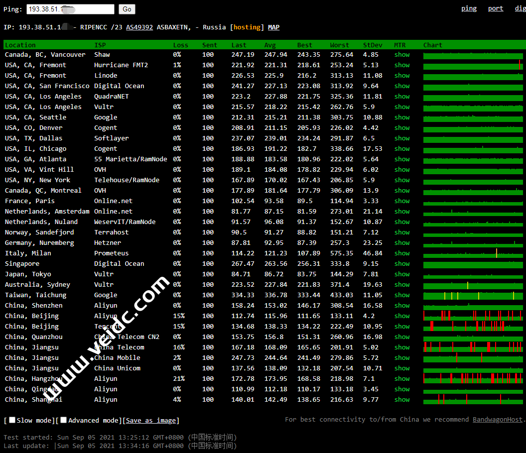 全球PING及丢包率测试: