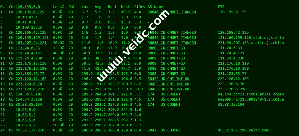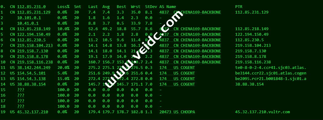 [Info] 测试路由 到 上海电信(天翼云) 中 ... traceroute to 101.227.255.45 (101.227.255.45), 30 hops max, 32 byte packets 1 * 2 * 3 * 4 * 5 * 6 4.7.18.205 0.96 ms AS3356 美国, 加利福尼亚州, 圣何塞, level3.com 7 ae-3-19.edge2.SanJose3.Level3.net (4.69.209.189) 1.53 ms AS3356 美国, 加利福尼亚州, 圣何塞, level3.com 8 CHINA-TELEC.edge2.SanJose3.Level3.net (4.53.210.146) 2.91 ms AS3356 美国, 加利福尼亚州, 圣何塞, level3.com 9 202.97.86.186 2.93 ms AS4134 美国, 加利福尼亚州, 圣何塞, chinatelecom.com.cn, 电信 10 202.97.71.197 134.05 ms * 中国, 上海, chinatelecom.com.cn, 电信 11 202.97.74.2 133.74 ms * 中国, 上海, chinatelecom.com.cn, 电信 12 202.97.57.26 162.94 ms AS4134 中国, 上海, chinatelecom.com.cn, 电信 13 61.152.24.77 155.51 ms AS4812 中国, 上海, chinatelecom.com.cn, 电信 14 * 15 * 16 * 17 * 18 * 19 * 20 * 21 * 22 * 23 * 24 * 25 * 26 * 27 * 28 * 29 * 30 * [Info] 测试路由 到 上海电信(天翼云) 完成 ! [Info] 测试路由 到 厦门电信CN2 中 ... traceroute to 117.28.254.129 (117.28.254.129), 30 hops max, 32 byte packets 1 * 2 * 3 * 4 * 5 * 6 xe-0-0-14-2.a00.snjsca04.us.bb.gin.ntt.net (129.250.207.197) 1.05 ms AS2914 美国, 加利福尼亚州, 圣何塞, ntt.com 7 ae-7.r25.snjsca04.us.bb.gin.ntt.net (129.250.3.59) 1.17 ms AS2914 美国, 加利福尼亚州, 圣何塞, ntt.com 8 ae-21.r30.tokyjp05.jp.bb.gin.ntt.net (129.250.5.77) 106.98 ms AS2914 日本, 东京都, 东京, ntt.com 9 ae-2.r01.tokyjp08.jp.bb.gin.ntt.net (129.250.6.131) 108.00 ms AS2914 日本, 东京都, 东京, ntt.com 10 ae-2.a00.tokyjp04.jp.bb.gin.ntt.net (129.250.2.69) 108.01 ms AS2914 日本, 东京都, 东京, ntt.com 11 xe-0-0-12-1.a00.tokyjp04.jp.ce.gin.ntt.net (120.88.54.134) 112.76 ms AS2914 日本, 东京都, 东京, ntt.com 12 * 13 * 14 * 15 * 16 * 17 27.148.195.98 166.08 ms AS133775 中国, 福建, 厦门, chinatelecom.com.cn, 电信 18 117.25.141.110 164.91 ms AS133775 中国, 福建, 厦门, chinatelecom.com.cn, 电信 19 117.28.254.129 172.93 ms AS4809 中国, 福建, 厦门, chinatelecom.com.cn, 电信 [Info] 测试路由 到 厦门电信CN2 完成 ! [Info] 测试路由 到 浙江杭州联通 中 ... traceroute to 101.71.241.238 (101.71.241.238), 30 hops max, 32 byte packets 1 * 2 * 3 * 4 * 5 * 6 xe-1-2-2.cr0-sjc2.ip4.gtt.net (69.22.143.237) 0.56 ms AS286,AS3257 美国, 加利福尼亚州, 圣何塞, gtt.net 7 ae2.cr5-sjc1.ip4.gtt.net (89.149.180.26) 0.83 ms AS286,AS3257 美国, 加利福尼亚州, 圣何塞, gtt.net 8 as4837.cr5-sjc1.ip4.gtt.net (173.205.56.174) 7.48 ms AS286,AS3257 美国, 加利福尼亚州, 圣何塞, gtt.net 9 219.158.116.233 189.10 ms AS4837 中国, 上海, chinaunicom.com, 联通 10 219.158.6.157 187.40 ms AS4837 中国, 上海, chinaunicom.com, 联通 11 219.158.7.125 172.04 ms AS4837 中国, 上海, chinaunicom.com, 联通 12 219.158.106.94 166.86 ms AS4837 中国, 浙江, 杭州, chinaunicom.com, 联通 13 101.71.244.94 169.30 ms AS4837 中国, 浙江, 杭州, chinaunicom.com, 联通 14 * 15 * 16 * 17 * 18 * 19 * 20 * 21 * 22 * 23 * 24 * 25 * 26 * 27 * 28 * 29 * 30 * [Info] 测试路由 到 浙江杭州联通 完成 ! [Info] 测试路由 到 浙江杭州移动 中 ... traceroute to 112.17.0.106 (112.17.0.106), 30 hops max, 32 byte packets 1 * 2 * 3 * 4 * 5 * 6 xe-0-0-14-2.a00.snjsca04.us.bb.gin.ntt.net (129.250.207.197) 1.14 ms AS2914 美国, 加利福尼亚州, 圣何塞, ntt.com 7 ae-7.r25.snjsca04.us.bb.gin.ntt.net (129.250.3.59) 1.39 ms AS2914 美国, 加利福尼亚州, 圣何塞, ntt.com 8 ae-5.r24.snjsca04.us.bb.gin.ntt.net (129.250.3.146) 1.47 ms AS2914 美国, 加利福尼亚州, 圣何塞, ntt.com 9 ae-5.r26.osakjp02.jp.bb.gin.ntt.net (129.250.2.119) 105.35 ms AS2914 日本, 大阪府, 大阪, ntt.com 10 ae-4.r27.tkokhk01.hk.bb.gin.ntt.net (129.250.2.43) 150.68 ms AS2914 中国, 香港, ntt.com 11 ae-0.r26.tkokhk01.hk.bb.gin.ntt.net (129.250.5.28) 150.21 ms AS2914 中国, 香港, ntt.com 12 ae-0.a02.tkokhk01.hk.bb.gin.ntt.net (129.250.5.33) 150.18 ms AS2914 中国, 香港, ntt.com 13 * 14 * 15 * 16 * 17 * 18 221.183.25.189 177.81 ms AS9808 中国, 上海, chinamobile.com, 移动 19 221.176.17.217 186.43 ms AS9808 中国, 上海, chinamobile.com, 移动 20 * 21 * 22 * 23 * 24 * 25 * 26 * 27 * 28 * 29 * 30 * [Info] 测试路由 到 浙江杭州移动 完成 ! [Info] 测试路由 到 北京教育网 中 ... traceroute to 202.205.6.30 (202.205.6.30), 30 hops max, 32 byte packets 1 * 2 * 3 * 4 * 5 * 6 xe-0-0-14-2.a00.snjsca04.us.bb.gin.ntt.net (129.250.207.197) 1.17 ms AS2914 美国, 加利福尼亚州, 圣何塞, ntt.com 7 ae-7.r25.snjsca04.us.bb.gin.ntt.net (129.250.3.59) 0.97 ms AS2914 美国, 加利福尼亚州, 圣何塞, ntt.com 8 ae-5.r24.snjsca04.us.bb.gin.ntt.net (129.250.3.146) 7.25 ms AS2914 美国, 加利福尼亚州, 圣何塞, ntt.com 9 ae-5.r26.osakjp02.jp.bb.gin.ntt.net (129.250.2.119) 106.45 ms AS2914 日本, 大阪府, 大阪, ntt.com 10 ae-4.r27.tkokhk01.hk.bb.gin.ntt.net (129.250.2.43) 149.32 ms AS2914 中国, 香港, ntt.com 11 ae-0.r26.tkokhk01.hk.bb.gin.ntt.net (129.250.5.28) 148.40 ms AS2914 中国, 香港, ntt.com 12 ae-2.a01.chwahk02.hk.bb.gin.ntt.net (129.250.6.123) 149.37 ms AS2914 中国, 香港, ntt.com 13 203.131.254.214 149.22 ms AS2914 中国, 香港, ntt.com 14 101.4.114.181 179.32 ms AS4538 中国, 北京, edu.cn, 教育网 15 * 16 * 17 * 18 101.4.113.110 188.13 ms AS4538 中国, 北京, edu.cn, 教育网 19 219.224.102.230 197.46 ms AS4538 中国, 北京, edu.cn, 教育网 20 101.4.130.54 202.04 ms AS133111 中国, 北京, edu.cn, 教育网 21 * 22 * 23 * 24 * 25 * 26 * 27 101.4.130.53 225.16 ms AS133111 中国, 北京, edu.cn, 教育网 28 * 29 * 30 * [Info] 测试路由 到 北京教育网 完成 ! [Info] 四网路由快速测试 已完成 !