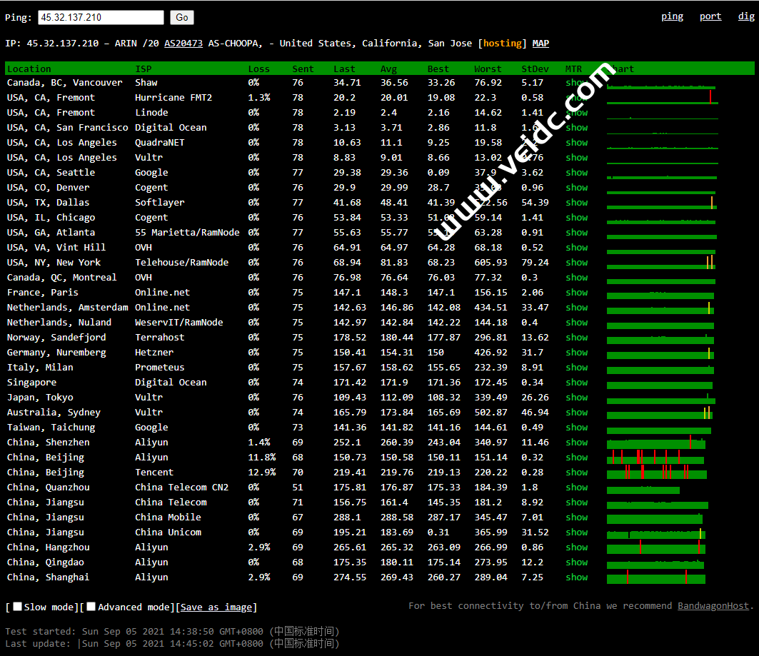 全球PING及丢包率测试: