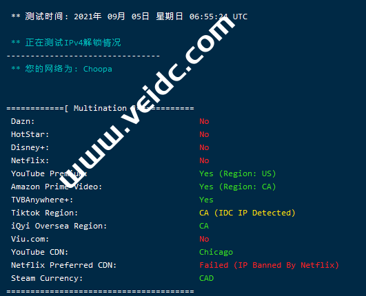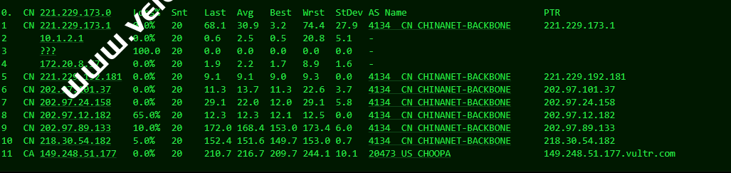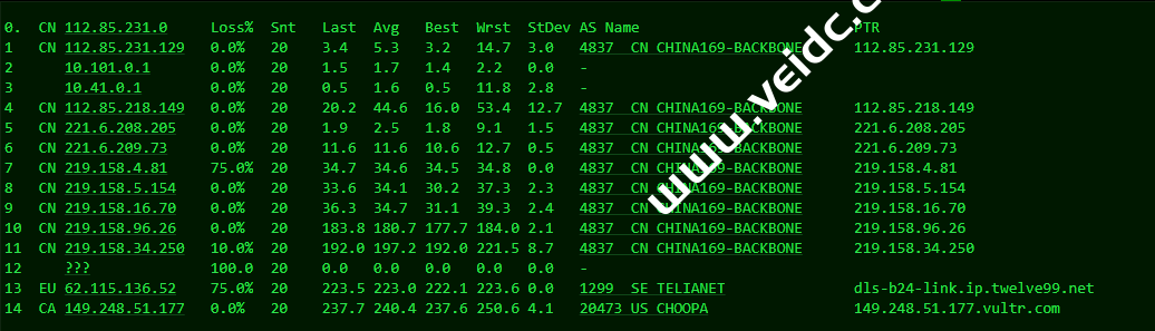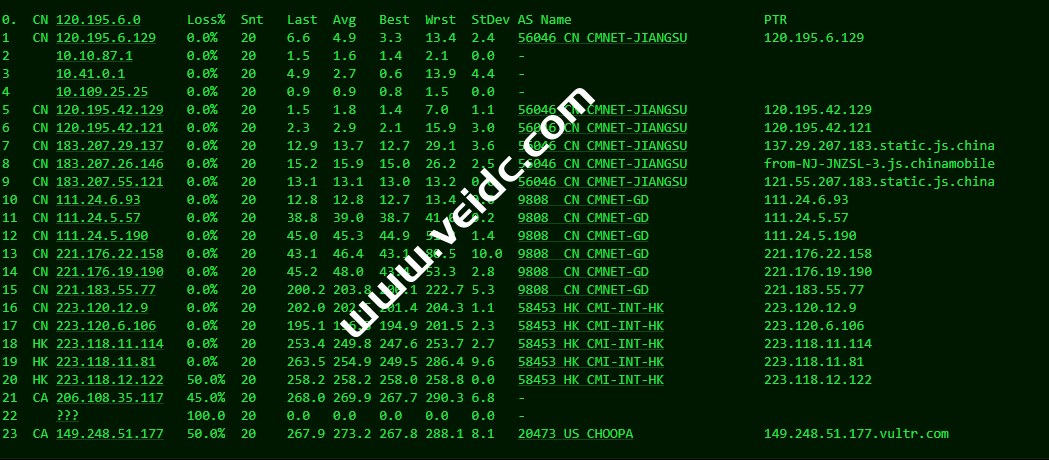 [Info] 测试路由 到 上海电信(天翼云) 中 ... traceroute to 101.227.255.45 (101.227.255.45), 30 hops max, 32 byte packets 1 * 2 * 3 * 4 * 5 xe-11-2-1.bar1.Toronto1.Level3.net (4.16.52.81) 15.41 ms AS3356 加拿大, 安大略省, 多伦多, level3.com 6 ae-3-19.edge2.SanJose3.Level3.net (4.69.209.189) 63.43 ms AS3356 美国, 加利福尼亚州, 圣何塞, level3.com 7 CHINA-TELEC.edge2.SanJose3.Level3.net (4.53.210.110) 61.16 ms AS3356 美国, 加利福尼亚州, 圣何塞, level3.com 8 202.97.50.53 63.14 ms AS4134 美国, 加利福尼亚州, 圣何塞, chinatelecom.com.cn, 电信 9 202.97.90.62 196.89 ms AS4134 中国, 上海, chinatelecom.com.cn, 电信 10 202.97.12.198 201.65 ms AS4134 中国, 上海, chinatelecom.com.cn, 电信 11 202.97.57.146 203.09 ms AS4134 中国, 上海, chinatelecom.com.cn, 电信 12 * 13 124.74.166.142 211.72 ms AS4812 中国, 上海, chinatelecom.com.cn, 电信 14 * 15 * 16 * 17 * 18 * 19 * 20 * 21 * 22 * 23 * 24 * 25 * 26 * 27 * 28 * 29 * 30 * [Info] 测试路由 到 上海电信(天翼云) 完成 ! [Info] 测试路由 到 厦门电信CN2 中 ... traceroute to 117.28.254.129 (117.28.254.129), 30 hops max, 32 byte packets 1 * 2 * 3 * 4 * 5 xe-11-2-1.bar1.Toronto1.Level3.net (4.16.52.81) 15.34 ms AS3356 加拿大, 安大略省, 多伦多, level3.com 6 * 7 CHINA-TELEC.ear2.LosAngeles1.Level3.net (4.71.136.202) 69.27 ms AS3356 美国, 加利福尼亚州, 洛杉矶, level3.com 8 59.43.246.237 198.62 ms * 中国, 上海, chinatelecom.com.cn, 电信 9 * 10 59.43.138.49 212.80 ms * 中国, 上海, chinatelecom.com.cn, 电信 11 59.43.138.186 222.54 ms * 中国, 福建, chinatelecom.com.cn, 电信 12 110.80.128.86 218.88 ms AS133775 中国, 福建, 厦门, chinatelecom.com.cn, 电信 13 27.159.81.198 216.84 ms AS133775 中国, 福建, 厦门, chinatelecom.com.cn, 电信 14 117.25.141.106 221.46 ms AS133775 中国, 福建, 厦门, chinatelecom.com.cn, 电信 15 117.28.254.129 223.28 ms AS4809 中国, 福建, 厦门, chinatelecom.com.cn, 电信 [Info] 测试路由 到 厦门电信CN2 完成 ! [Info] 测试路由 到 浙江杭州联通 中 ... traceroute to 101.71.241.238 (101.71.241.238), 30 hops max, 32 byte packets 1 * 2 * 3 * 4 * 5 toro-b3-link.ip.twelve99.net (62.115.168.56) 1.08 ms AS1299 加拿大, 安大略省, 多伦多, telia.com 6 * 7 * 8 sjo-b1-link.ip.twelve99.net (62.115.125.161) 57.45 ms AS1299 美国, 加利福尼亚州, 圣何塞, telia.com 9 sjo-b1-link.ip.twelve99.net (62.115.125.161) 57.51 ms AS1299 美国, 加利福尼亚州, 圣何塞, telia.com 10 sjo-b1-link.ip.twelve99.net (62.115.125.161) 57.29 ms AS1299 美国, 加利福尼亚州, 圣何塞, telia.com 11 chinaunicom-ic341503-sjo-b21.ip.twelve99-cust.net (62.115.170.61) 57.41 ms AS1299 美国, 加利福尼亚州, 圣何塞, telia.com 12 219.158.96.37 210.54 ms AS4837 中国, 北京, chinaunicom.com, 联通 13 219.158.19.74 236.17 ms AS4837 中国, 上海, chinaunicom.com, 联通 14 219.158.19.81 228.63 ms AS4837 中国, 上海, chinaunicom.com, 联通 15 219.158.115.150 241.89 ms AS4837 中国, 浙江, 杭州, chinaunicom.com, 联通 16 101.71.244.90 240.33 ms AS4837 中国, 浙江, 杭州, chinaunicom.com, 联通 17 101.71.244.90 240.56 ms AS4837 中国, 浙江, 杭州, chinaunicom.com, 联通 18 * 19 * 20 * 21 * 22 * 23 * 24 * 25 * 26 * 27 * 28 * 29 * 30 * [Info] 测试路由 到 浙江杭州联通 完成 ! [Info] 测试路由 到 浙江杭州移动 中 ... traceroute to 112.17.0.106 (112.17.0.106), 30 hops max, 32 byte packets 1 * 2 * 3 * 4 * 5 toro-b3-link.ip.twelve99.net (62.115.168.56) 0.72 ms AS1299 加拿大, 安大略省, 多伦多, telia.com 6 toro-b2-link.ip.twelve99.net (62.115.117.229) 0.79 ms AS1299 加拿大, 安大略省, 多伦多, telia.com 7 toro-b2-link.ip.twelve99.net (62.115.117.229) 0.76 ms AS1299 加拿大, 安大略省, 多伦多, telia.com 8 nyk-bb2-link.ip.twelve99.net (62.115.123.108) 85.97 ms AS1299 美国, 纽约州, 纽约, telia.com 9 slou-b1-link.ip.twelve99.net (62.115.117.193) 85.90 ms AS1299 英国, 伯克郡, 斯劳, telia.com 10 chinamobile-ic342125-slou-b1.ip.twelve99-cust.net (62.115.171.223) 90.27 ms AS1299 英国, 伯克郡, 斯劳, telia.com 11 chinamobile-ic342125-slou-b1.ip.twelve99-cust.net (62.115.171.223) 90.16 ms AS1299 英国, 伯克郡, 斯劳, telia.com 12 223.120.10.201 90.01 ms AS58453 英国, 伦敦, chinamobile.com, 移动 13 221.183.55.50 270.73 ms AS9808 中国, 上海, chinamobile.com, 移动 14 221.183.25.193 268.05 ms AS9808 中国, 上海, chinamobile.com, 移动 15 221.183.25.193 268.14 ms AS9808 中国, 上海, chinamobile.com, 移动 16 221.176.22.13 271.85 ms AS9808 中国, 上海, chinamobile.com, 移动 17 221.183.108.122 280.20 ms AS9808 中国, chinamobile.com, 移动 18 * 19 * 20 218.205.58.190 280.54 ms AS56041 中国, 浙江, 杭州, chinamobile.com, 移动 21 * 22 * 23 * 24 * 25 * 26 * 27 * 28 * 29 * 30 * [Info] 测试路由 到 浙江杭州移动 完成 ! [Info] 测试路由 到 北京教育网 中 ... traceroute to 202.205.6.30 (202.205.6.30), 30 hops max, 32 byte packets 1 * 2 * 3 * 4 * 5 xe-11-2-0.bar1.Toronto1.Level3.net (4.16.49.205) 17.49 ms AS3356 加拿大, 安大略省, 多伦多, level3.com 6 ae-2-6.bar1.Orlando1.Level3.net (4.69.133.78) 17.50 ms AS3356 美国, 俄亥俄州, 克里夫兰, level3.com 7 * 8 be2717.ccr41.ord01.atlas.cogentco.com (154.54.6.221) 12.75 ms AS174 美国, 伊利诺伊州, 芝加哥, cogentco.com 9 be2831.ccr21.mci01.atlas.cogentco.com (154.54.42.165) 35.05 ms AS174 美国, 密苏里州, 堪萨斯城, cogentco.com 10 be3035.ccr21.den01.atlas.cogentco.com (154.54.5.89) 37.74 ms AS174 美国, 科罗拉多州, 丹佛, cogentco.com 11 be3046.ccr21.elp01.atlas.cogentco.com (154.54.0.45) 57.19 ms AS174 美国, 德克萨斯州, 埃尔帕索, cogentco.com 12 be2930.ccr32.phx01.atlas.cogentco.com (154.54.42.77) 56.94 ms AS174 美国, 亚利桑那州, 凤凰城, cogentco.com 13 be2932.ccr42.lax01.atlas.cogentco.com (154.54.45.162) 67.11 ms AS174 美国, 加利福尼亚州, 洛杉矶, cog