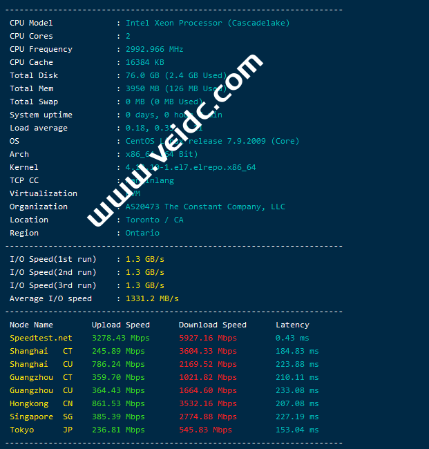 Vultr目前在全球有17个机房,分布在北美、欧洲、亚洲、澳大利亚等地区,覆盖范围广,为了方便广大站长们选择,本文分享 Vultr 加拿大多伦多机房的速度、延迟、丢包率、路由跟踪测试结果信息。测评说明:本站所有测评数据基本都是在安装了BBR和KCPTUN的前提下进行的,站长经常使用的BBR:南琴浪版暴力魔改BBR一键安装脚本 附加速50倍效果图 和 超级加速工具KCPTUN一键安装脚本 附100倍加速效果图。Vultr测评机器配置均为:2核4G内存80G存储,月流量3000GB。