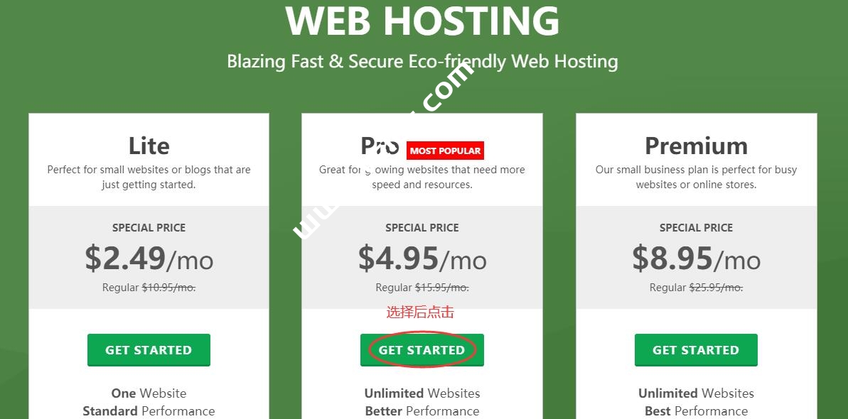 选择相应的主机类型后,就会跳转到套餐选择页面。GreenGeeks的虚拟主机有3种套餐:Lite、Pro、Premium。Lite套餐只能托管一个网站;Pro套餐可以托管无数个网站;Premium套餐除了可以托管无数个网站外,还有缓存优化,同时还提供了一个免费的独立IP。看你需要选择,这里我就以选择Pro套餐为例(这个套餐使用的人应该是最多的),如下所示: