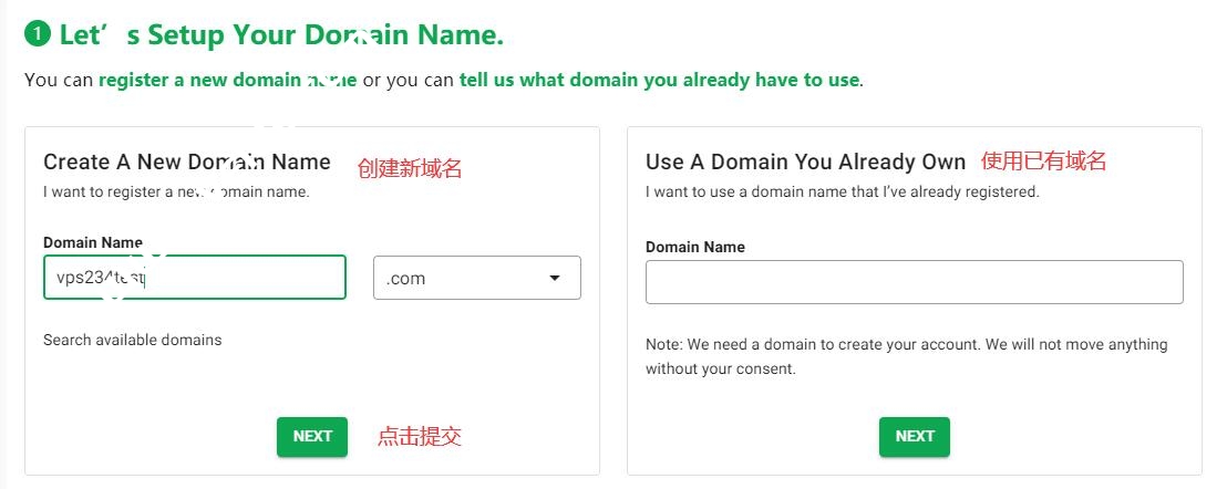 套餐选择好了点击之后会跳转到域名页面。有两个输入框,左边框是创建一个新的域名,右边框是使用你已经有的域名。GreenGeeks购买一年是免费赠送了一个域名了,如果你没有域名就可以在左边框输入你想要的域名检测是否可以用,当然如果你不想用免费的域名,用你已经在其他地方购买的域名,直接将域名填写在右边就可以了。这里我示例就注册一个新的域名,如下所示: