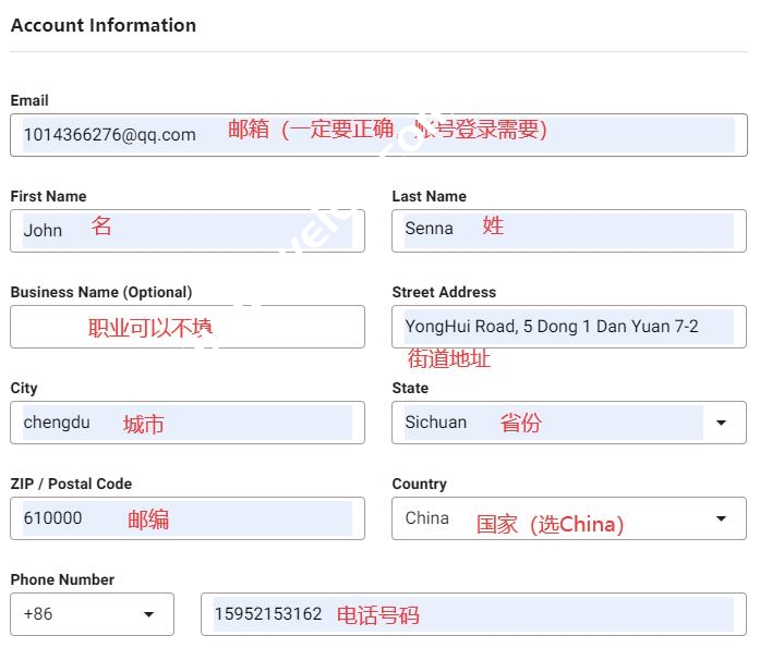 下一个页面是用户信息页面。因为需要注册用户,所以你要先填写用户信息。输入你的姓、名、邮箱、家庭地址、邮编、电话号码、省份、国家(China),填写的时候用拼音,不要用中文。