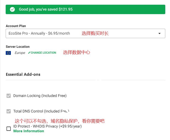 填写好之后向下滑动,需要选择购买时间,我一般建议购买1年,购买时间越长,价格越便宜。然后你还可以选择数据中心,有欧洲、美国、加拿大可以选择,这个看你需要,一般选择美国会比较好一点。然后在附加服务里面可以把”ID Protect – WHOIS Privacy”去掉勾选,这个是域名隐私保护,看你需要不。 如下所示: