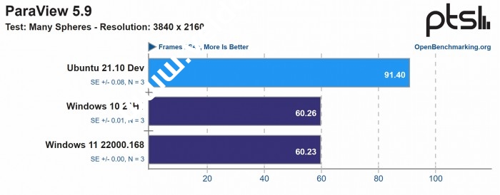 根据在几个工作站应用程序的比较中获得的基准结果,Ubuntu 21.10似乎在一些测试中的性能领先了50%左右,甚至更多,特别是那些涉及到对CPU更多依赖的测试,表明该操作系统在利用可用的CPU资源方面可能比Windows更好。另一方面,我们知道基于GPU的应用程序通常倾向于微软的操作系统,然而,性能差距对Windows来说没有那么大。