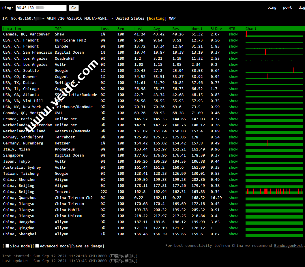 全球PING及丢包率测试: