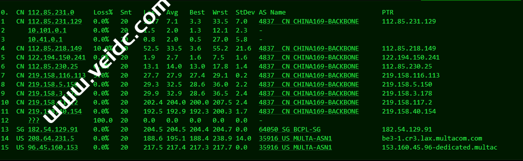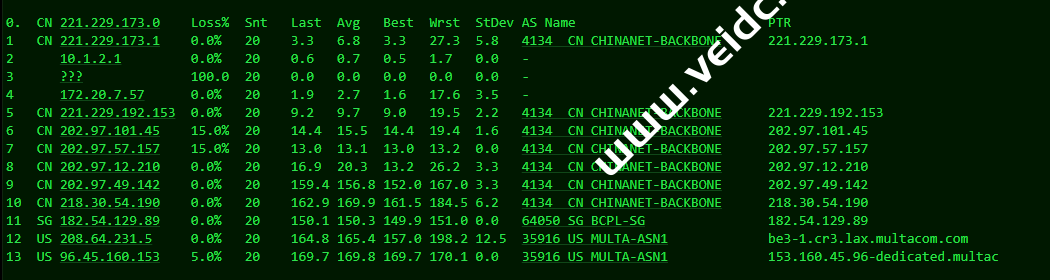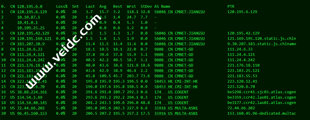 [Info] 测试路由 到 上海电信(天翼云) 中 ... traceroute to 101.227.255.45 (101.227.255.45), 30 hops max, 32 byte packets 1 43.226.26.1 0.51 ms AS35916 美国, 加利福尼亚州, 洛杉矶, multacom.com 2 be4-1.asr2.lax.multacom.com (208.64.231.6) 1.13 ms AS35916 美国, 加利福尼亚州, 洛杉矶, multacom.com 3 182.54.129.88 1.38 ms AS64050 美国, 加利福尼亚州, 洛杉矶, bgp.net 4 218.30.54.189 4.41 ms AS4134 美国, chinatelecom.com.cn, 电信 5 * 6 202.97.12.185 150.47 ms AS4134 中国, 上海, chinatelecom.com.cn, 电信 7 202.97.94.238 152.31 ms AS4134 中国, 上海, chinatelecom.com.cn, 电信 8 101.95.88.73 151.72 ms AS4812 中国, 上海, chinatelecom.com.cn, 电信 9 * 10 * 11 * 12 * 13 * 14 * 15 * 16 * 17 * 18 * 19 * 20 * 21 * 22 * 23 * 24 * 25 * 26 * 27 * 28 * 29 * 30 * [Info] 测试路由 到 上海电信(天翼云) 完成 ! [Info] 测试路由 到 厦门电信CN2 中 ... traceroute to 117.28.254.129 (117.28.254.129), 30 hops max, 32 byte packets 1 43.226.26.1 0.69 ms AS35916 美国, 加利福尼亚州, 洛杉矶, multacom.com 2 be4-1.asr2.lax.multacom.com (208.64.231.6) 0.88 ms AS35916 美国, 加利福尼亚州, 洛杉矶, multacom.com 3 182.54.129.88 0.90 ms AS64050 美国, 加利福尼亚州, 洛杉矶, bgp.net 4 las-b24-link.ip.twelve99.net (62.115.162.54) 0.97 ms AS1299 美国, 加利福尼亚州, 洛杉矶, telia.com 5 las-b2-link.ip.twelve99.net (62.115.125.163) 1.02 ms AS1299 美国, 加利福尼亚州, 洛杉矶, telia.com 6 chinatelecom-ic320371-las-b24.ip.twelve99-cust.net (213.248.79.253) 1.32 ms AS1299 美国, 加利福尼亚州, 洛杉矶, telia.com 7 59.43.182.81 132.42 ms * 美国, 加利福尼亚州, 洛杉矶, chinatelecom.com.cn, 电信 8 * 9 59.43.138.45 143.26 ms * 中国, 上海, chinatelecom.com.cn, 电信 10 59.43.138.186 163.96 ms * 中国, 福建, chinatelecom.com.cn, 电信 11 * 12 27.159.81.206 162.33 ms AS133775 中国, 福建, 厦门, chinatelecom.com.cn, 电信 13 117.25.141.106 160.34 ms AS133775 中国, 福建, 厦门, chinatelecom.com.cn, 电信 14 117.28.254.129 169.10 ms AS4809 中国, 福建, 厦门, chinatelecom.com.cn, 电信 [Info] 测试路由 到 厦门电信CN2 完成 ! [Info] 测试路由 到 浙江杭州联通 中 ... traceroute to 101.71.241.238 (101.71.241.238), 30 hops max, 32 byte packets 1 43.226.26.1 4.28 ms AS35916 美国, 加利福尼亚州, 洛杉矶, multacom.com 2 be4-1.asr2.lax.multacom.com (208.64.231.6) 1.02 ms AS35916 美国, 加利福尼亚州, 洛杉矶, multacom.com 3 los-edge-07.inet.qwest.net (65.153.29.221) 0.52 ms AS209 美国, 加利福尼亚州, 洛杉矶, centurylink.com 4 los-edge-08.inet.qwest.net (67.14.22.202) 0.94 ms AS209,AS6223,AS6224 美国, 加利福尼亚州, 洛杉矶, centurylink.com 5 * 6 ae-1-8.edge1.SanJose3.Level3.net (4.69.209.165) 8.86 ms AS3356 美国, 加利福尼亚州, 圣何塞, level3.com 7 CHINA-UNICO.edge1.SanJose3.Level3.net (4.53.209.22) 158.66 ms AS3356 美国, 加利福尼亚州, 圣何塞, level3.com 8 219.158.97.181 177.33 ms AS4837 中国, 上海, chinaunicom.com, 联通 9 219.158.8.189 156.32 ms AS4837 中国, 广东, 广州, chinaunicom.com, 联通 10 219.158.7.129 157.57 ms AS4837 中国, 上海, chinaunicom.com, 联通 11 219.158.115.146 155.68 ms AS4837 中国, 浙江, 杭州, chinaunicom.com, 联通 12 101.71.244.94 160.80 ms AS4837 中国, 浙江, 杭州, chinaunicom.com, 联通 13 * 14 * 15 * 16 * 17 * 18 * 19 * 20 * 21 * 22 * 23 * 24 * 25 * 26 * 27 * 28 * 29 * 30 * [Info] 测试路由 到 浙江杭州联通 完成 ! [Info] 测试路由 到 浙江杭州移动 中 ... traceroute to 112.17.0.106 (112.17.0.106), 30 hops max, 32 byte packets 1 43.226.26.1 25.10 ms AS35916 美国, 加利福尼亚州, 洛杉矶, multacom.com 2 be4-1.asr2.lax.multacom.com (208.64.231.6) 0.71 ms AS35916 美国, 加利福尼亚州, 洛杉矶, multacom.com 3 china-mobile.as58453.any2ix.coresite.com (206.72.210.219) 1.07 ms AS7713,AS9009 美国, 加利福尼亚州, 洛杉矶, coresite.com 4 223.120.6.17 0.75 ms AS58453 美国, 加利福尼亚州, 洛杉矶, chinamobile.com, 移动 5 223.120.13.46 182.68 ms AS58453 中国, 上海, chinamobile.com, 移动 6 221.183.55.34 183.66 ms AS9808 中国, 上海, chinamobile.com, 移动 7 221.183.25.193 183.05 ms AS9808 中国, 上海, chinamobile.com, 移动 8 221.176.22.13 184.63 ms AS9808 中国, 上海, chinamobile.com, 移动 9 111.24.3.85 184.71 ms AS9808 中国, 上海, chinamobile.com, 移动 10 221.183.108.122 191.79 ms AS9808 中国, chinamobile.com, 移动 11 * 12 112.17.253.110 193.77 ms AS56041 中国, 浙江, 杭州, chinamobile.com, 移动 13 * 14 * 15 * 16 * 17 * 18 * 19 * 20 * 21 * 22 * 23 * 24 * 25 * 26 * 27 * 28 * 29 * 30 * [Info] 测试路由 到 浙江杭州移动 完成 ! [Info] 测试路由 到 北京教育网 中 ... traceroute to 202.205.6.30 (202.205.6.30), 30 hops max, 32 byte packets 1 43.226.26.1 183.75 ms AS35916 美国, 加利福尼亚州, 洛杉矶, multacom.com 2 be4-1.asr2.lax.multacom.com (208.64.231.6) 0.97 ms AS35916 美国, 加利福尼亚州, 洛杉矶, multacom.com 3 182.54.129.88 1.11 ms AS64050 美国, 加利福尼亚州, 洛杉矶, bgp.net 4 218.30.54.189 4.89 ms AS4134 美国, chinatelecom.com.cn, 电信 5 202.97.43.233 146.59 ms AS4134 中国, 上海, chinatelecom.com.cn, 电信 6 * 7 202.97.24.205 154.25 ms AS4134 中国, 上海, chinatelecom.com.cn, 电信 8 202.97.46.66 145.95 ms AS4134 中国, 上海, chinatelecom.com.cn, 电信 9 202.97.19.14 185.74 ms AS4134 中国, 上海, chinatelecom.com.cn, 电信 10 101.4.117.30 180.33 ms AS4538 中国, 北京, edu.cn, 教育网 11 101.4.116.118 196.03 ms AS4538 中国, 北京, edu.cn, 教育网 12 101.4.112.69 187.06 ms AS4538 中国, 北京, edu.cn, 教育网 13 101.4.113.110 184.26 ms AS4538 中国, 北京, edu.cn, 教育网 14 219.224.102.230 188.28 ms AS4538 中国, 北京, edu.cn, 教育网 15 * 16 * 17 * 18 * 19 * 20 101.4.130.53 191.38 ms AS133111 中国, 北京, edu.cn, 教育网 21 * 22 * 23 * 24 101.4.130.53 188.79 ms AS133111 中