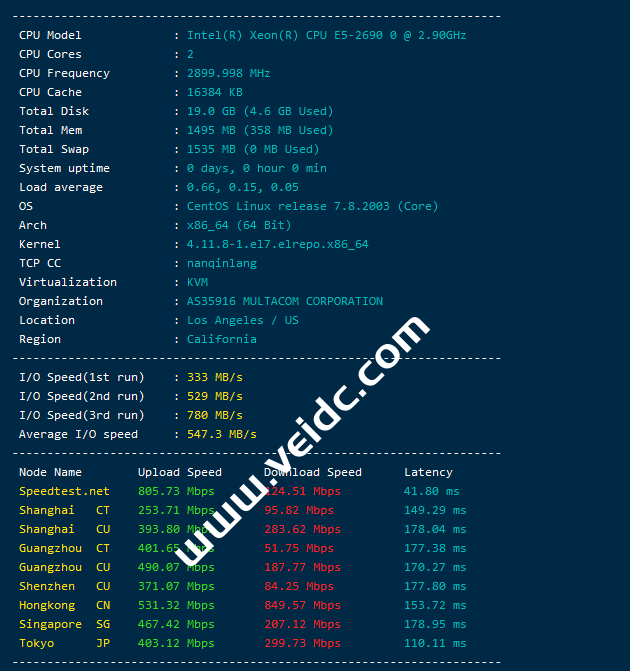 RackNerd前几天发布了最新的中秋促销活动,数据中心位于洛杉矶MC机房,也就是DC02,价格很美丽,但实际情况如何,本文就分享一下最新洛杉矶DC02机房测评数据,包括速度、延迟、丢包率、路由跟踪测试结果信息。测评说明:本站所有测评数据基本都是在安装了BBR和KCPTUN的前提下进行的,站长经常使用的BBR:南琴浪版暴力魔改BBR一键安装脚本 附加速50倍效果图 和 超级加速工具KCPTUN一键安装脚本 附100倍加速效果图。