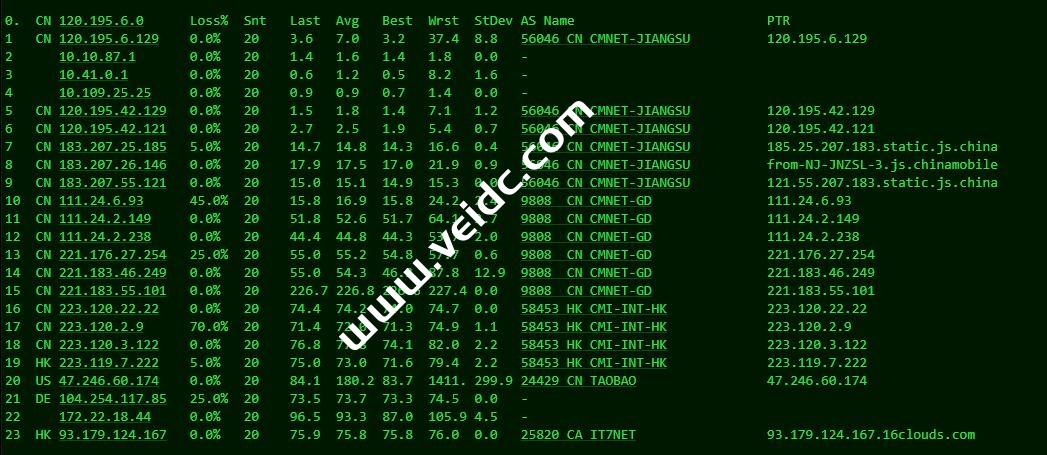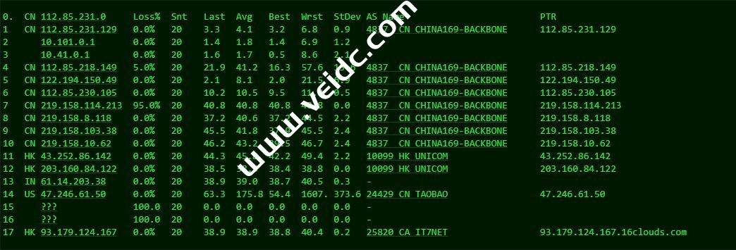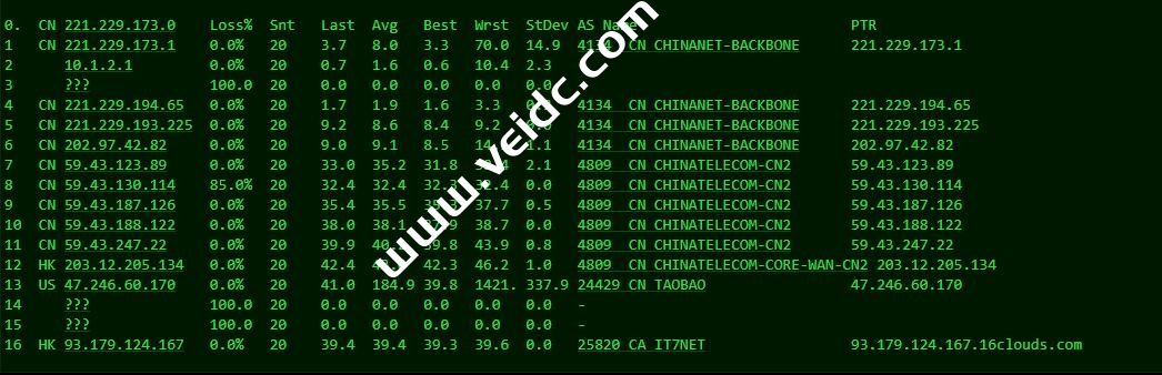 全球PING及丢包率测试:搬瓦工中国香港CN2 GIA机房,也就是HKHK_8机房,从测试结果中来看,这个机房还是非常不错的,整体而言就是,三网速度非常快,三网延迟非常低。