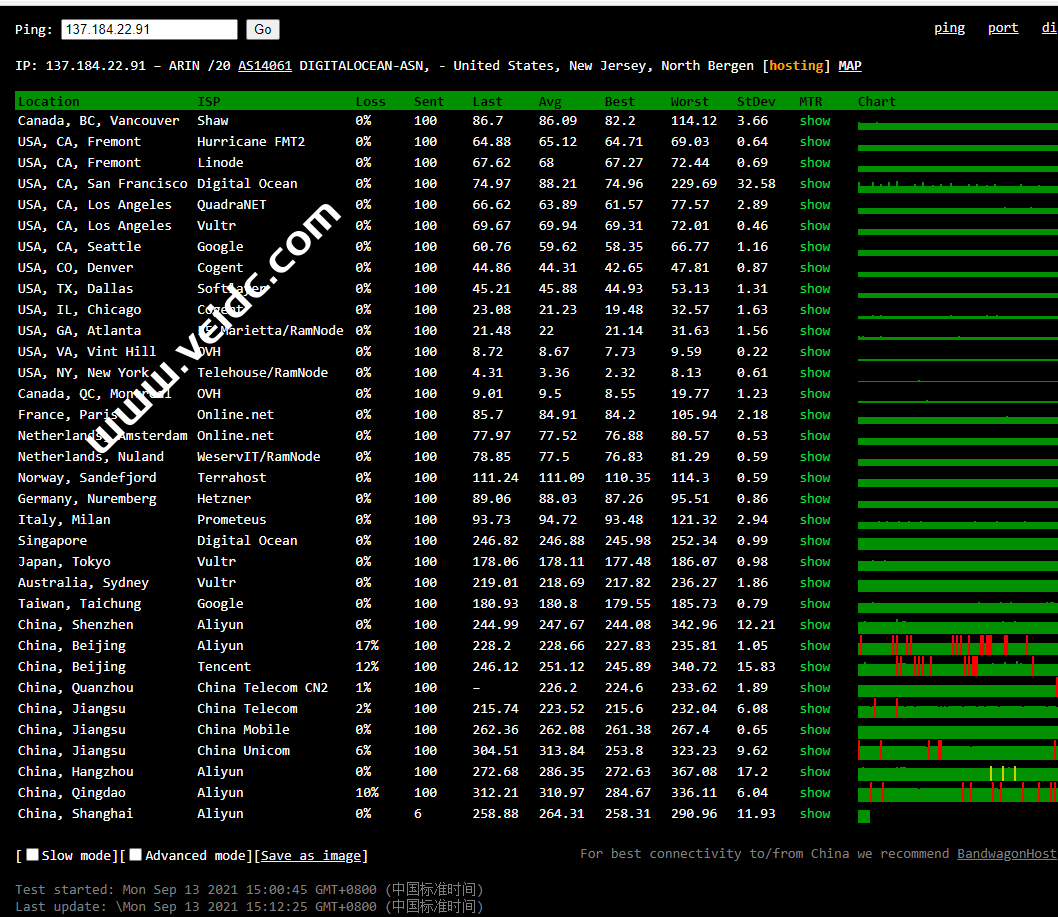 DigitalOcean目前在全球有13个机房,分布在北美、欧洲、亚洲等地区,数据中心覆盖范围没有Vultr广,在纽约和旧金山就多达6个机房,这样的话用户选择起来可能就不是那么方便,本文分享 DigitalOcean 纽约1机房的速度、延迟、丢包率、路由跟踪测试结果信息,以方便用户选择参考。测评说明:DigitalOcean系列测评机器均为AMD高性能平台,1核1G内存25 GB NVMe SSD,月流量1000GB,本站所有测评数据基本都是在安装了BBR的前提下进行的,站长经常使用的BBR:南琴浪版暴力魔改BBR一键安装脚本 附加速50倍效果图 和 超级加速工具KCPTUN一键安装脚本 附100倍加速效果图。