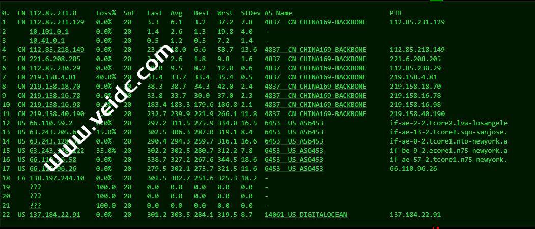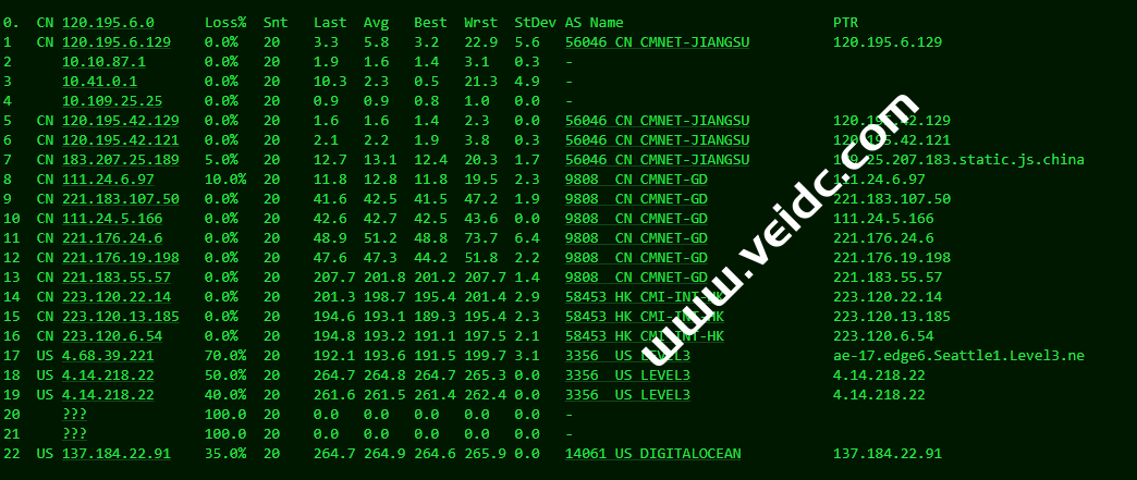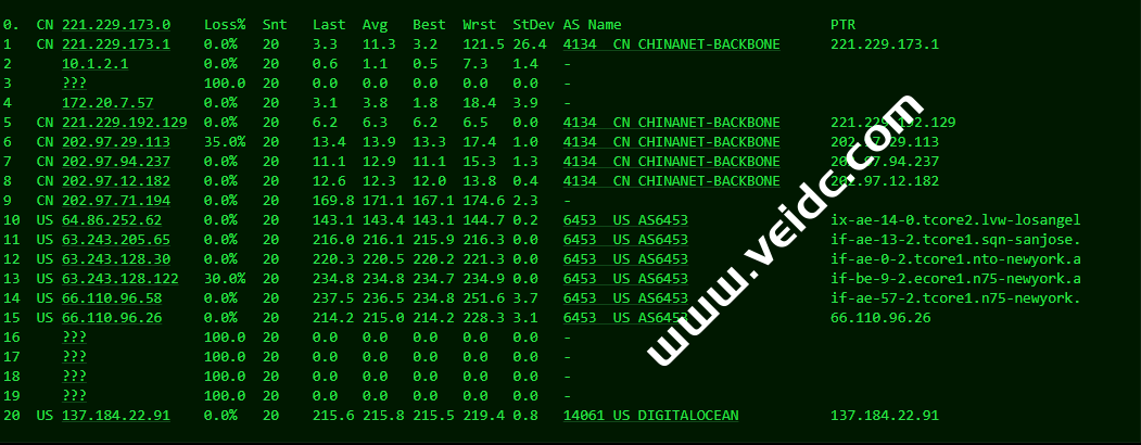 [Info] 测试路由 到 上海电信(天翼云) 中 ... traceroute to 101.227.255.45 (101.227.255.45), 30 hops max, 32 byte packets 1 * 2 10.71.4.80 0.95 ms * 局域网 3 138.197.248.88 1.30 ms * 美国, 纽约州, 纽约, digitalocean.com 4 138.197.251.110 0.37 ms * 美国, 纽约州, 纽约, digitalocean.com 5 * 6 ae-1-9.edge2.SanJose3.Level3.net (4.69.209.181) 69.20 ms AS3356 美国, 加利福尼亚州, 圣何塞, level3.com 7 CHINA-TELEC.edge2.SanJose3.Level3.net (4.53.210.166) 71.43 ms AS3356 美国, 加利福尼亚州, 圣何塞, level3.com 8 202.97.81.105 71.22 ms AS4134 美国, 加利福尼亚州, 圣何塞, chinatelecom.com.cn, 电信 9 202.97.52.249 196.86 ms AS4134 中国, 上海, chinatelecom.com.cn, 电信 10 202.97.12.209 210.29 ms AS4134 中国, 上海, chinatelecom.com.cn, 电信 11 202.97.57.158 199.77 ms AS4134 中国, 上海, chinatelecom.com.cn, 电信 12 61.152.26.1 203.96 ms AS4812 中国, 上海, chinatelecom.com.cn, 电信 13 124.74.166.230 201.40 ms AS4812 中国, 上海, chinatelecom.com.cn, 电信 14 * 15 * 16 * 17 * 18 * 19 * 20 * 21 * 22 * 23 * 24 * 25 * 26 * 27 * 28 * 29 * 30 * [Info] 测试路由 到 上海电信(天翼云) 完成 ! [Info] 测试路由 到 厦门电信CN2 中 ... traceroute to 117.28.254.129 (117.28.254.129), 30 hops max, 32 byte packets 1 * 2 10.71.4.82 1.22 ms * 局域网 3 138.197.248.88 0.92 ms * 美国, 纽约州, 纽约, digitalocean.com 4 138.197.251.118 23.50 ms * 美国, 纽约州, 纽约, digitalocean.com 5 * 6 * 7 CHINA-TELEC.ear2.LosAngeles1.Level3.net (4.71.136.202) 63.05 ms AS3356 美国, 加利福尼亚州, 洛杉矶, level3.com 8 * 9 * 10 * 11 * 12 * 13 27.148.195.2 218.85 ms AS133775 中国, 福建, 厦门, chinatelecom.com.cn, 电信 14 117.25.141.110 222.73 ms AS133775 中国, 福建, 厦门, chinatelecom.com.cn, 电信 15 117.28.254.129 228.70 ms AS4809 中国, 福建, 厦门, chinatelecom.com.cn, 电信 [Info] 测试路由 到 厦门电信CN2 完成 ! [Info] 测试路由 到 浙江杭州联通 中 ... traceroute to 101.71.241.238 (101.71.241.238), 30 hops max, 32 byte packets 1 * 2 10.71.4.94 0.93 ms * 局域网 3 138.197.248.82 0.86 ms * 美国, 纽约州, 纽约, digitalocean.com 4 138.197.251.106 2.48 ms * 美国, 纽约州, 纽约, digitalocean.com 5 138.197.244.11 0.56 ms * 美国, 纽约州, 纽约, digitalocean.com 6 ce-0-12-0-2.r00.nycmny17.us.bb.gin.ntt.net (157.238.179.69) 1.67 ms AS2914 美国, 纽约州, 纽约, ntt.com 7 ae-13.r21.nwrknj03.us.bb.gin.ntt.net (129.250.3.50) 2.23 ms AS2914 美国, 新泽西州, 纽瓦克, ntt.com 8 ae-11.r01.nycmny17.us.bb.gin.ntt.net (129.250.6.97) 1.85 ms AS2914 美国, 纽约州, 纽约, ntt.com 9 xe-11-3-0.BR2.NYC4.ALTER.NET (152.179.72.41) 1.97 ms AS701 美国, 纽约州, 纽约, verizon.com 10 * 11 .48.179.152.in-addr.arpa (152.179.48.174) 322.40 ms AS701 美国, 加利福尼亚州, 圣何塞, verizon.com 12 219.158.116.233 323.23 ms AS4837 中国, 上海, chinaunicom.com, 联通 13 219.158.19.86 268.64 ms AS4837 中国, 上海, chinaunicom.com, 联通 14 219.158.19.81 246.15 ms AS4837 中国, 上海, chinaunicom.com, 联通 15 219.158.106.94 282.53 ms AS4837 中国, 浙江, 杭州, chinaunicom.com, 联通 16 101.71.244.94 298.84 ms AS4837 中国, 浙江, 杭州, chinaunicom.com, 联通 17 * 18 * 19 * 20 * 21 * 22 * 23 * 24 * 25 * 26 * 27 * 28 * 29 * 30 * [Info] 测试路由 到 浙江杭州联通 完成 ! [Info] 测试路由 到 浙江杭州移动 中 ... traceroute to 112.17.0.106 (112.17.0.106), 30 hops max, 32 byte packets 1 * 2 10.71.4.86 2.97 ms * 局域网 3 * 4 138.197.251.118 12.25 ms * 美国, 纽约州, 纽约, digitalocean.com 5 lag-105.ear4.Newark1.Level3.net (4.14.218.21) 6.04 ms AS3356 美国, 新泽西州, 纽瓦克, level3.com 6 ae-2-3615.edge6.Seattle1.Level3.net (4.69.219.210) 74.37 ms AS3356 美国, 华盛顿州, 西雅图, level3.com 7 ChinaMobile-level3-Seattle1.Level3.net (4.68.39.222) 73.27 ms AS3356 美国, 华盛顿州, 西雅图, level3.com 8 223.120.6.53 73.84 ms AS58453 美国, 华盛顿州, 西雅图, chinamobile.com, 移动 9 223.120.22.34 255.85 ms AS58453 中国, 上海, chinamobile.com, 移动 10 221.183.55.46 270.32 ms AS9808 中国, 上海, chinamobile.com, 移动 11 221.183.25.189 322.11 ms AS9808 中国, 上海, chinamobile.com, 移动 12 221.176.17.217 258.62 ms AS9808 中国, 上海, chinamobile.com, 移动 13 111.24.3.81 269.23 ms AS9808 中国, 上海, chinamobile.com, 移动 14 221.183.108.122 264.87 ms AS9808 中国, 浙江, 杭州, chinamobile.com, 移动 15 * 16 112.17.253.110 276.20 ms AS56041 中国, 浙江, 杭州, chinamobile.com, 移动 17 218.205.87.13 259.71 ms AS56041 中国, 浙江, 杭州, chinamobile.com, 移动 18 * 19 * 20 * 21 * 22 * 23 * 24 * 25 * 26 * 27 * 28 * 29 * 30 * [Info] 测试路由 到 浙江杭州移动 完成 ! [Info] 测试路由 到 北京教育网 中 ... traceroute to 202.205.6.30 (202.205.6.30), 30 hops max, 32 byte packets 1 * 2 10.71.4.90 3.79 ms * 局域网 3 138.197.248.82 0.80 ms * 美国, 纽约州, 纽约, digitalocean.com 4 138.197.251.114 0.92 ms * 美国, 纽约州, 纽约, digitalocean.com 5 138.197.244.15 2.18 ms * 美国, 纽约州, 纽约, digitalocean.com 6 ce-0-13-0-2.r01.nycmny17.us.bb.gin.ntt.net (157.238.179.153) 1.65 ms AS2914 美国, 纽约州, 纽约, ntt.com 7 ae-13.r20.nwrknj03.us.bb.gin.ntt.net (129.250.4.40) 2.38 ms AS2914 美国, 新泽西州, 纽瓦克, ntt.com 8 ae-4.r24.sttlwa01.us.bb.gin.ntt.net (129.250.6.177) 62.87 ms AS2914 美国, 华盛顿州, 西雅图, ntt.com 9 ae-0.r25.sttlwa01.us.bb.gin.ntt.net (129.250.3.83) 61.40 ms AS2914 美国, 华盛顿州, 西雅图, ntt.com 10 ae-6.r26.osakjp02.jp.bb.gin.ntt.net (129.250.3.61) 159.42 ms AS2914 日本, 大阪府, 大阪, ntt.com 11 ae-4.r27.tkokhk01.hk.bb.gin.ntt.net (129.250.2.43) 205.20 ms AS2914 中国, 香港, ntt.com 12 ae-0.r26.tkokhk01.hk.bb.gin.ntt.net (129.250.5.28) 193.70 ms AS2914 中国, 香港, ntt.com 13 ae-2.a01.chwahk02.hk.bb.gin.ntt.net (129.250.6.123) 195.37 ms AS2914 中国, 香港, ntt.com 14 2