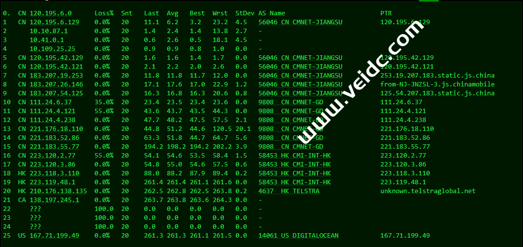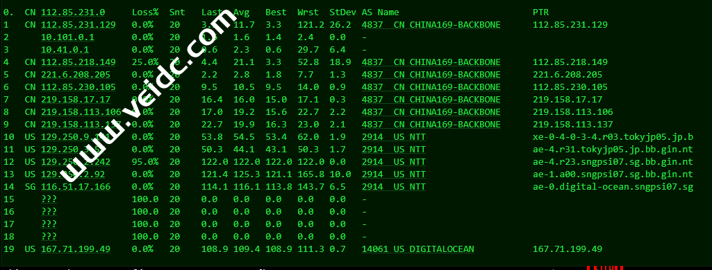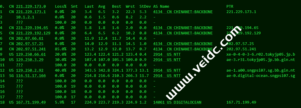 [Info] 测试路由 到 上海电信(天翼云) 中 ... traceroute to 101.227.255.45 (101.227.255.45), 30 hops max, 32 byte packets 1 * 2 10.76.130.94 1.05 ms * 局域网 3 138.197.251.56 1.83 ms * 新加坡, digitalocean.com 4 138.197.251.163 1.22 ms * 新加坡, digitalocean.com 5 138.197.245.4 0.75 ms * 新加坡, digitalocean.com 6 ix-ae-10-0.thar1.svq-singapore.as6453.net (120.29.214.49) 0.90 ms AS6453 新加坡, tatacommunications.com 7 * 8 if-et-24-55.hcore2.kv8-chiba.as6453.net (180.87.12.111) 74.36 ms AS6453 日本, 千叶县, 千叶市, tatacommunications.com 9 if-et-1-2.hcore1.kv8-chiba.as6453.net (120.29.211.2) 70.39 ms AS6453 日本, 千叶县, 千叶市, tatacommunications.com 10 if-ae-5-2.tcore2.sv1-santaclara.as6453.net (209.58.86.142) 170.38 ms AS6453 美国, 加利福尼亚州, 圣克拉拉, tatacommunications.com 11 if-ae-18-2.tcore1.sqn-sanjose.as6453.net (63.243.205.72) 169.65 ms AS6453 美国, 加利福尼亚州, 圣何塞, tatacommunications.com 12 if-ae-1-2.tcore2.sqn-sanjose.as6453.net (63.243.205.2) 169.27 ms AS6453 美国, 加利福尼亚州, 圣何塞, tatacommunications.com 13 218.30.54.244 170.39 ms AS4134 美国, 加利福尼亚州, 圣何塞, chinatelecom.com.cn, 电信 14 202.97.27.209 217.38 ms AS4134 中国, 上海, chinatelecom.com.cn, 电信 15 * 16 202.97.24.229 219.48 ms AS4134 中国, 上海, chinatelecom.com.cn, 电信 17 61.152.25.161 232.00 ms AS4812 中国, 上海, chinatelecom.com.cn, 电信 18 124.74.166.230 221.17 ms AS4812 中国, 上海, chinatelecom.com.cn, 电信 19 * 20 * 21 * 22 * 23 * 24 * 25 * 26 * 27 * 28 * 29 * 30 * [Info] 测试路由 到 上海电信(天翼云) 完成 ! [Info] 测试路由 到 厦门电信CN2 中 ... traceroute to 117.28.254.129 (117.28.254.129), 30 hops max, 32 byte packets 1 * 2 10.76.130.81 1.12 ms * 局域网 3 138.197.251.50 0.88 ms * 新加坡, digitalocean.com 4 138.197.251.173 1.16 ms * 新加坡, digitalocean.com 5 ae19.sg-sin01-edge2.digitalocean.com (138.197.245.14) 0.79 ms * 新加坡, digitalocean.com 6 * 7 * 8 * 9 * 10 * 11 110.80.128.94 89.69 ms AS133775 中国, 福建, 厦门, chinatelecom.com.cn, 电信 12 27.159.81.214 95.18 ms AS133775 中国, 福建, 厦门, chinatelecom.com.cn, 电信 13 117.25.141.106 89.78 ms AS133775 中国, 福建, 厦门, chinatelecom.com.cn, 电信 14 117.28.254.129 57.58 ms AS4809 中国, 福建, 厦门, chinatelecom.com.cn, 电信 [Info] 测试路由 到 厦门电信CN2 完成 ! [Info] 测试路由 到 浙江杭州联通 中 ... traceroute to 101.71.241.238 (101.71.241.238), 30 hops max, 32 byte packets 1 * 2 10.76.130.83 1.42 ms * 局域网 3 138.197.251.52 3.47 ms * 新加坡, digitalocean.com 4 138.197.251.185 0.51 ms * 新加坡, digitalocean.com 5 138.197.245.8 0.86 ms * 新加坡, digitalocean.com 6 ae-2.a01.sngpsi07.sg.bb.gin.ntt.net (116.51.17.193) 12.49 ms AS2914 新加坡, ntt.com 7 * 8 ae-4.r27.osakjp02.jp.bb.gin.ntt.net (129.250.2.67) 66.34 ms AS2914 日本, 大阪府, 大阪, ntt.com 9 ae-2.r02.osakjp02.jp.bb.gin.ntt.net (129.250.2.128) 66.05 ms AS2914 日本, 大阪府, 大阪, ntt.com 10 219.158.39.197 127.23 ms AS4837 中国, 上海, chinaunicom.com, 联通 11 219.158.113.126 127.75 ms AS4837 中国, 上海, chinaunicom.com, 联通 12 219.158.113.105 121.69 ms AS4837 中国, 上海, chinaunicom.com, 联通 13 219.158.15.206 130.17 ms AS4837 中国, 浙江, 杭州, chinaunicom.com, 联通 14 101.71.244.94 127.34 ms AS4837 中国, 浙江, 杭州, chinaunicom.com, 联通 15 * 16 * 17 * 18 * 19 * 20 * 21 * 22 * 23 * 24 * 25 * 26 * 27 * 28 * 29 * 30 * [Info] 测试路由 到 浙江杭州联通 完成 ! [Info] 测试路由 到 浙江杭州移动 中 ... traceroute to 112.17.0.106 (112.17.0.106), 30 hops max, 32 byte packets 1 * 2 10.76.130.83 1.17 ms * 局域网 3 138.197.251.54 1.51 ms * 新加坡, digitalocean.com 4 138.197.251.37 0.62 ms * 新加坡, digitalocean.com 5 138.197.245.6 1.46 ms * 新加坡, digitalocean.com 6 unknown.telstraglobal.net (210.176.138.134) 1.95 ms AS4637 新加坡, telstra.com 7 i-93.sgpl-core02.telstraglobal.net (202.84.224.189) 2.67 ms AS4637 新加坡, telstra.com 8 i-93.sgpl-core02.telstraglobal.net (202.84.224.189) 33.07 ms AS4637 新加坡, telstra.com 9 202.84.249.161 33.74 ms AS4637 中国, 香港, telstra.com 10 202.84.249.161 32.24 ms AS4637 中国, 香港, telstra.com 11 202.84.157.37 31.28 ms AS4637 中国, 香港, telstra.com 12 unknown.telstraglobal.net (210.57.53.53) 33.87 ms AS4637 日本, telstra.com 13 ae22.cr3-lax1.ip4.gtt.net (89.149.181.102) 185.76 ms AS286,AS3257 美国, 加利福尼亚州, 洛杉矶, gtt.net 14 ip4.gtt.net (173.205.45.154) 188.43 ms AS286,AS3257 美国, 加利福尼亚州, 洛杉矶, gtt.net 15 223.120.6.217 185.22 ms AS58453 美国, 加利福尼亚州, 洛杉矶, chinamobile.com, 移动 16 223.120.12.18 218.92 ms AS58453 中国, 上海, chinamobile.com, 移动 17 221.183.55.50 217.92 ms AS9808 中国, 上海, chinamobile.com, 移动 18 221.183.25.193 217.84 ms AS9808 中国, 上海, chinamobile.com, 移动 19 221.176.22.13 219.45 ms AS9808 中国, 上海, chinamobile.com, 移动 20 111.24.3.81 217.88 ms AS9808 中国, 上海, chinamobile.com, 移动 21 111.24.3.30 232.56 ms AS9808 中国, 浙江, 杭州, chinamobile.com, 移动 22 * 23 117.148.185.110 233.09 ms AS56041 中国, 浙江, 杭州, chinamobile.com, 移动 24 218.205.87.13 236.68 ms AS56041 中国, 浙江, 杭州, chinamobile.com, 移动 25 * 26 * 27 * 28 * 29 * 30 * [Info] 测试路由 到 浙江杭州移动 完成 ! [Info] 测试路由 到 北京教育网 中 ... traceroute to 202.205.6.30 (202.205.6.30), 30 hops max, 32 byte packets 1 * 2 10.76.130.94 1.11 ms * 局域网 3 138.197.251.56 9.59 ms * 新加坡, digitalocean.com 4 138.197.251.161 0.62 ms * 新加坡, digitalocean.com 5 138.197.245.8 1.34 ms * 新加坡, digitalocean.com 6 ix-ae-12-0.thar1.svq-singapore.as6453.net (120.29.214.141) 1.47 ms AS6453 新加坡, tatacommunications.com 7 * 8 * 9 if-ae-53-2.tcore2.lvw-losangeles.as6453.net (64.86.252.56) 177.04 ms AS6453 