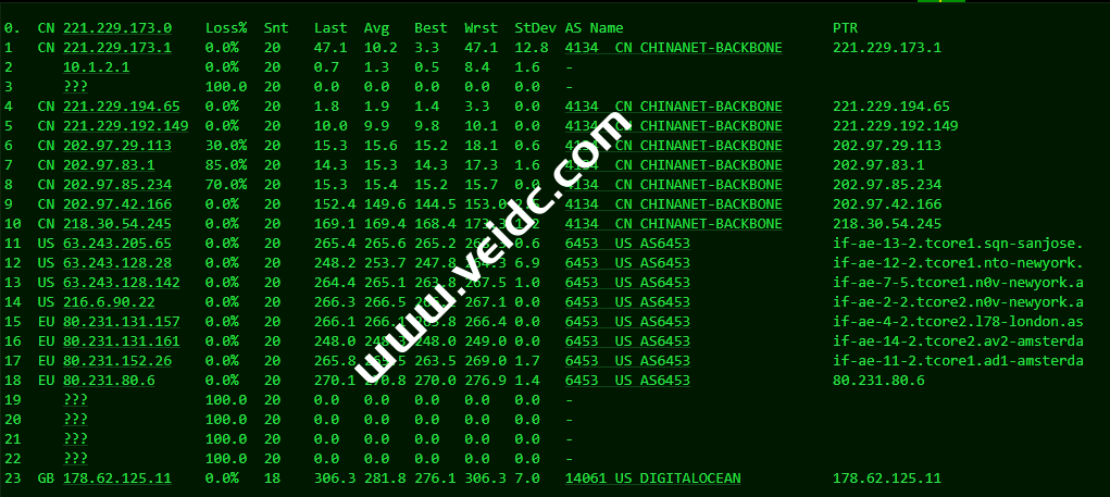 [Info] 测试路由 到 上海电信(天翼云) 中 ... traceroute to 101.227.255.45 (101.227.255.45), 30 hops max, 32 byte packets 1 * 2 10.80.71.214 1.13 ms * 局域网 3 138.197.249.100 1.38 ms * 英国, 伦敦, digitalocean.com 4 138.197.251.136 1.23 ms * 英国, 伦敦, digitalocean.com 5 slou-b1-link.ip.twelve99.net (62.115.44.253) 1.10 ms AS1299 英国, 伯克郡, 斯劳, telia.com 6 ldn-bb4-link.ip.twelve99.net (62.115.117.122) 1.68 ms AS1299 英国, 伦敦, telia.com 7 ldn-b2-link.ip.twelve99.net (62.115.120.239) 1.60 ms AS1299 英国, 伦敦, telia.com 8 chinatelecom-ic335946-ldn-b2.ip.twelve99-cust.net (62.115.14.114) 3.65 ms AS1299 英国, 伦敦, telia.com 9 202.97.93.153 261.98 ms AS4134 中国, 上海, chinatelecom.com.cn, 电信 10 202.97.12.198 277.32 ms AS4134 中国, 上海, chinatelecom.com.cn, 电信 11 202.97.62.101 256.91 ms AS4134 中国, 上海, chinatelecom.com.cn, 电信 12 * 13 101.95.206.10 265.01 ms AS4812 中国, 上海, chinatelecom.com.cn, 电信 14 * 15 * 16 * 17 * 18 * 19 * 20 * 21 * 22 * 23 * 24 * 25 * 26 * 27 * 28 * 29 * 30 * [Info] 测试路由 到 上海电信(天翼云) 完成 ! [Info] 测试路由 到 厦门电信CN2 中 ... traceroute to 117.28.254.129 (117.28.254.129), 30 hops max, 32 byte packets 1 * 2 10.80.71.216 1.03 ms * 局域网 3 138.197.249.124 1.51 ms * 英国, 伦敦, digitalocean.com 4 138.197.251.134 0.55 ms * 英国, 伦敦, digitalocean.com 5 138.197.249.217 1.20 ms * 英国, 伦敦, digitalocean.com 6 195.66.224.177 2.85 ms AS8553 英国, 伦敦, linx.net 7 i-1008.ulcn-core01.telstraglobal.net (202.84.178.13) 2.10 ms AS4637 英国, 伦敦, telstra.com 8 i-1000.sgcn-core01.telstraglobal.net (202.84.140.141) 169.77 ms AS4637 新加坡, telstra.com 9 i-1000.sgcn-core01.telstraglobal.net (202.84.140.141) 169.61 ms AS4637 新加坡, telstra.com 10 i-91.istt04.telstraglobal.net (202.84.224.197) 160.65 ms AS4637 新加坡, telstra.com 11 unknown.telstraglobal.net (210.57.30.130) 181.32 ms AS4637 新加坡, telstra.com 12 * 13 * 14 * 15 * 16 * 17 * 18 117.25.141.110 264.82 ms AS133775 中国, 福建, 厦门, chinatelecom.com.cn, 电信 19 117.28.254.129 204.82 ms AS4809 中国, 福建, 厦门, chinatelecom.com.cn, 电信 [Info] 测试路由 到 厦门电信CN2 完成 ! [Info] 测试路由 到 浙江杭州联通 中 ... traceroute to 101.71.241.238 (101.71.241.238), 30 hops max, 32 byte packets 1 * 2 10.80.71.216 0.77 ms * 局域网 3 138.197.249.116 1.04 ms * 英国, 伦敦, digitalocean.com 4 138.197.251.132 5.86 ms * 英国, 伦敦, digitalocean.com 5 slou-b1-link.ip.twelve99.net (62.115.44.249) 1.10 ms AS1299 英国, 伯克郡, 斯劳, telia.com 6 ldn-bb4-link.ip.twelve99.net (62.115.117.122) 2.10 ms AS1299 英国, 伦敦, telia.com 7 prs-bb2-link.ip.twelve99.net (62.115.114.229) 15.88 ms AS1299 法国, 法兰西岛大区, 巴黎, telia.com 8 ffm-bb2-link.ip.twelve99.net (62.115.122.139) 15.65 ms AS1299 德国, 黑森州, 法兰克福, telia.com 9 ffm-b2-link.ip.twelve99.net (62.115.142.195) 16.22 ms AS1299 德国, 黑森州, 法兰克福, telia.com 10 219.158.33.193 226.50 ms AS4837 德国, 黑森州, 法兰克福, chinaunicom.com, 联通 11 219.158.13.153 233.72 ms AS4837 中国, 广东, 广州, chinaunicom.com, 联通 12 219.158.5.198 257.23 ms AS4837 中国, 上海, chinaunicom.com, 联通 13 219.158.8.185 255.01 ms AS4837 中国, 北京, chinaunicom.com, 联通 14 219.158.7.129 249.45 ms AS4837 中国, 上海, chinaunicom.com, 联通 15 219.158.106.94 260.09 ms AS4837 中国, 浙江, 杭州, chinaunicom.com, 联通 16 101.71.244.90 253.36 ms AS4837 中国, 浙江, 杭州, chinaunicom.com, 联通 17 * 18 * 19 * 20 * 21 * 22 * 23 * 24 * 25 * 26 * 27 * 28 * 29 * 30 * [Info] 测试路由 到 浙江杭州联通 完成 ! [Info] 测试路由 到 浙江杭州移动 中 ... traceroute to 112.17.0.106 (112.17.0.106), 30 hops max, 32 byte packets 1 * 2 10.80.71.210 1.04 ms * 局域网 3 138.197.249.124 1.48 ms * 英国, 伦敦, digitalocean.com 4 138.197.251.142 1.14 ms * 英国, 伦敦, digitalocean.com 5 slou-b1-link.ip.twelve99.net (62.115.44.253) 0.52 ms AS1299 英国, 伯克郡, 斯劳, telia.com 6 chinamobile-ic342125-slou-b1.ip.twelve99-cust.net (62.115.171.223) 2.61 ms AS1299 英国, 伯克郡, 斯劳, telia.com 7 223.120.10.197 1.62 ms AS58453 英国, 伦敦, chinamobile.com, 移动 8 223.120.15.26 243.02 ms AS58453 中国, chinamobile.com, 移动 9 221.183.55.26 237.33 ms AS9808 中国, 上海, chinamobile.com, 移动 10 221.176.22.205 236.19 ms AS9808 中国, 上海, chinamobile.com, 移动 11 221.183.23.25 243.95 ms AS9808 中国, 上海, chinamobile.com, 移动 12 111.24.3.89 276.80 ms AS9808 中国, 上海, chinamobile.com, 移动 13 221.183.108.122 281.86 ms AS9808 中国, 浙江, 杭州, chinamobile.com, 移动 14 * 15 218.205.59.230 242.07 ms AS56041 中国, 浙江, 杭州, chinamobile.com, 移动 16 * 17 * 18 * 19 * 20 * 21 * 22 * 23 * 24 * 25 * 26 * 27 * 28 * 29 * 30 * [Info] 测试路由 到 浙江杭州移动 完成 ! [Info] 测试路由 到 北京教育网 中 ... traceroute to 202.205.6.30 (202.205.6.30), 30 hops max, 32 byte packets 1 * 2 10.80.71.210 0.94 ms * 局域网 3 138.197.249.108 13.77 ms * 英国, 伦敦, digitalocean.com 4 138.197.251.138 0.85 ms * 英国, 伦敦, digitalocean.com 5 195.66.224.177 2.50 ms AS8553 英国, 伦敦, linx.net 6 i-1001.ulhc-core02.telstraglobal.net (202.84.178.70) 2.52 ms AS4637 英国, 伦敦, telstra.com 7 i-1022.ulhc-core02.telstraglobal.net (202.84.141.230) 71.64 ms AS4637 英国, 伦敦, telstra.com 8 i-1022.ny8a-core01.telstraglobal.net (202.84.141.229) 75.07 ms AS4637 美国, 纽约州, 纽约, telstra.com 9 i-10848.eqnx-core02.telstraglobal.net (202.40.148.97) 137.05 ms AS4637 美国, 加利福尼亚州, 圣何塞, reach.com 10 i-10848.eqnx-core02.telstraglobal.net (202.40.148.97) 287.71 ms AS4637 美国, 加利福尼亚州, 圣何塞, reach.com 11 i-15208.hkth-core02.telstraglobal.net (202.84.140.1) 289.22 ms AS4637 中国, 香港, telstra.com 12 i-15208.hkth-core02.tels