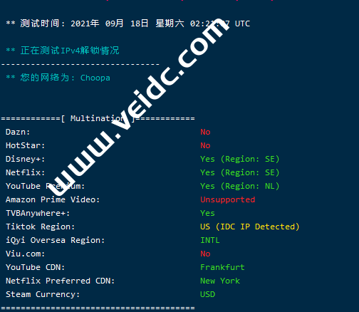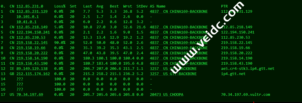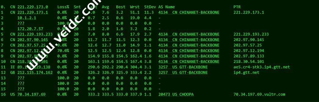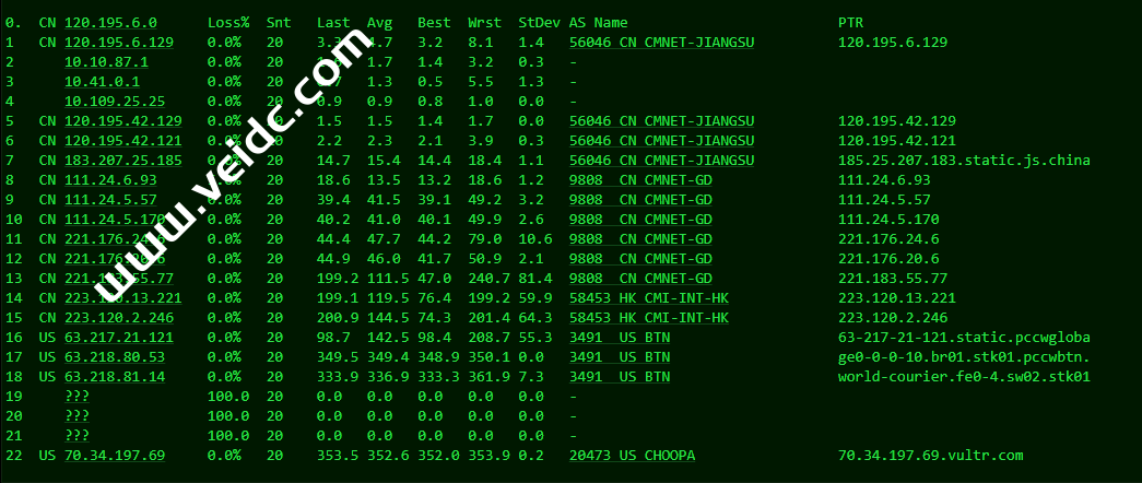 [Info] 测试路由 到 上海电信(天翼云) 中 ... traceroute to 101.227.255.45 (101.227.255.45), 30 hops max, 32 byte packets 1 * 2 * 3 * 4 * 5 fe0-4.sw02.stk01.pccwbtn.net (63.218.81.13) 1.56 ms AS3491,AS31713 瑞典, 斯德哥尔摩省, 斯德哥尔摩, pccw.com 6 HundredGE0-6-0-0.br02.ash02.pccwbtn.net (63.218.218.34) 124.05 ms AS3491,AS31713 美国, 弗吉尼亚州, 阿什本, pccw.com 7 cogent.tenge13-4.br02.ash01.pccwbtn.net (63.218.92.14) 128.29 ms AS3491,AS31713 美国, 弗吉尼亚州, 阿什本, pccw.com 8 202.97.66.237 193.37 ms * 美国, 加利福尼亚州, 洛杉矶, chinatelecom.com.cn, 电信 9 202.97.43.233 318.26 ms AS4134 中国, 上海, chinatelecom.com.cn, 电信 10 202.97.12.193 340.11 ms AS4134 中国, 上海, chinatelecom.com.cn, 电信 11 202.97.24.169 329.45 ms AS4134 中国, 上海, chinatelecom.com.cn, 电信 12 61.152.25.97 319.64 ms AS4812 中国, 上海, chinatelecom.com.cn, 电信 13 124.74.166.126 330.39 ms AS4812 中国, 上海, chinatelecom.com.cn, 电信 14 * 15 * 16 * 17 * 18 * 19 * 20 * 21 * 22 * 23 * 24 * 25 * 26 * 27 * 28 * 29 * 30 * [Info] 测试路由 到 上海电信(天翼云) 完成 ! [Info] 测试路由 到 厦门电信CN2 中 ... traceroute to 117.28.254.129 (117.28.254.129), 30 hops max, 32 byte packets 1 * 2 * 3 * 4 * 5 fe0-4.sw02.stk01.pccwbtn.net (63.218.81.13) 2.06 ms AS3491,AS31713 瑞典, 斯德哥尔摩省, 斯德哥尔摩, pccw.com 6 hu0-0-0-3.br03.frf05.pccwbtn.net (63.218.230.57) 37.21 ms AS3491,AS31713 德国, 黑森州, 法兰克福, pccw.com 7 ffm-b5-link.telia.net (80.239.193.94) 37.08 ms AS1299 德国, 黑森州, 法兰克福, telia.com 8 ffm-bb1-link.ip.twelve99.net (62.115.114.88) 40.80 ms AS1299 德国, 黑森州, 法兰克福, telia.com 9 * 10 ldn-bb1-link.ip.twelve99.net (62.115.135.24) 41.90 ms AS1299 英国, 伦敦, telia.com 11 ldn-b2-link.ip.twelve99.net (62.115.122.189) 40.88 ms AS1299 英国, 伦敦, telia.com 12 chinatelecom-ic335972-ldn-b2.ip.twelve99-cust.net (80.239.193.226) 40.90 ms AS1299 英国, 伦敦, telia.com 13 59.43.246.221 310.88 ms * 中国, 上海, chinatelecom.com.cn, 电信 14 59.43.187.61 306.91 ms * 中国, 上海, chinatelecom.com.cn, 电信 15 59.43.138.53 320.88 ms * 中国, 上海, chinatelecom.com.cn, 电信 16 59.43.138.186 321.84 ms * 中国, 福建, chinatelecom.com.cn, 电信 17 110.80.128.94 279.72 ms AS133775 中国, 福建, 厦门, chinatelecom.com.cn, 电信 18 27.159.81.202 297.65 ms AS133775 中国, 福建, 厦门, chinatelecom.com.cn, 电信 19 117.25.141.110 295.98 ms AS133775 中国, 福建, 厦门, chinatelecom.com.cn, 电信 20 117.28.254.129 323.53 ms AS4809 中国, 福建, 厦门, chinatelecom.com.cn, 电信 [Info] 测试路由 到 厦门电信CN2 完成 ! [Info] 测试路由 到 浙江杭州联通 中 ... traceroute to 101.71.241.238 (101.71.241.238), 30 hops max, 32 byte packets 1 * 2 * 3 * 4 * 5 ip4.gtt.net (212.115.174.161) 0.57 ms AS286,AS3257 英国, interoute.com 6 ae21.cr2-fra6.ip4.gtt.net (213.200.116.225) 29.01 ms AS286,AS3257 德国, 黑森州, 法兰克福, gtt.net 7 219.158.43.189 29.36 ms AS4837 中国, chinaunicom.com, 联通 8 219.158.11.165 181.65 ms AS4837 中国, 广东, 广州, chinaunicom.com, 联通 9 219.158.97.26 184.35 ms AS4837 中国, 广东, 广州, chinaunicom.com, 联通 10 219.158.8.113 186.56 ms AS4837 中国, 广东, 广州, chinaunicom.com, 联通 11 219.158.106.70 204.62 ms AS4837 中国, 浙江, 杭州, chinaunicom.com, 联通 12 101.71.244.94 210.40 ms AS4837 中国, 浙江, 杭州, chinaunicom.com, 联通 13 * 14 * 15 * 16 * 17 * 18 * 19 * 20 * 21 * 22 * 23 * 24 * 25 * 26 * 27 * 28 * 29 * 30 * [Info] 测试路由 到 浙江杭州联通 完成 ! [Info] 测试路由 到 浙江杭州移动 中 ... traceroute to 112.17.0.106 (112.17.0.106), 30 hops max, 32 byte packets 1 * 2 * 3 * 4 * 5 ip4.gtt.net (212.115.174.161) 0.42 ms AS286,AS3257 英国, interoute.com 6 ae22.cr3-lax1.ip4.gtt.net (89.149.181.102) 155.02 ms AS286,AS3257 美国, 加利福尼亚州, 洛杉矶, gtt.net 7 ip4.gtt.net (173.205.45.154) 181.56 ms AS286,AS3257 美国, 加利福尼亚州, 洛杉矶, gtt.net 8 223.120.6.217 181.24 ms AS58453 美国, 加利福尼亚州, 洛杉矶, chinamobile.com, 移动 9 223.120.12.18 342.46 ms AS58453 中国, 上海, chinamobile.com, 移动 10 221.183.55.50 350.82 ms AS9808 中国, 上海, chinamobile.com, 移动 11 221.183.25.193 330.86 ms AS9808 中国, 上海, chinamobile.com, 移动 12 221.183.23.25 333.42 ms AS9808 中国, 上海, chinamobile.com, 移动 13 111.24.17.61 359.37 ms AS9808 中国, 上海, chinamobile.com, 移动 14 221.183.108.122 358.45 ms AS9808 中国, 浙江, 杭州, chinamobile.com, 移动 15 * 16 218.205.59.234 373.83 ms AS56041 中国, 浙江, 杭州, chinamobile.com, 移动 17 * 18 * 19 * 20 * 21 * 22 * 23 * 24 * 25 * 26 * 27 * 28 * 29 * 30 * [Info] 测试路由 到 浙江杭州移动 完成 ! [Info] 测试路由 到 北京教育网 中 ... traceroute to 202.205.6.30 (202.205.6.30), 30 hops max, 32 byte packets 1 * 2 * 3 * 4 * 5 fe0-4.sw02.stk01.pccwbtn.net (63.218.81.13) 1.49 ms AS3491,AS31713 瑞典, 斯德哥尔摩省, 斯德哥尔摩, pccw.com 6 hu0-0-0-3.br03.frf05.pccwbtn.net (63.218.230.57) 37.23 ms AS3491,AS31713 德国, 黑森州, 法兰克福, pccw.com 7 63-218-231-14.static.pccwglobal.net (63.218.231.14) 37.47 ms AS3491,AS31713 德国, 黑森州, 法兰克福, pccw.com 8 ae-2.r21.frnkge13.de.bb.gin.ntt.net (129.250.6.41) 49.37 ms AS2914 德国, 黑森州, 法兰克福, ntt.com 9 ae-12.r21.parsfr04.fr.bb.gin.ntt.net (129.250.5.27) 59.03 ms AS2914 法国, 法兰西岛大区, 巴黎, ntt.com 10 ae-13.r24.asbnva02.us.bb.gin.ntt.net (129.250.6.6) 113.58 ms AS2914 美国, 弗吉尼亚州, 阿什本, ntt.com 11 ae-2.r24.snjsca04.us.bb.gin.ntt.net (129.250.6.237) 172.57 ms AS2914 美国, 加利福尼亚州, 圣何塞, ntt.com 12 ae-5.r26.osakjp02.jp.bb.gin.ntt.net (129.250.2.119) 280.14 ms AS2914 日本, 大阪府, 大阪, ntt.com 13 ae-4.r27.tkokhk01.hk.bb.gin.ntt.net (129.250.2.43) 349.44 ms AS2914 中国, 