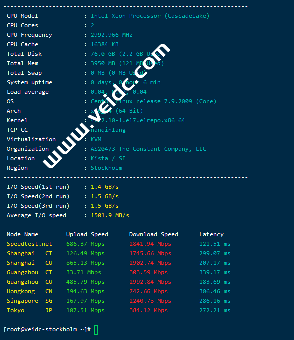 刚刚Vultr宣布在欧洲新增了斯德哥尔摩机房,Vultr目前在全球有18个机房了,分布在北美、欧洲、亚洲、澳大利亚等地区,覆盖范围极广,为了方便广大站长们选择,本文在第一时间开通了一台斯德哥尔摩VPS,测试并分享 Vultr 欧洲斯德哥尔摩机房的速度、延迟、丢包率、路由跟踪测试结果信息。