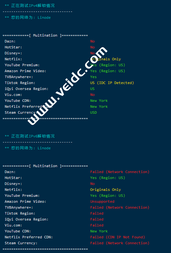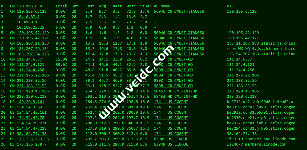 [Info] 测试路由 到 上海电信(天翼云) 中 ... traceroute to 101.227.255.45 (101.227.255.45), 30 hops max, 32 byte packets 1 router2-nac.linode.com (207.99.1.14) 0.67 ms AS8001 美国, 新泽西州, 锡达诺尔斯, cologix.com 2 if-0-0-0-1-0.gw2.cjj1.us.linode.com (173.255.239.6) 0.39 ms AS63949 美国, 新泽西州, 纽瓦克, linode.com 3 hu0-3-0-4.ccr31.jfk05.atlas.cogentco.com (38.104.75.137) 1.85 ms AS174 美国, 纽约州, 纽约, cogentco.com 4 be3294.ccr41.jfk02.atlas.cogentco.com (154.54.47.217) 1.72 ms AS174 美国, 纽约州, 纽约, cogentco.com 5 be2317.ccr41.lon13.atlas.cogentco.com (154.54.30.186) 67.90 ms AS174 英国, 伦敦, cogentco.com 6 be2375.rcr21.b015533-1.lon13.atlas.cogentco.com (154.54.61.158) 68.09 ms AS174 英国, 伦敦, cogentco.com 7 * 8 202.97.93.153 294.63 ms AS4134 中国, 上海, chinatelecom.com.cn, 电信 9 202.97.12.189 277.05 ms AS4134 中国, 上海, chinatelecom.com.cn, 电信 10 202.97.57.26 252.35 ms AS4134 中国, 上海, chinatelecom.com.cn, 电信 11 61.152.25.9 289.32 ms AS4812 中国, 上海, chinatelecom.com.cn, 电信 12 * 13 * 14 * 15 * 16 * 17 * 18 * 19 * 20 * 21 * 22 * 23 * 24 * 25 * 26 * 27 * 28 * 29 * 30 * [Info] 测试路由 到 上海电信(天翼云) 完成 ! [Info] 测试路由 到 厦门电信CN2 中 ... traceroute to 117.28.254.129 (117.28.254.129), 30 hops max, 32 byte packets 1 router1-nac.linode.com (207.99.1.13) 1.05 ms AS8001 美国, 新泽西州, 锡达诺尔斯, cologix.com 2 if-11-1-0-0-0.gw1.cjj1.us.linode.com (173.255.239.10) 0.48 ms AS63949 美国, 新泽西州, 纽瓦克, linode.com 3 nyk-b2-link.ip.twelve99.net (62.115.172.130) 1.04 ms AS1299 美国, 纽约州, 纽约, telia.com 4 nyk-bb3-link.ip.twelve99.net (213.155.130.29) 70.65 ms AS1299 美国, 纽约州, 纽约, telia.com 5 sjo-b1-link.ip.twelve99.net (62.115.125.161) 71.10 ms AS1299 美国, 加利福尼亚州, 圣何塞, telia.com 6 sjo-b1-link.ip.twelve99.net (62.115.125.161) 70.94 ms AS1299 美国, 加利福尼亚州, 圣何塞, telia.com 7 chinatelecom-ic307264-sjo-b21.ip.twelve99-cust.net (80.239.132.158) 71.17 ms AS1299 美国, 加利福尼亚州, 圣何塞, telia.com 8 59.43.182.146 218.24 ms * 中国, 上海, chinatelecom.com.cn, 电信 9 59.43.246.213 214.63 ms * 中国, 上海, chinatelecom.com.cn, 电信 10 59.43.130.209 218.10 ms * 中国, 上海, chinatelecom.com.cn, 电信 11 59.43.138.186 238.97 ms * 中国, 福建, chinatelecom.com.cn, 电信 12 * 13 27.148.195.90 244.47 ms AS133775 中国, 福建, 厦门, chinatelecom.com.cn, 电信 14 117.25.141.106 233.21 ms AS133775 中国, 福建, 厦门, chinatelecom.com.cn, 电信 15 117.28.254.129 242.76 ms AS4809 中国, 福建, 厦门, chinatelecom.com.cn, 电信 [Info] 测试路由 到 厦门电信CN2 完成 ! [Info] 测试路由 到 浙江杭州联通 中 ... traceroute to 101.71.241.238 (101.71.241.238), 30 hops max, 32 byte packets 1 router2-nac.linode.com (207.99.1.14) 2.46 ms AS8001 美国, 新泽西州, 锡达诺尔斯, cologix.com 2 if-11-1-0-1-0.gw2.cjj1.us.linode.com (173.255.239.16) 5.59 ms AS63949 美国, 新泽西州, 纽瓦克, linode.com 3 et-0-0-29.cr3-nyc3.ip4.gtt.net (173.205.38.197) 1.41 ms AS286,AS3257 美国, 纽约州, 纽约, gtt.net 4 ae2.cr5-sjc1.ip4.gtt.net (89.149.180.26) 107.67 ms AS286,AS3257 美国, 加利福尼亚州, 圣何塞, gtt.net 5 as4837.sjc10.ip4.gtt.net (173.205.56.142) 227.99 ms AS286,AS3257 美国, 加利福尼亚州, 圣何塞, gtt.net 6 219.158.116.253 210.83 ms AS4837 中国, 上海, chinaunicom.com, 联通 7 219.158.19.78 214.64 ms AS4837 中国, 上海, chinaunicom.com, 联通 8 219.158.19.81 221.95 ms AS4837 中国, 上海, chinaunicom.com, 联通 9 219.158.15.206 220.99 ms AS4837 中国, 浙江, 杭州, chinaunicom.com, 联通 10 101.71.244.90 220.04 ms AS4837 中国, 浙江, 杭州, chinaunicom.com, 联通 11 * 12 * 13 * 14 * 15 * 16 * 17 * 18 * 19 * 20 * 21 * 22 * 23 * 24 * 25 * 26 * 27 * 28 * 29 * 30 * [Info] 测试路由 到 浙江杭州联通 完成 ! [Info] 测试路由 到 浙江杭州移动 中 ... traceroute to 112.17.0.106 (112.17.0.106), 30 hops max, 32 byte packets 1 router2-nac.linode.com (207.99.1.14) 0.53 ms AS8001 美国, 新泽西州, 锡达诺尔斯, cologix.com 2 if-0-1-0-1-0.gw1.cjj1.us.linode.com (173.255.239.20) 10.92 ms AS63949 美国, 新泽西州, 纽瓦克, linode.com 3 Unassigned230.nyiix.net (198.32.160.230) 62.33 ms AS52320 美国, 纽约州, 纽约, nyiix.net 4 223.118.10.110 85.10 ms AS58453 加拿大, 安大略省, 多伦多, chinamobile.com, 移动 5 223.118.12.121 91.37 ms AS58453 美国, chinamobile.com, 移动 6 223.118.12.66 84.59 ms AS58453 美国, chinamobile.com, 移动 7 221.183.30.173 267.33 ms AS9808 中国, chinamobile.com, 移动 8 221.183.25.122 238.01 ms AS9808 中国, 广东, 广州, chinamobile.com, 移动 9 221.176.18.109 238.03 ms AS9808 中国, 广东, 广州, chinamobile.com, 移动 10 111.24.4.237 271.50 ms AS9808 中国, 广东, 广州, chinamobile.com, 移动 11 221.176.15.130 265.84 ms AS9808 中国, 浙江, 杭州, chinamobile.com, 移动 12 * 13 218.205.58.190 266.16 ms AS56041 中国, 浙江, 杭州, chinamobile.com, 移动 14 218.205.87.13 268.13 ms AS56041 中国, 浙江, 杭州, chinamobile.com, 移动 15 * 16 * 17 * 18 * 19 * 20 * 21 * 22 * 23 * 24 * 25 * 26 * 27 * 28 * 29 * 30 * [Info] 测试路由 到 浙江杭州移动 完成 ! [Info] 测试路由 到 北京教育网 中 ... traceroute to 202.205.6.30 (202.205.6.30), 30 hops max, 32 byte packets 1 router2-nac.linode.com (207.99.1.14) 2.20 ms AS8001 美国, 新泽西州, 锡达诺尔斯, cologix.com 2 if-11-1-0-1-0.gw2.cjj1.us.linode.com (173.255.239.16) 0.61 ms AS63949 美国, 新泽西州, 纽瓦克, linode.com 3 199.245.16.77 1.82 ms AS2914 美国, 新泽西州, 纽瓦克, ntt.com 4 ae-2.r20.nwrknj03.us.bb.gin.ntt.net (129.250.6.80) 1.79 ms AS2914 美国, 新泽西州, 纽瓦克, ntt.com 5 ae-4.r24.sttlwa01.us.bb.gin.ntt.net (129.250.6.177) 61.89 ms AS2914 美国, 华盛顿州, 西雅图, ntt.com 6 ae-13.r30.tokyjp05.jp.bb