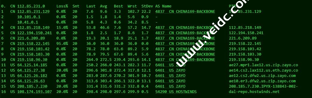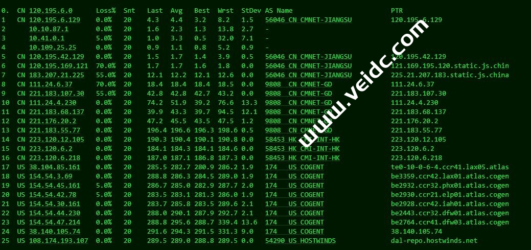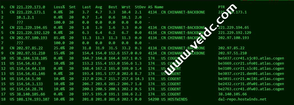 Traceroute to China, Beijing CT (TCP Mode, Max 30 Hop) ============================================================ traceroute to 180.149.128.9 (180.149.128.9), 30 hops max, 32 byte packets 1 10.5.0.1 0.49 ms * LAN Address 2 38.140.119.241 1.04 ms AS174 United States, Texas, Dallas, cogentco.com 3 129.250.4.169 1.31 ms AS2914 United States, Texas, Dallas, ntt.com 4 * 5 154.54.29.222 22.21 ms AS174 COGENTCO.COM BACKBONE, cogentco.com 6 129.250.9.74 45.43 ms AS2914 United States, California, San Jose, ntt.com 7 202.97.50.53 49.33 ms AS4134 United States, California, San Jose, ChinaTelecom 8 202.97.59.141 227.73 ms AS4134 China, Beijing, ChinaTelecom 9 38.142.238.34 45.78 ms AS174 United States, California, Los Angeles, cogentco.com 10 * 11 202.97.59.141 236.60 ms AS4134 China, Beijing, ChinaTelecom 12 * 13 180.149.128.9 234.67 ms AS23724 China, Beijing, ChinaTelecom Traceroute to China, Shanghai CT (TCP Mode, Max 30 Hop) ============================================================ traceroute to 180.153.28.5 (180.153.28.5), 30 hops max, 32 byte packets 1 10.5.0.1 0.32 ms * LAN Address 2 128.241.1.225 0.59 ms AS2914 United States, Texas, Dallas, ntt.com 3 154.54.87.6 5.64 ms AS174 United States, Texas, Dallas, cogentco.com 4 129.250.4.154 41.78 ms AS2914 United States, California, San Jose, ntt.com 5 129.250.3.163 43.39 ms AS2914 NTT.COM BACKBONE, ntt.com 6 129.250.9.74 52.34 ms AS2914 United States, California, San Jose, ntt.com 7 154.54.45.162 42.05 ms AS174 United States, California, Los Angeles, cogentco.com 8 * 9 38.142.238.34 48.08 ms AS174 United States, California, Los Angeles, cogentco.com 10 202.97.50.25 40.93 ms AS4134 United States, California, Los Angeles, ChinaTelecom 11 61.152.24.13 248.12 ms AS4812 China, Shanghai, ChinaTelecom 12 * 13 * 14 101.227.255.46 260.75 ms AS4812 China, Shanghai, ChinaTelecom 15 180.153.28.5 262.93 ms AS4812 China, Shanghai, ChinaTelecom Traceroute to China, Guangzhou CT (TCP Mode, Max 30 Hop) ============================================================ traceroute to 113.108.209.1 (113.108.209.1), 30 hops max, 32 byte packets 1 10.5.0.1 0.28 ms * LAN Address 2 128.241.1.225 0.56 ms AS2914 United States, Texas, Dallas, ntt.com 3 129.250.4.201 1.27 ms AS2914 United States, Texas, Dallas, ntt.com 4 154.54.41.65 6.27 ms AS174 United States, Texas, Dallas, cogentco.com 5 129.250.2.104 30.87 ms AS2914 NTT.COM BACKBONE, ntt.com 6 218.30.53.108 36.37 ms AS4134 United States, California, Los Angeles, ChinaTelecom 7 202.97.50.25 32.72 ms AS4134 United States, California, Los Angeles, ChinaTelecom 8 154.54.25.150 42.18 ms AS174 United States, California, Los Angeles, cogentco.com 9 202.97.94.117 244.31 ms AS4134 China, Guangdong, Guangzhou, ChinaTelecom 10 202.97.50.25 41.70 ms AS4134 United States, California, Los Angeles, ChinaTelecom 11 113.96.0.93 261.44 ms AS58466 China, Guangdong, Guangzhou, ChinaTelecom 12 113.108.209.1 257.60 ms AS58466 China, Guangdong, Guangzhou, ChinaTelecom Traceroute to China, Guangzhou CM (TCP Mode, Max 30 Hop) ============================================================ traceroute to 120.196.212.25 (120.196.212.25), 30 hops max, 32 byte packets 1 10.5.0.1 0.40 ms * LAN Address 2 38.140.119.241 1.37 ms AS174 United States, Texas, Dallas, cogentco.com 3 154.54.47.106 1.32 ms AS174 United States, Texas, Dallas, cogentco.com 4 * 5 154.54.29.222 22.19 ms AS174 COGENTCO.COM BACKBONE, cogentco.com 6 * 7 154.54.45.162 41.62 ms AS174 United States, California, Los Angeles, cogentco.com 8 * 9 223.120.2.53 191.70 ms AS58453 China, Hong Kong, ChinaMobile 10 * 11 221.183.55.86 194.38 ms AS9808 China, Guangdong, Guangzhou, ChinaMobile 12 221.183.52.85 201.39 ms AS9808 China, Guangdong, Guangzhou, ChinaMobile 13 221.183.68.138 198.72 ms AS9808 China, Guangdong, Guangzhou, ChinaMobile Traceroute to China, Shanghai CM (TCP Mode, Max 30 Hop) ============================================================ traceroute to 221.183.55.22 (221.183.55.22), 30 hops max, 32 byte packets 1 10.5.0.1 0.30 ms * LAN Address 2 38.140.119.241 1.00 ms AS174 United States, Texas, Dallas, cogentco.com 3 129.250.4.201 1.61 ms AS2914 United States, Texas, Dallas, ntt.com 4 129.250.4.154 39.51 ms AS2914 United States, California, San Jose, ntt.com 5 154.54.31.89 22.70 ms AS174 COGENTCO.COM BACKBONE, cogentco.com 6 154.54.42.97 34.72 ms AS174 United States, Utah, Salt Lake City, cogentco.com 7 129.250.6.123 190.81 ms AS2914 China, Hong Kong, ntt.com 8 * 9 223.118.3.249 193.17 ms AS58453 China, Hong Kong, ChinaMobile 10 223.120.2.41 186.19 ms AS58453 China, Hong Kong, ChinaMobile 11 * 12 * 13 * 14 * Traceroute to China, Beijing CM (TCP Mode, Max 30 Hop) ============================================================ traceroute to 211.136.25.153 (211.136.25.153), 30 hops max, 32 byte packets 1 10.5.0.1 3.00 ms * LAN Address 2 23.238.104.130 0.34 ms AS54290 United States, Texas, Dallas, hostwinds.com 3 128.241.1.225 0.58 ms AS2914 United States, Texas, Dallas, ntt.com 4 129.250.4.201 1.11 ms AS2914 United States, Texas, Dallas, ntt.com 5 129.250.4.154 43.78 ms AS2914 United States, California, San Jose, ntt.com 6 129.250.5.77 147.67 ms AS2914 Japan, Tokyo, ntt.com 7 129.250.2.51 192.77 ms AS2914 China, Hong Kong, ntt.com 8 * 9 * 10 * 11 * 12 * 13 * 14 * 15 221.176.27.253 232.74 ms AS9808 China, Beijing, ChinaMobile 16 111.24.2.249 232.06 ms AS9808 China, Beijing, ChinaMobile 17 * 18 * 19 211.136.95.226 233.30 ms AS56048 China, Beijing, ChinaMobile 20 211.136.95.226 242.82 ms AS56048 China, Beijing, ChinaMobile 21 * 22 * 23 * 24 211.136.25.153 245.69 ms AS56048 China, Beijing, ChinaMobile Traceroute to China, Guangzhou CU (TCP Mode, Max 30 Hop) ============================================================ traceroute to 210.21.4.130 (210.21.4.130), 30 hops max, 32 byte packets 1 10.5.0.1 0.35 ms * LAN Address 2 128.241.1.225 0.80 ms AS2914 United States, Texas, Dallas, ntt.com 3 129.250.4.201 4.68 ms AS2914 United States, Texas, Dallas, ntt.com 4 154.54.44.229 6.42 ms AS174 United S