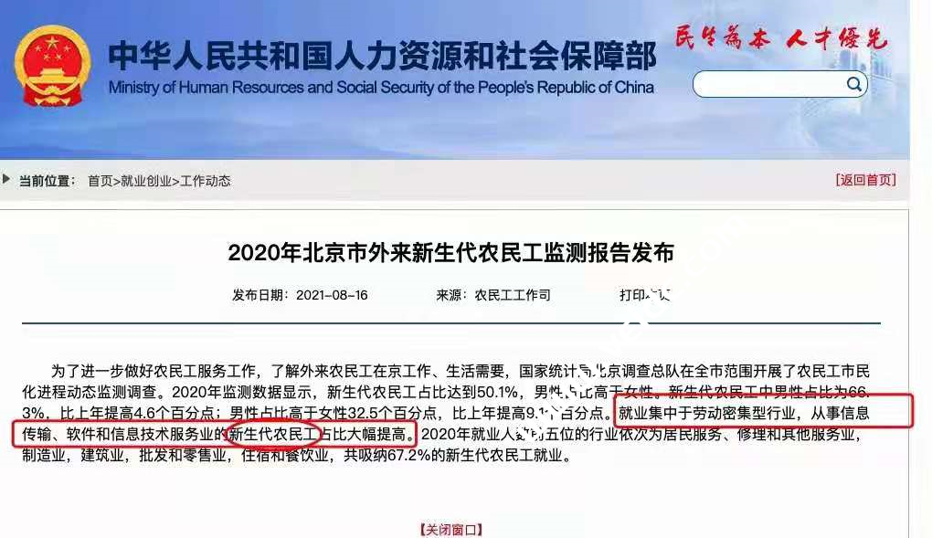 据人社部网站,国家统计局北京调查总队在全市范围开展了农民工市民化进程动态监测调查。2020年监测数据显示,新生代农民工占比达到50.1%,男性占比高于女性。新生代农民工中男性占比为66.3%,比上年提高4.6个百分点;男性占比高于女性32.5个百分点,比上年提高9.1个百分点。就业集中于劳动密集型行业,从事信息传输、软件和信息技术服务业的新生代农民工占比大幅提高。