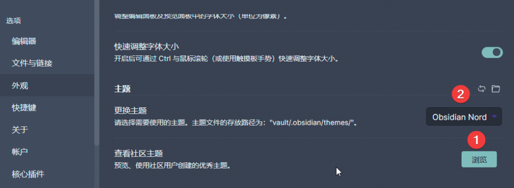 如果您不喜欢Obsidian默认主题,可以打开设置 – 外观主题 – 查看社区主题,并进行设置,如下图。
